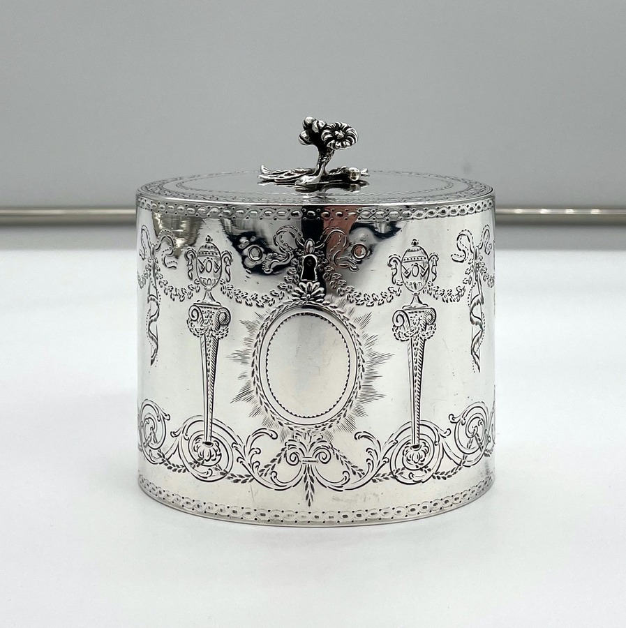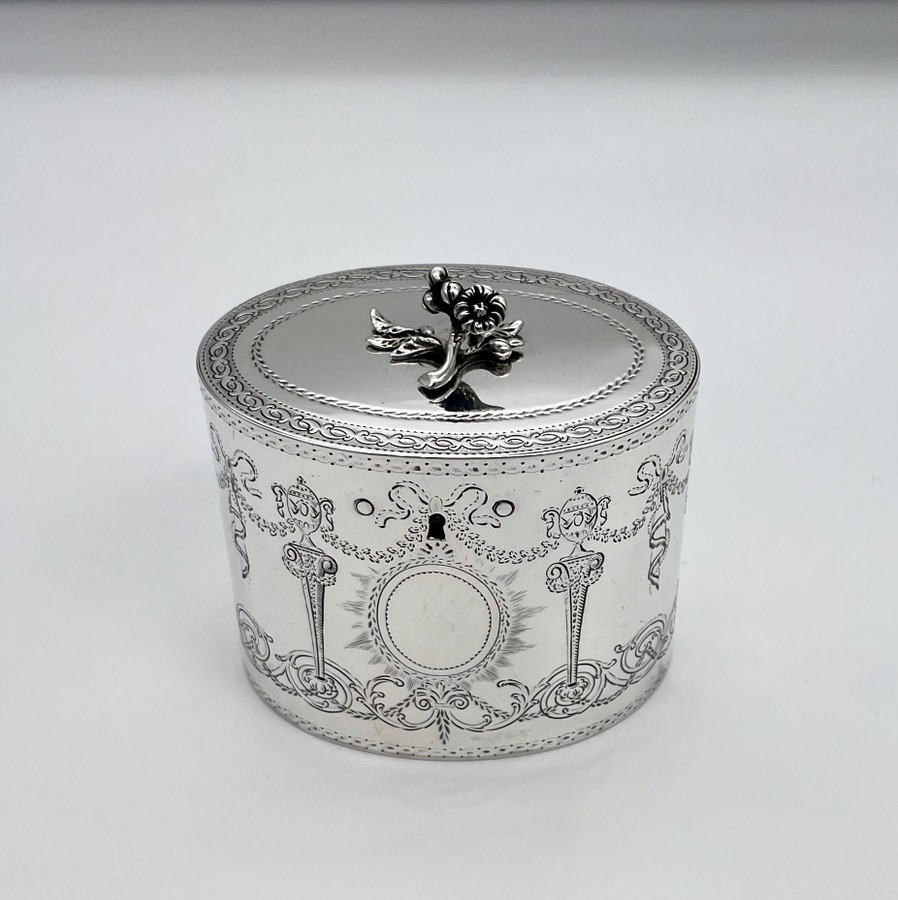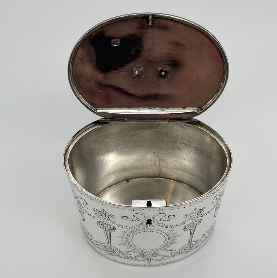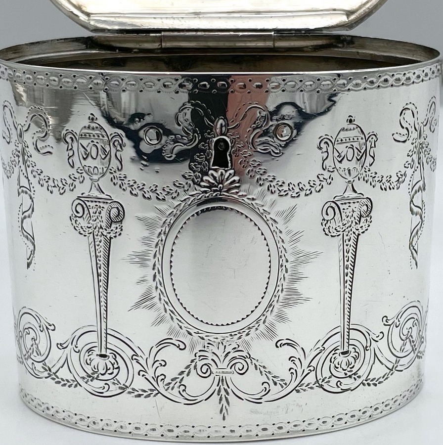 A beautiful Georgian silver flush hinged oval tea caddy decorated with fabulous contemporary bright cut hand engraving depicting wonderful floral designs and incredibly rare motifs of urns on raised pedestal stands. The caddy has a double additonal bright cut engraved cartouches.