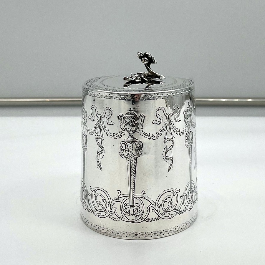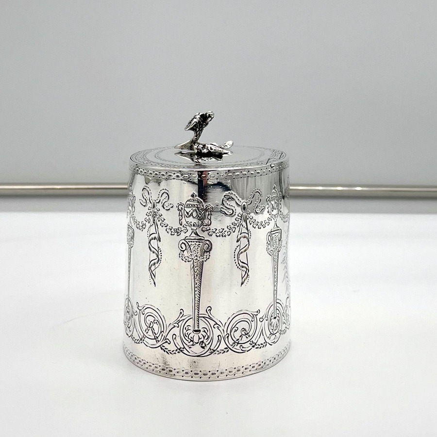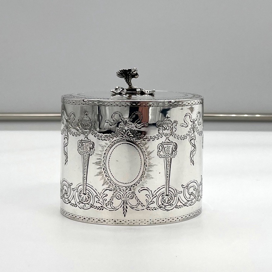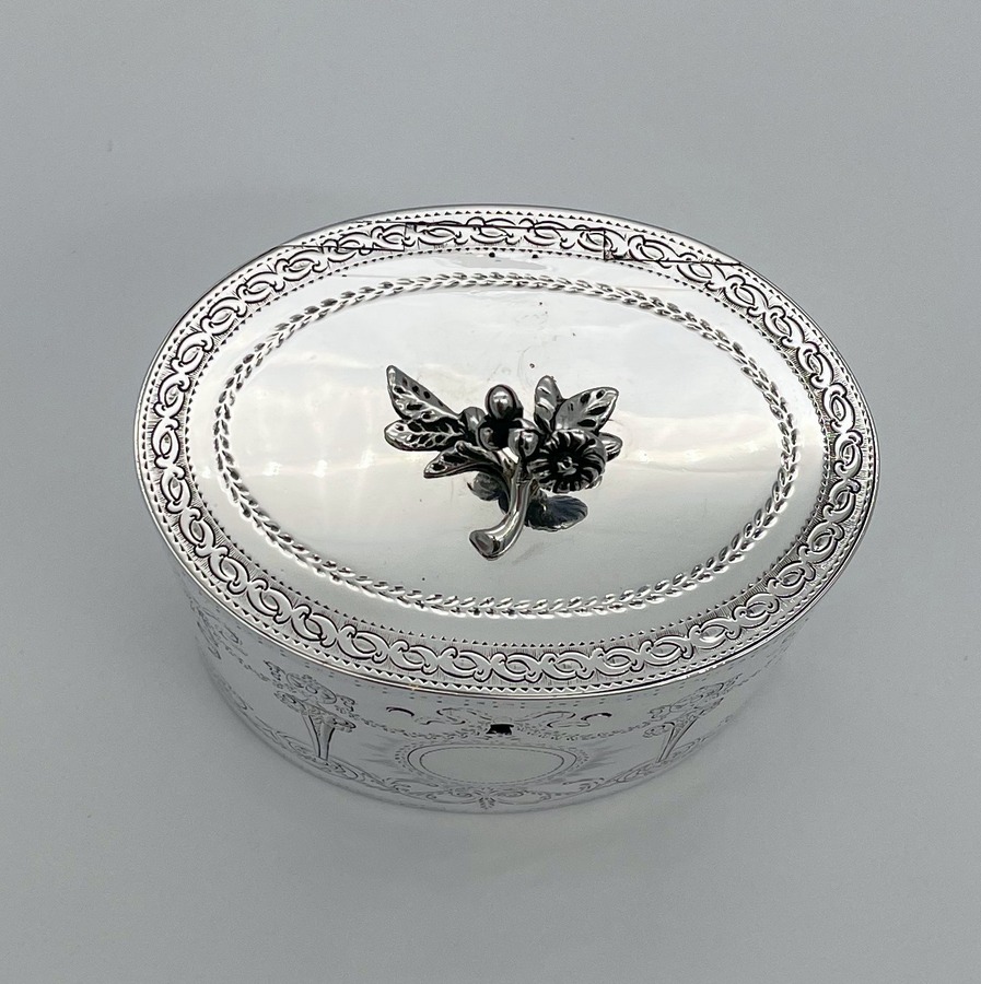 A beautiful Georgian silver flush hinged oval tea caddy decorated with fabulous contemporary bright cut hand engraving depicting wonderful floral designs and incredibly rare motifs of urns on raised pedestal stands. The caddy has a double additonal bright cut engraved cartouches.