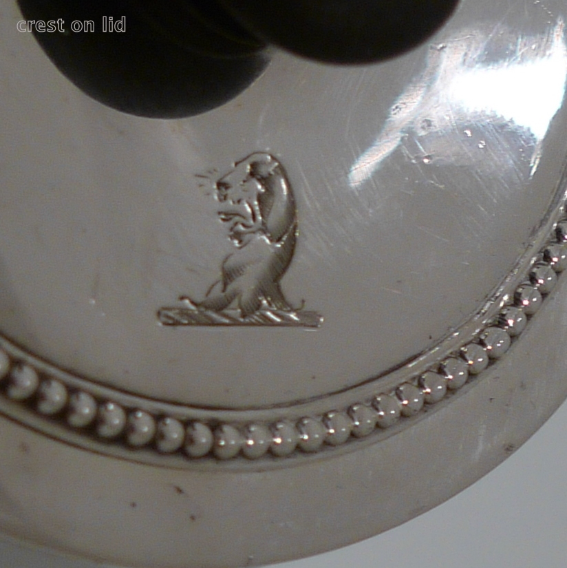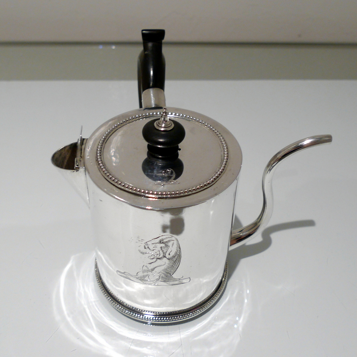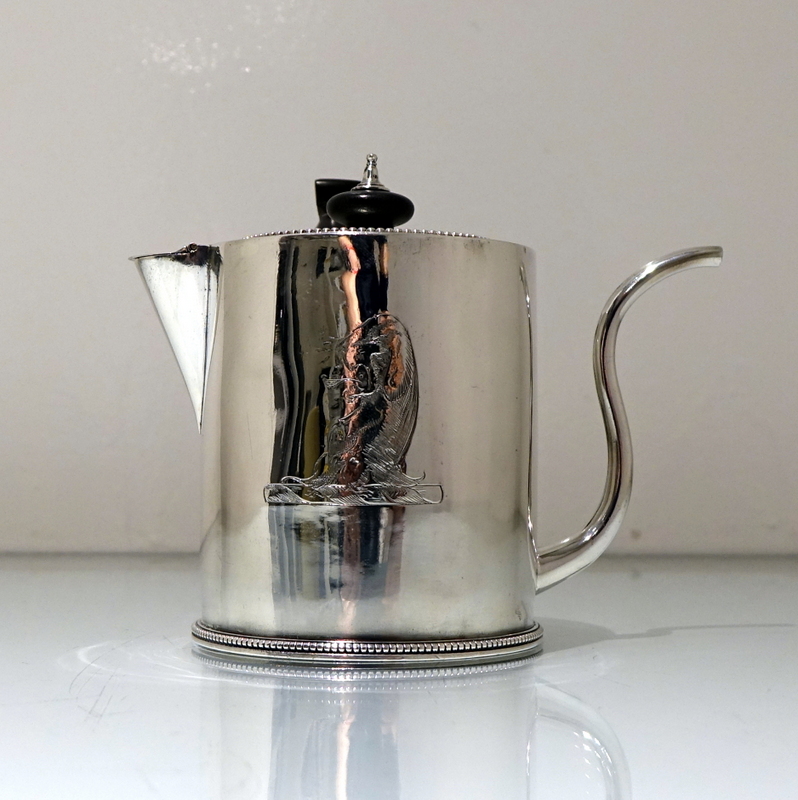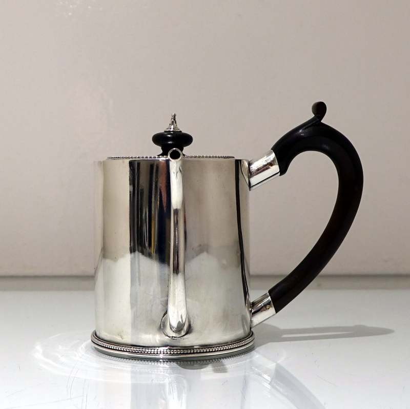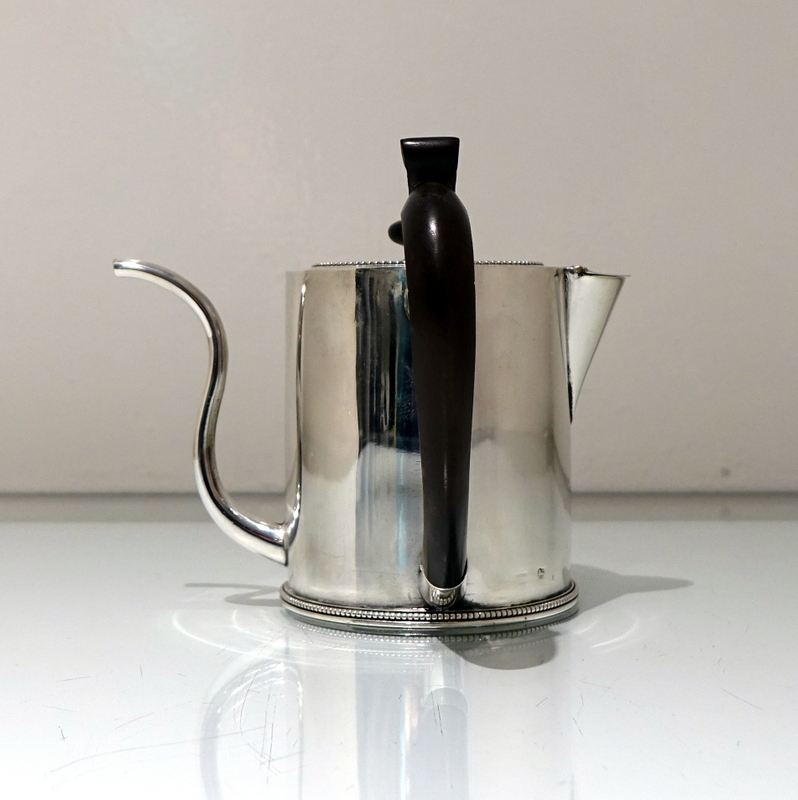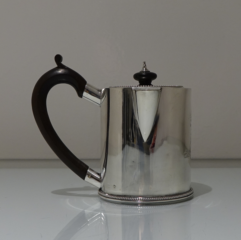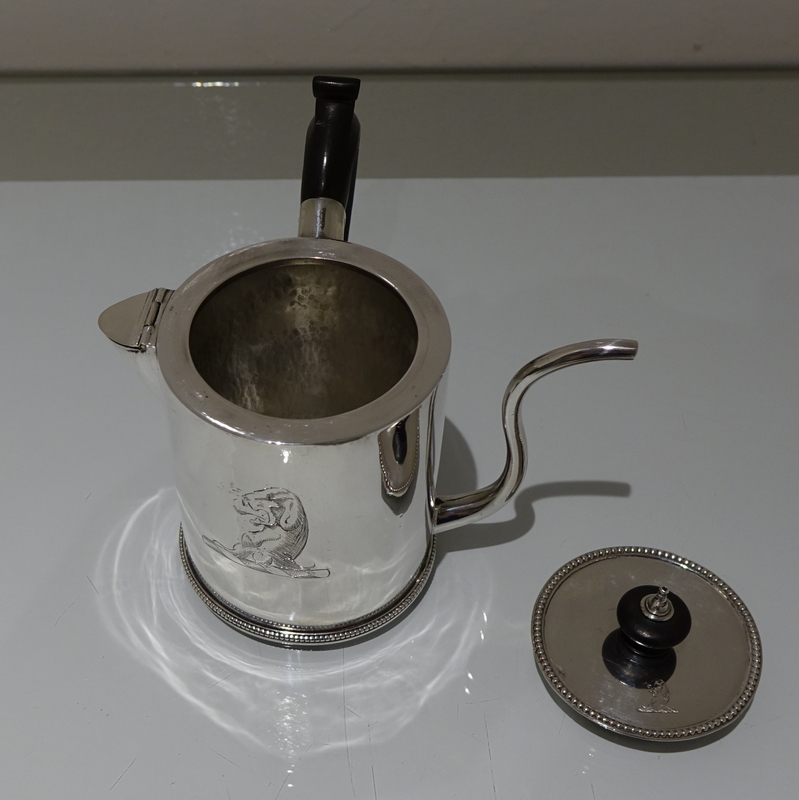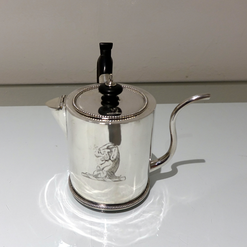 A truly magnificent bead bordered plain formed Georgian silver “drum” shaped argyle with a stylish tubed swan neck spout for decorative design. Â The detachable lid and centre front of the body have stylish contemporary crests for importance. Â The scroll formed handle and finial is made out of fruitwood.