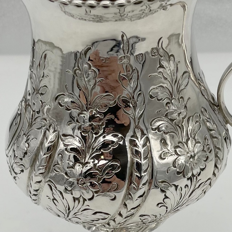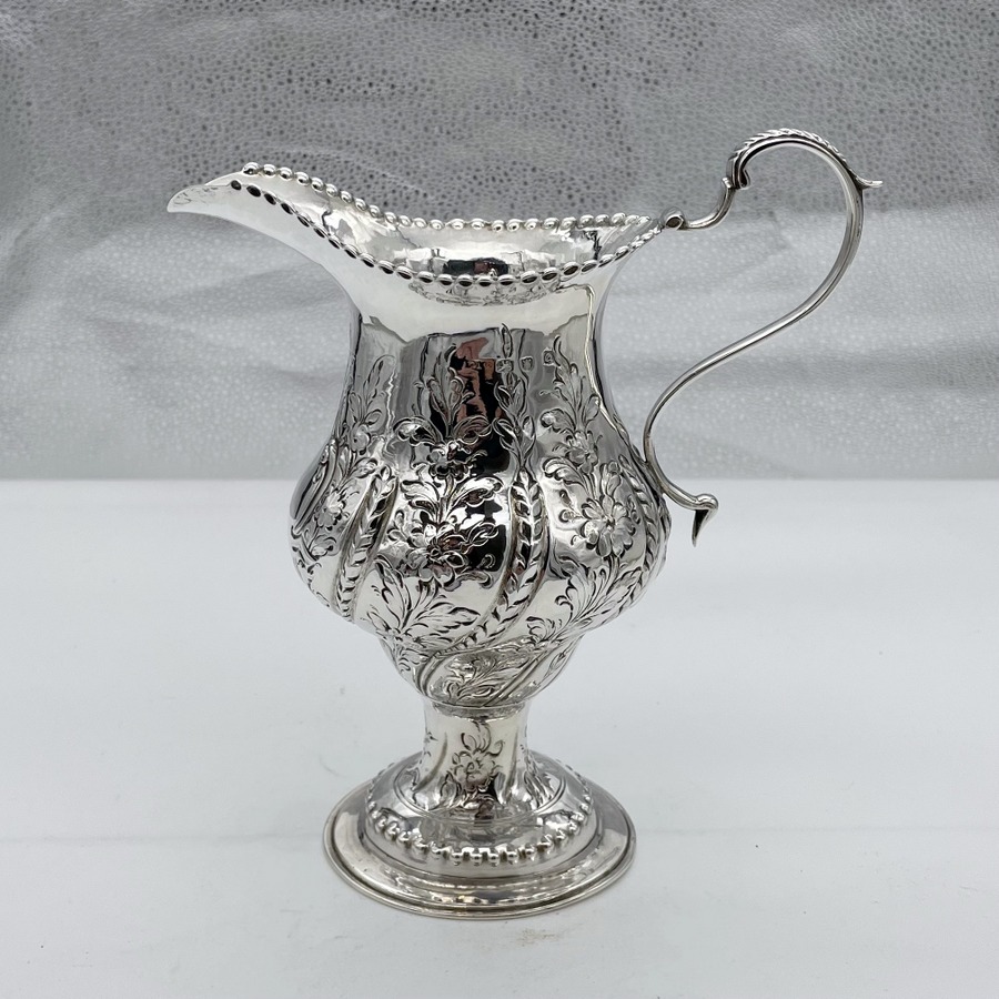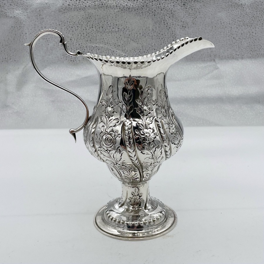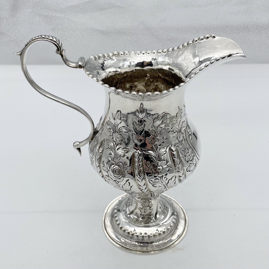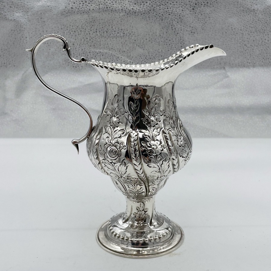 A rare and extremely stylish Georgian silver beer jug decorated with elegant floral embossing and a stylish central cartouche. Â The upper rim of the lip has elegant stamped bead ornamentation for highlights