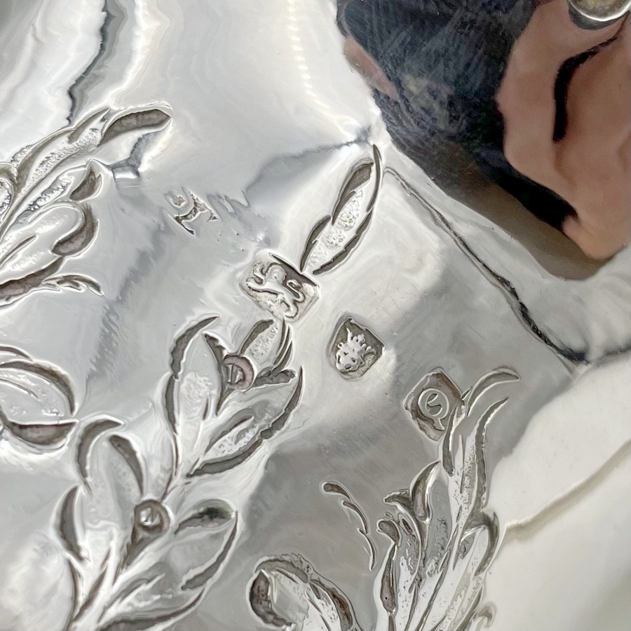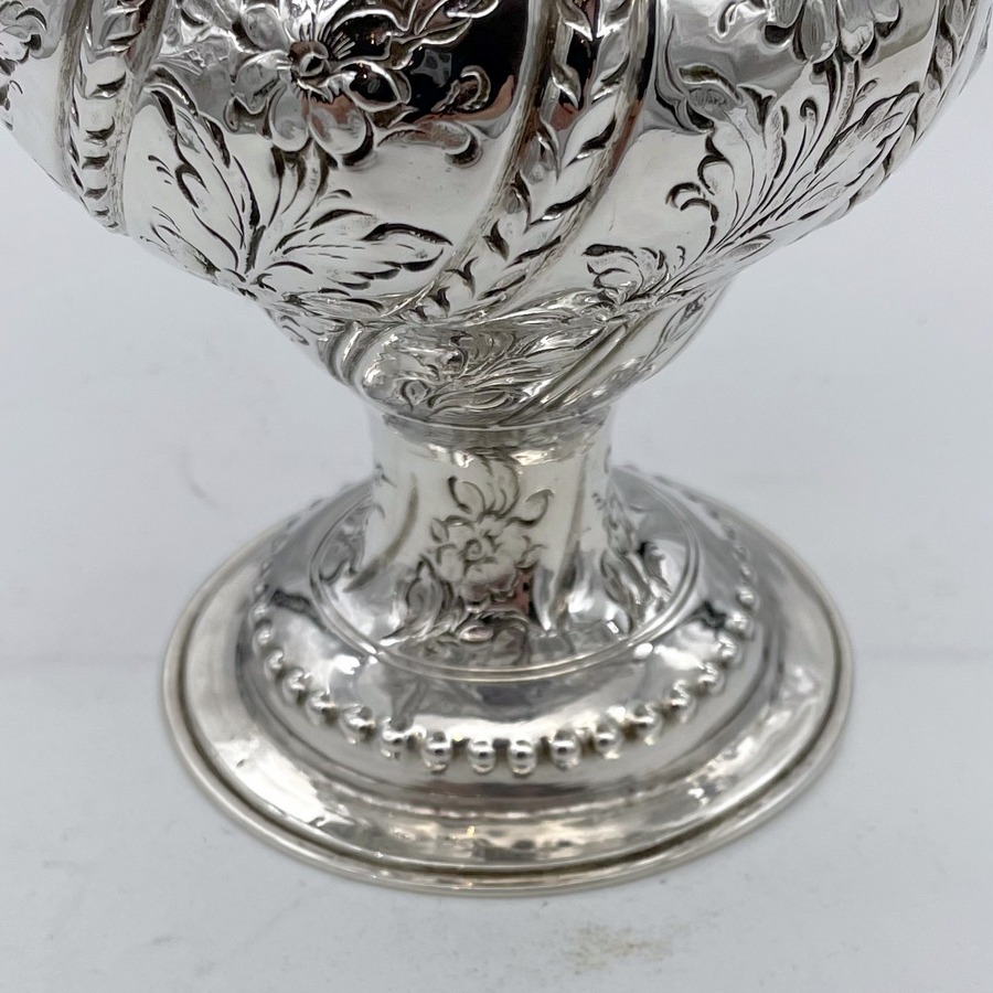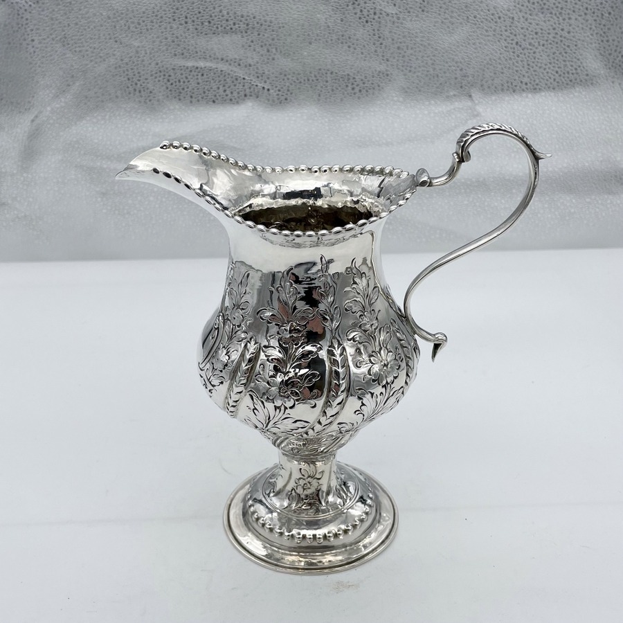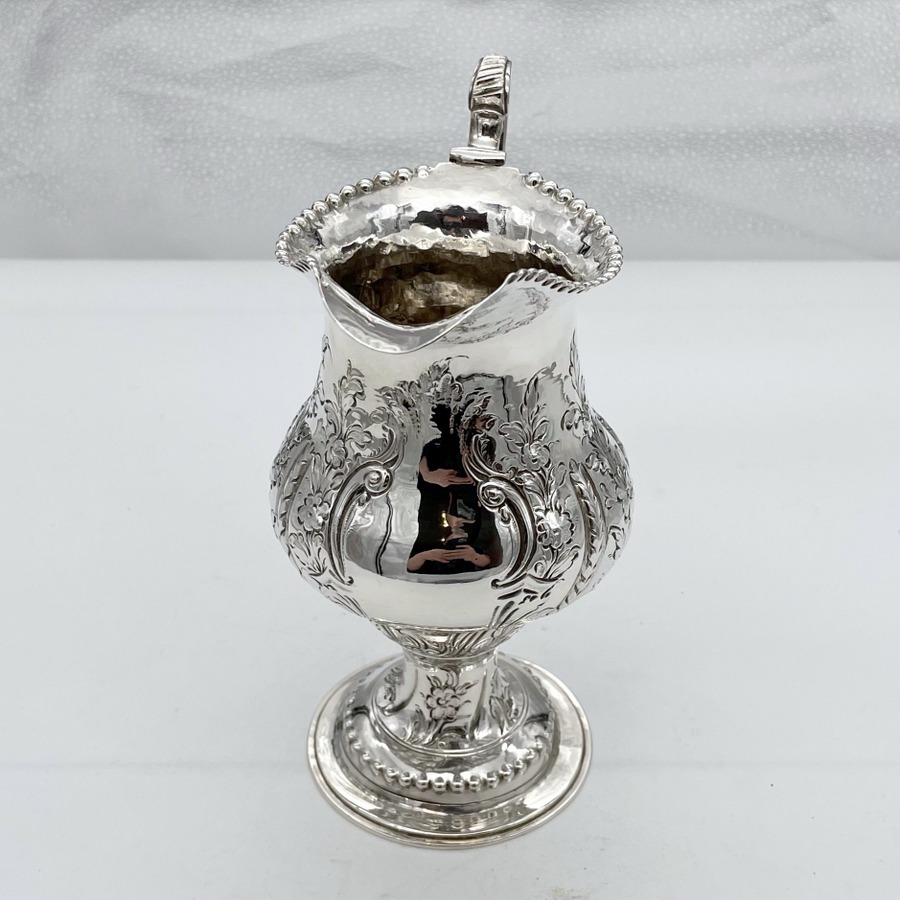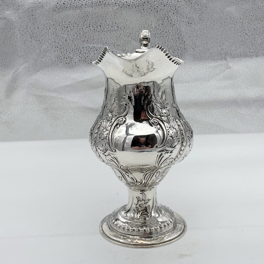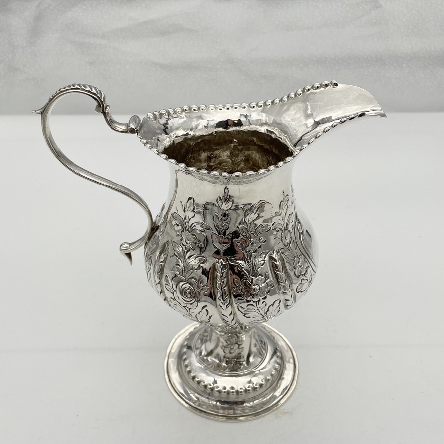 A rare and extremely stylish Georgian silver beer jug decorated with elegant floral embossing and a stylish central cartouche. Â The upper rim of the lip has elegant stamped bead ornamentation for highlights