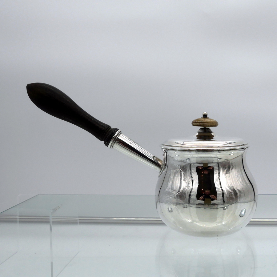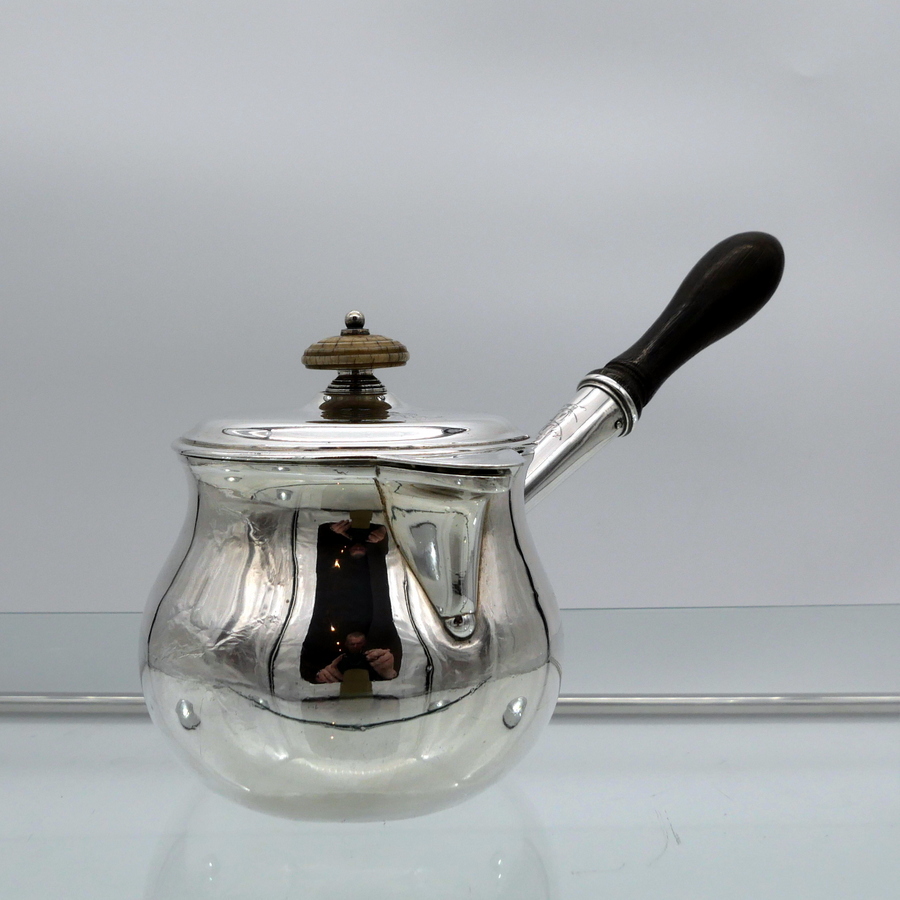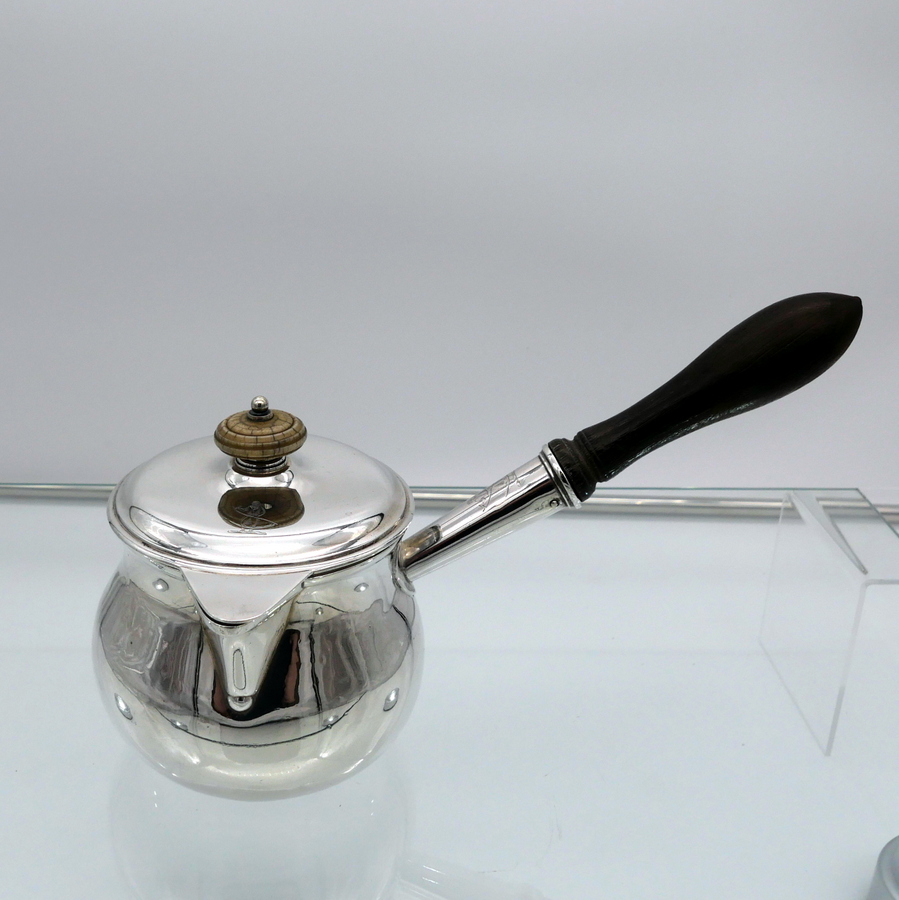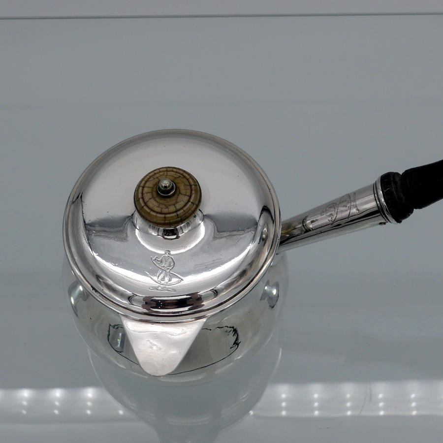 A beautiful Georgian silver large covered caldron shaped brandy pan elegantly plain formed in design. Â There are stunning hand engraved contemporary crests for importance.