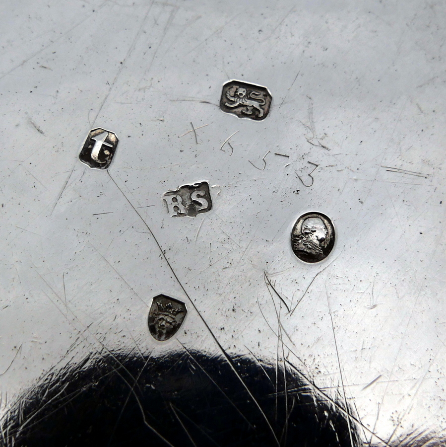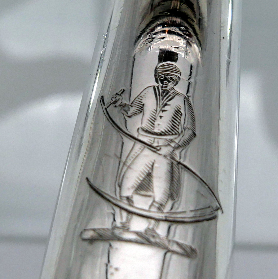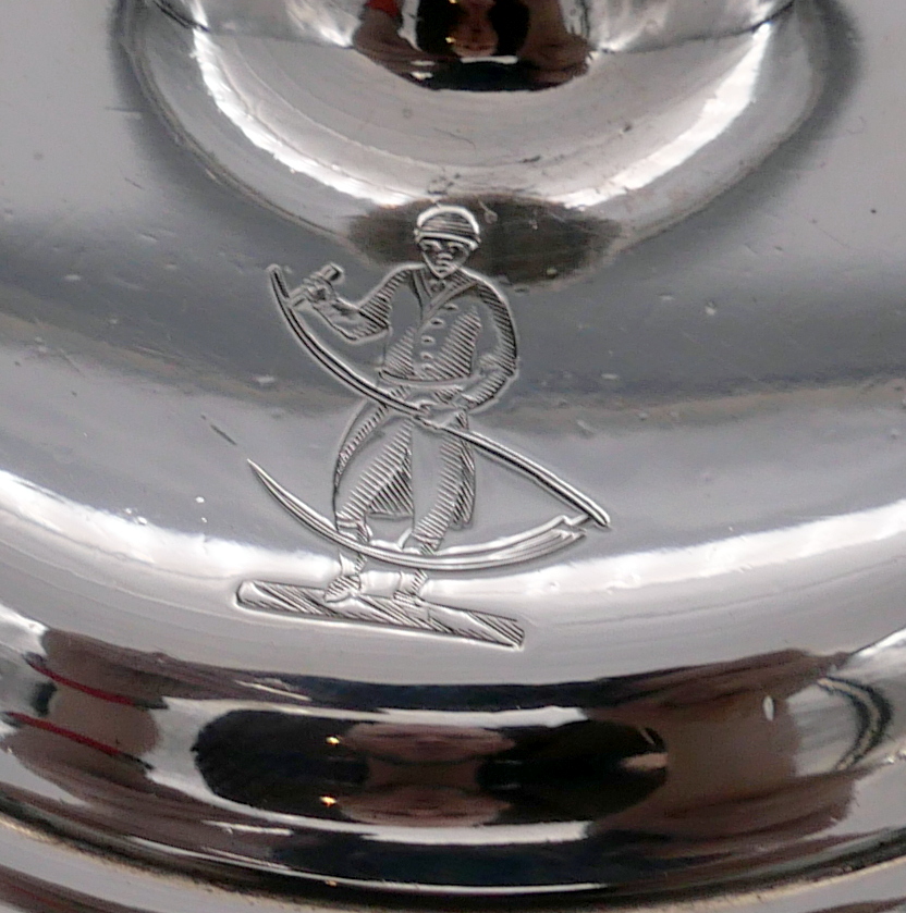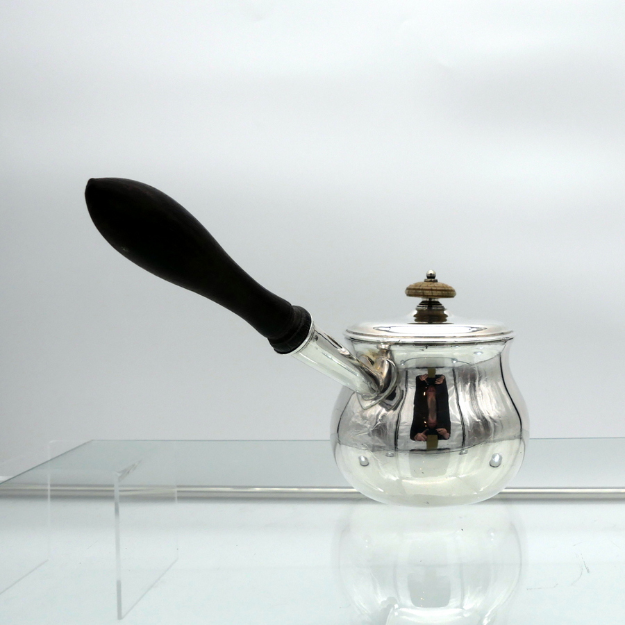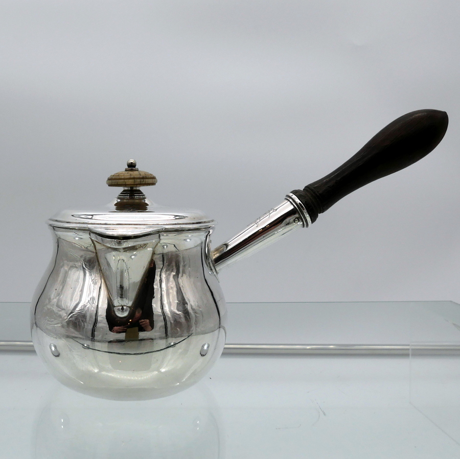 A beautiful Georgian silver large covered caldron shaped brandy pan elegantly plain formed in design. Â There are stunning hand engraved contemporary crests for importance.