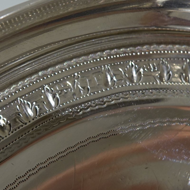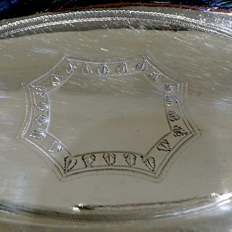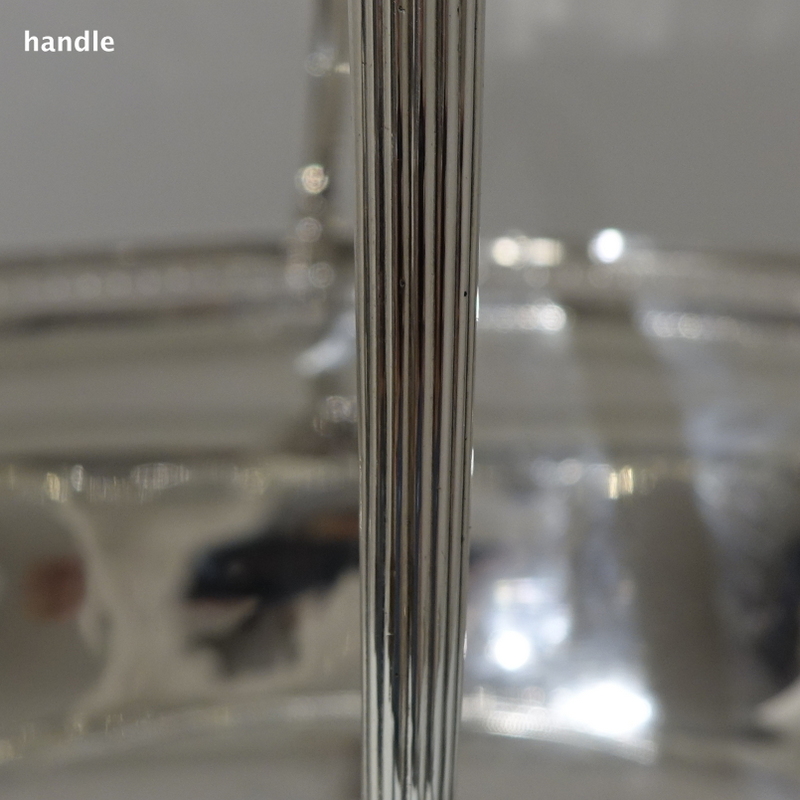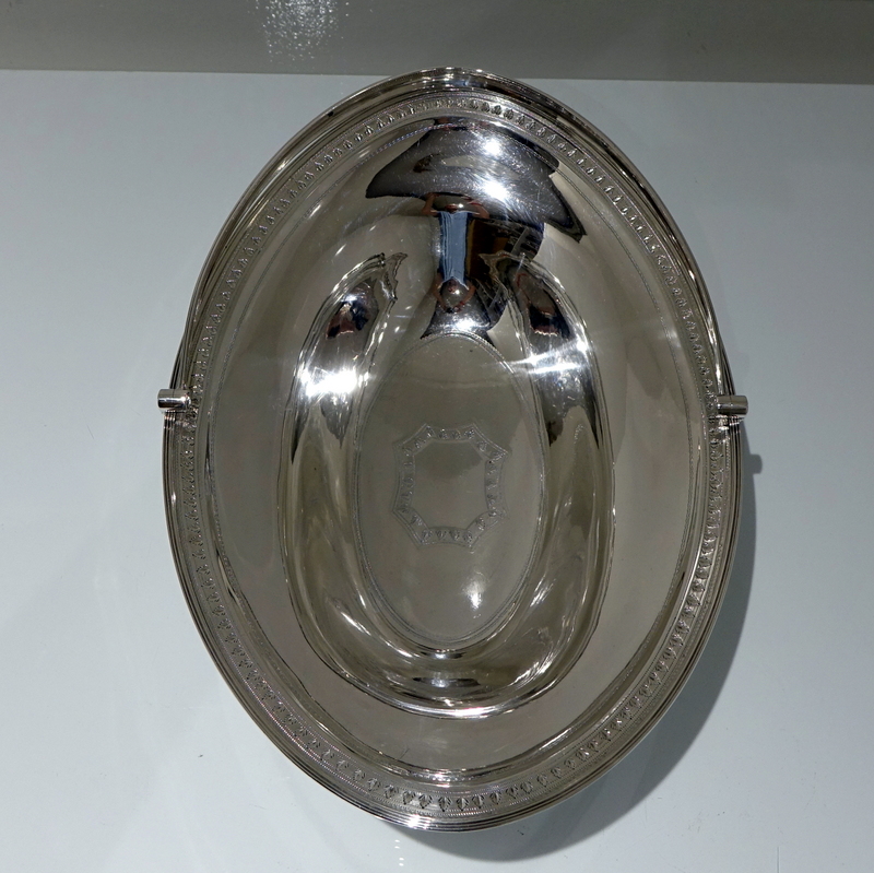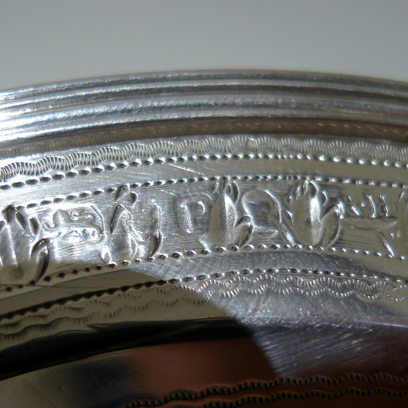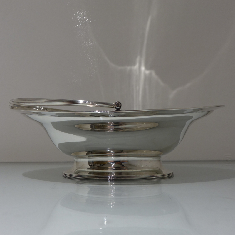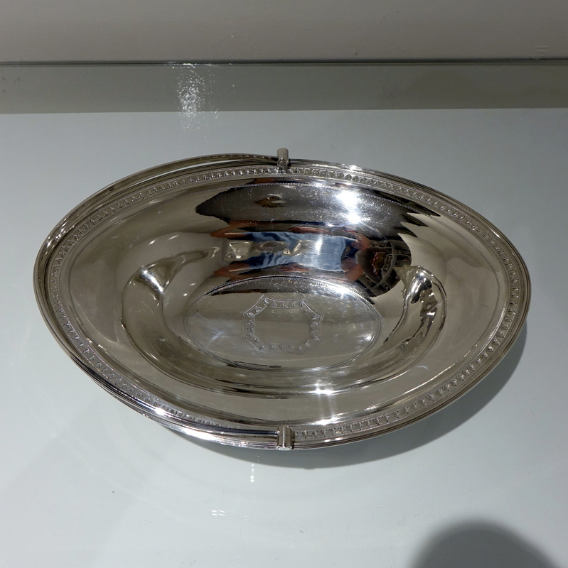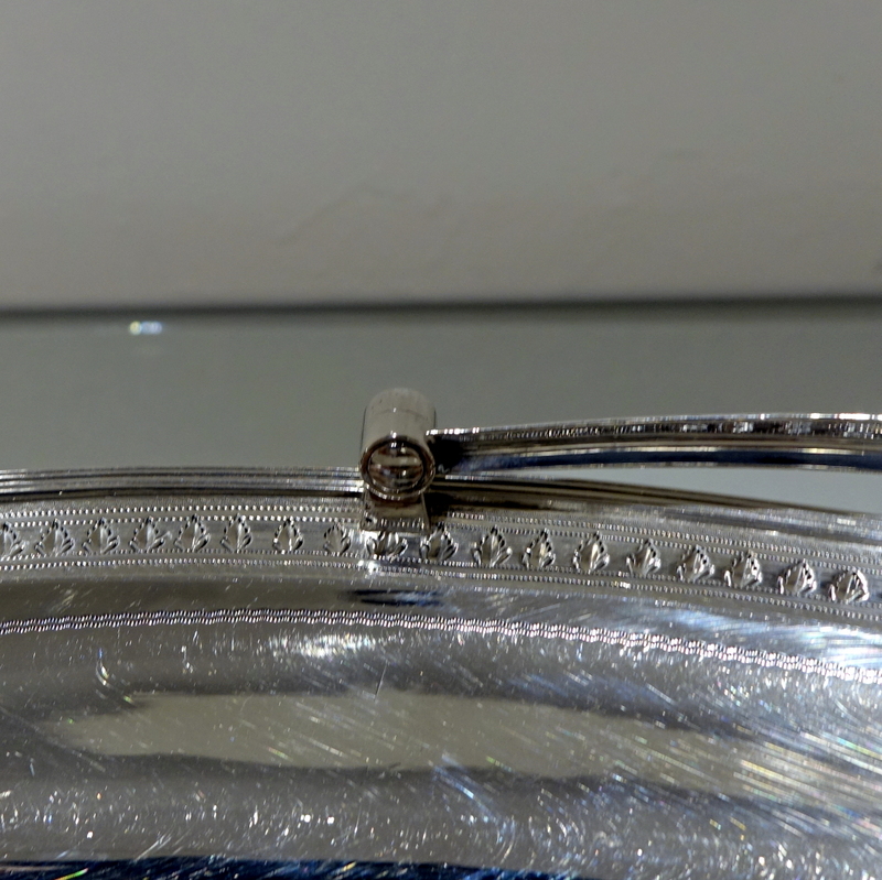 An elegant 18th century large oval swing-handled Georgian cake basket, decorated with intricate bright-cut engraving to the outer rim and stylish inner cartouche.  The basket has a reed style applied border and additional reed decoration to the  swing handle.