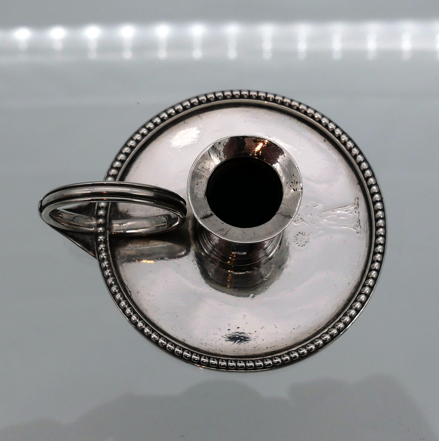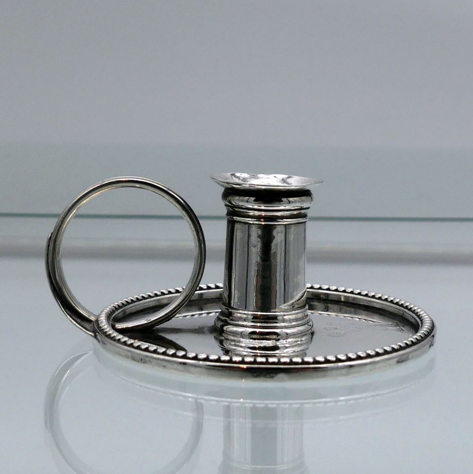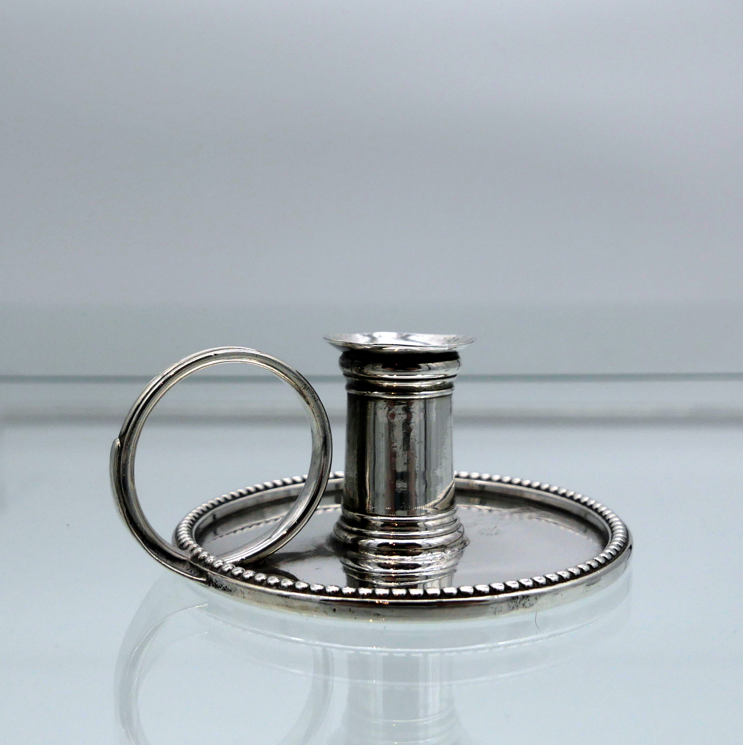 A rare and extremely collectable 18th century Scottish silver chamberstick designed with a beautiful bead border and a fabulous oversized ring handle. Â The centre front has an elegant contemporary hand engraved crest for importance.