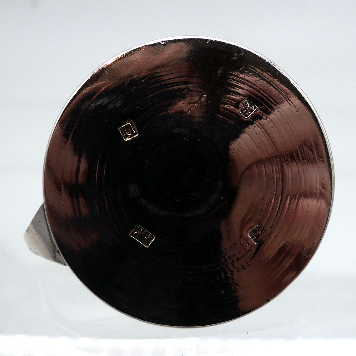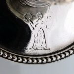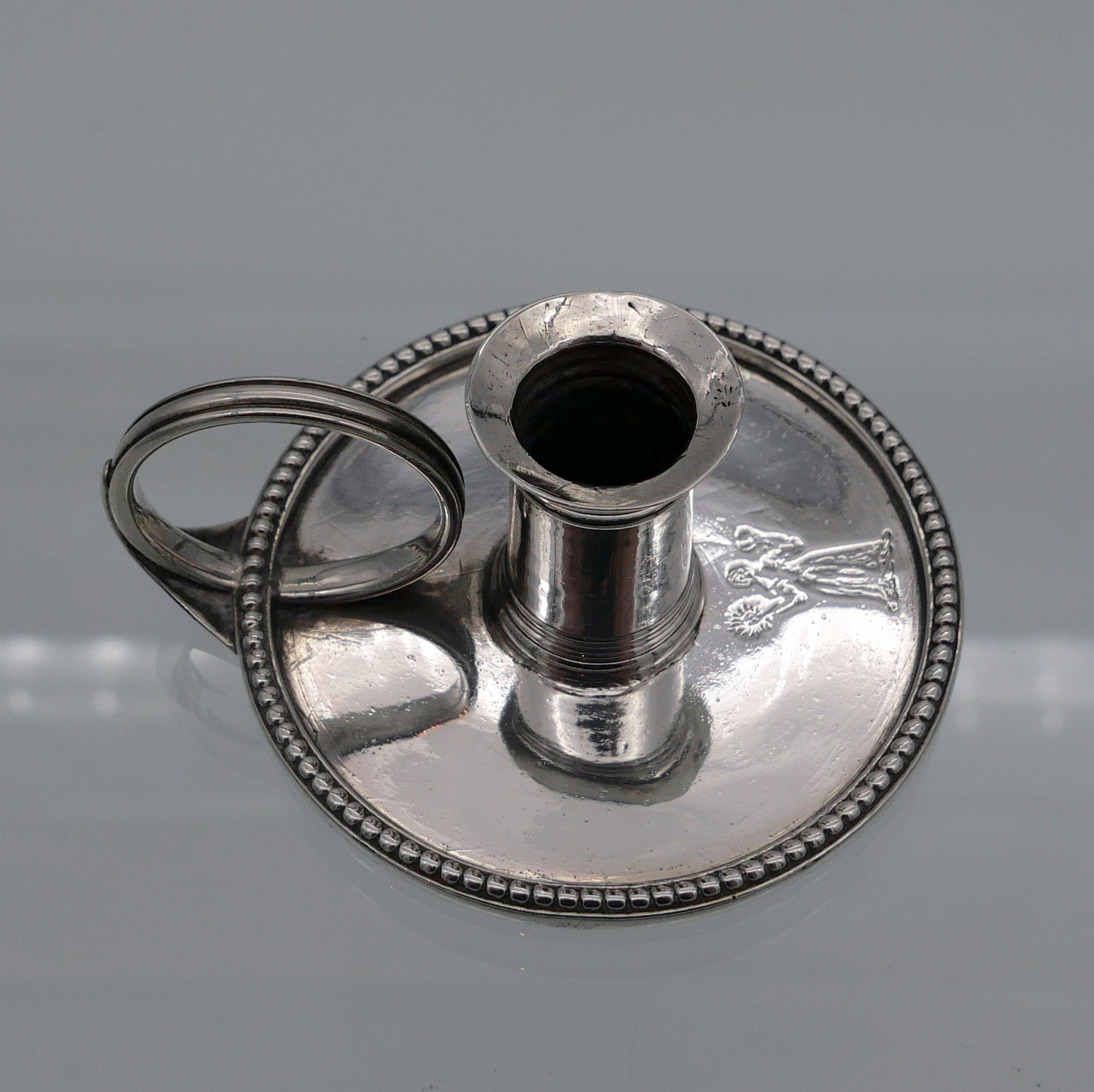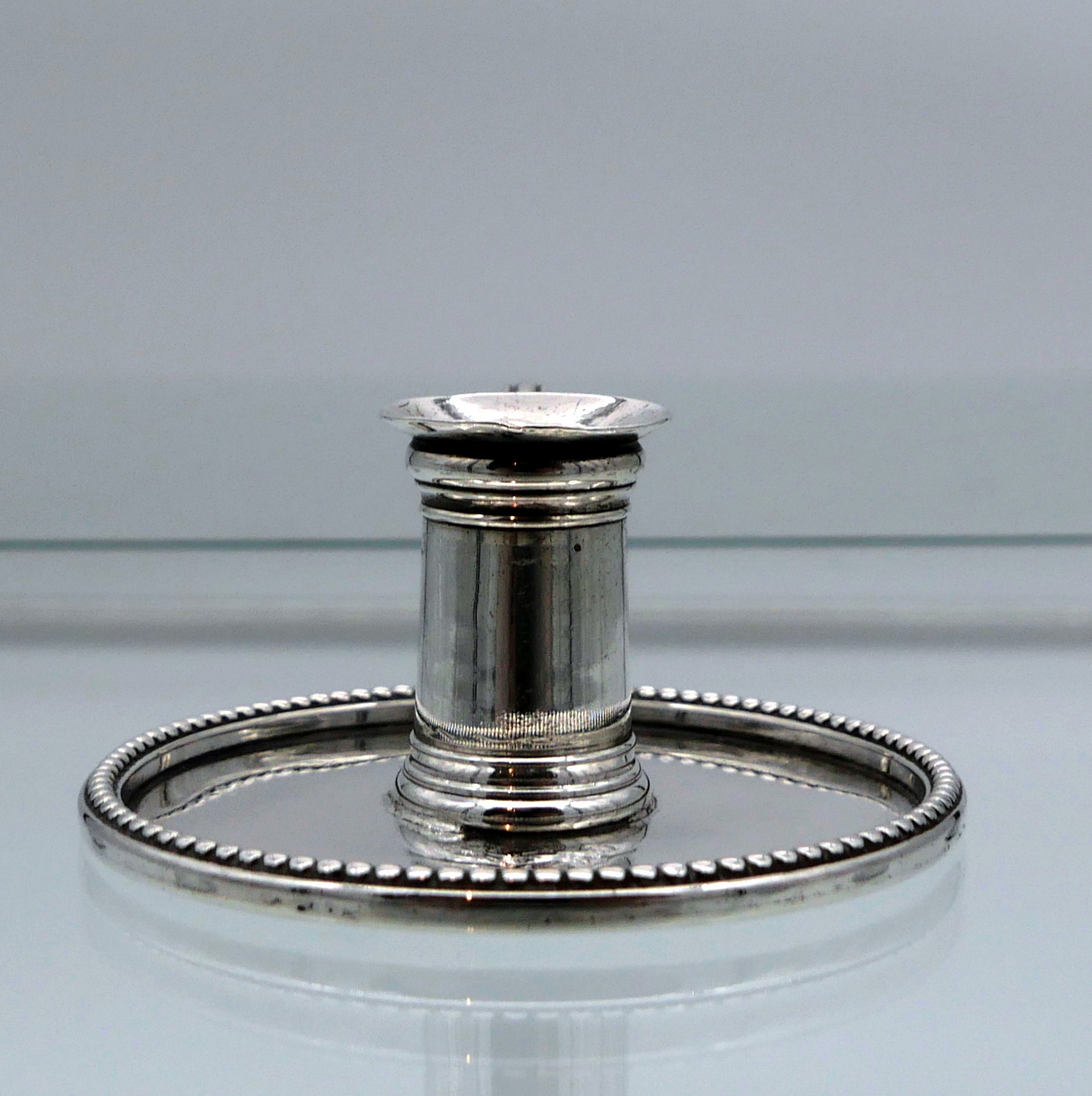 A rare and extremely collectable 18th century Scottish silver chamberstick designed with a beautiful bead border and a fabulous oversized ring handle. Â The centre front has an elegant contemporary hand engraved crest for importance.