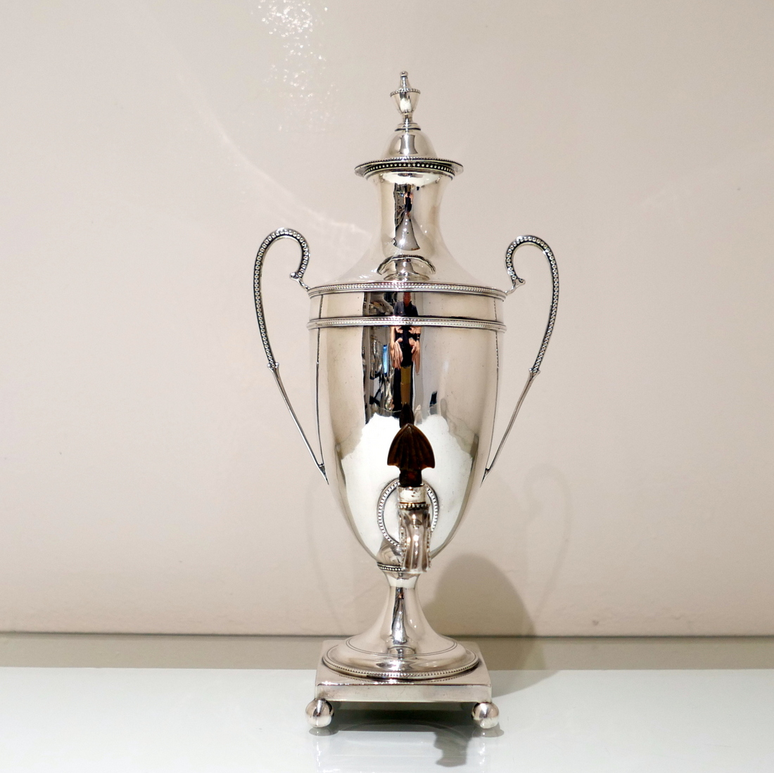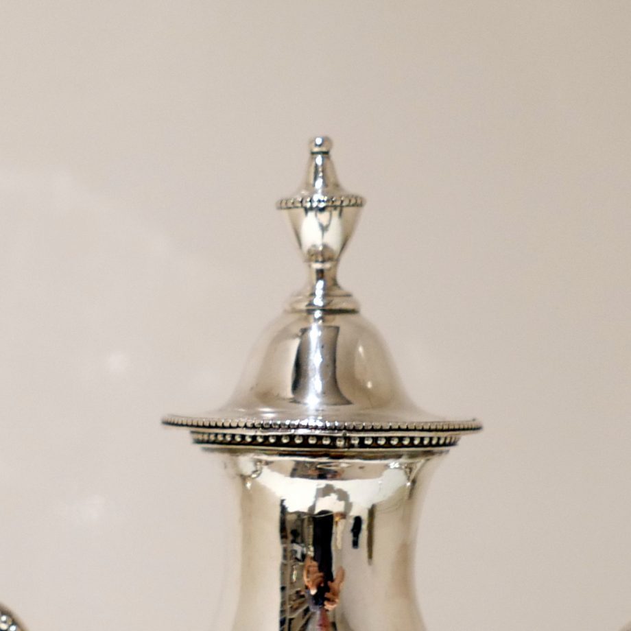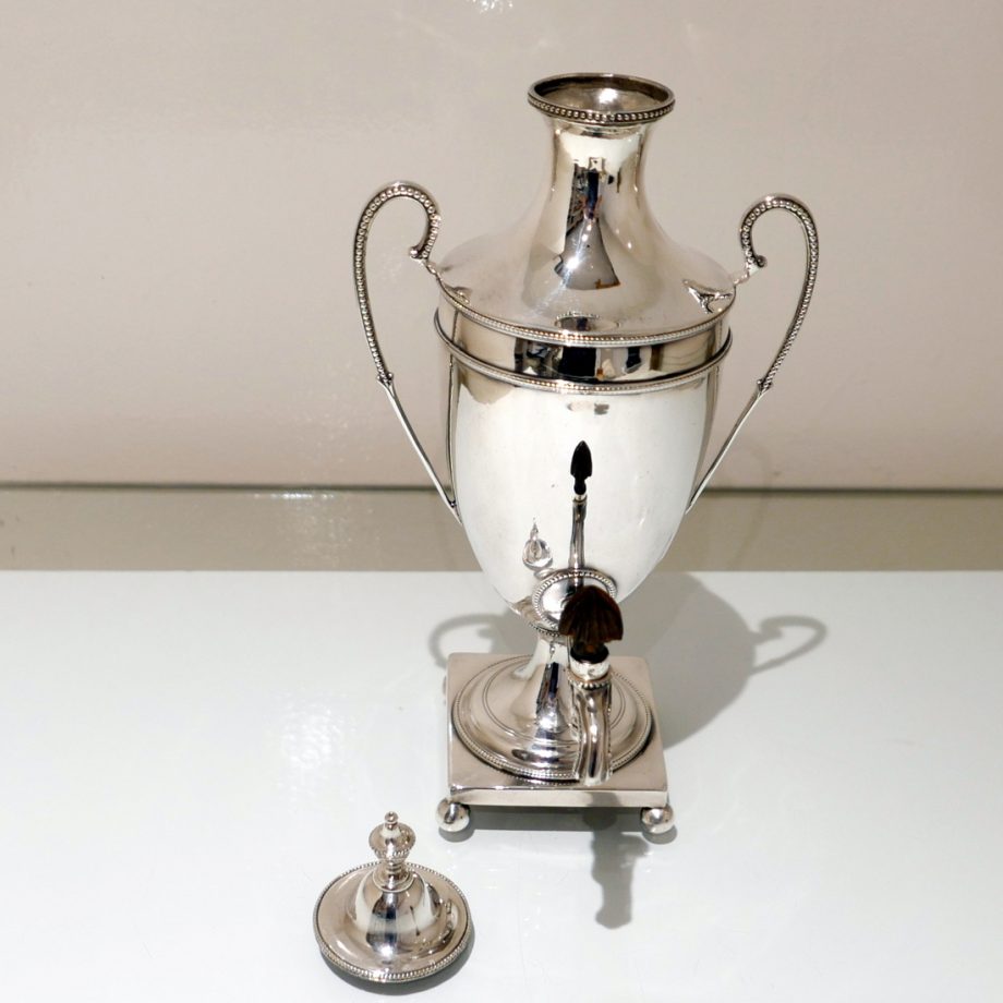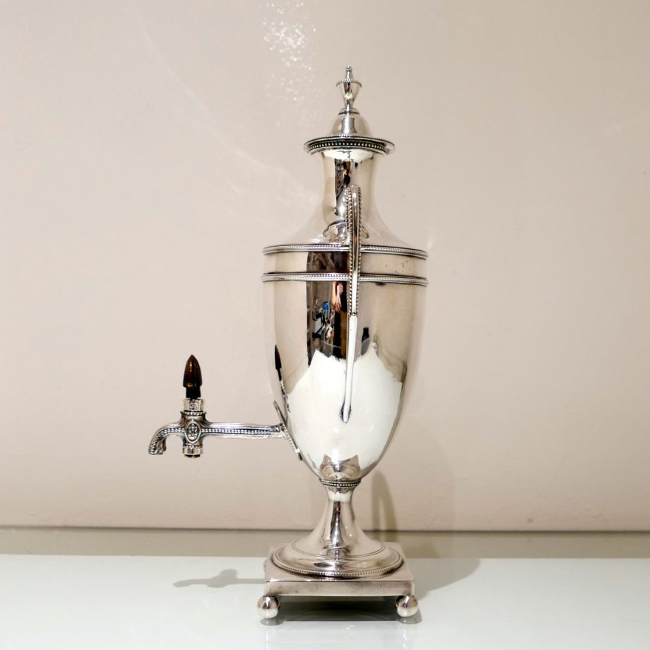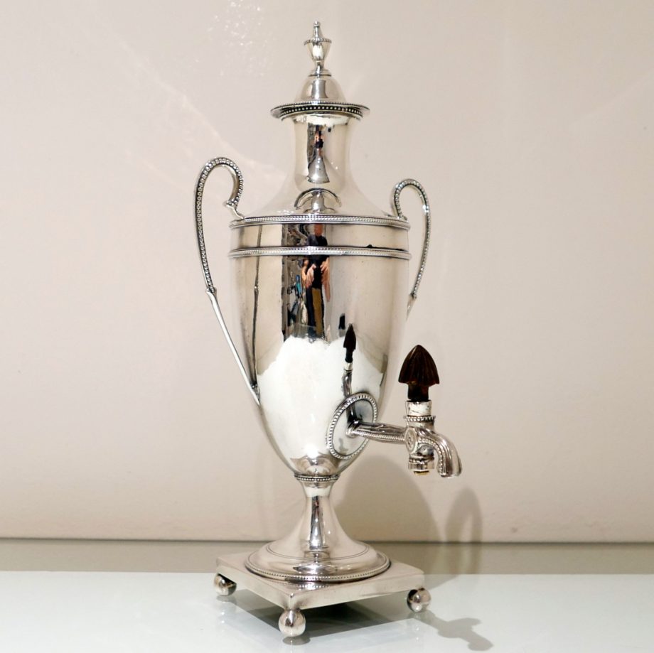An extremely beautiful vase shaped plain formed Georgian silver coffee urn decorated with highly desirable bead borders and elongated scroll handles. Â The domed lid is detachable and the square raised pedestal foot is mounted on four elegant ball feet.