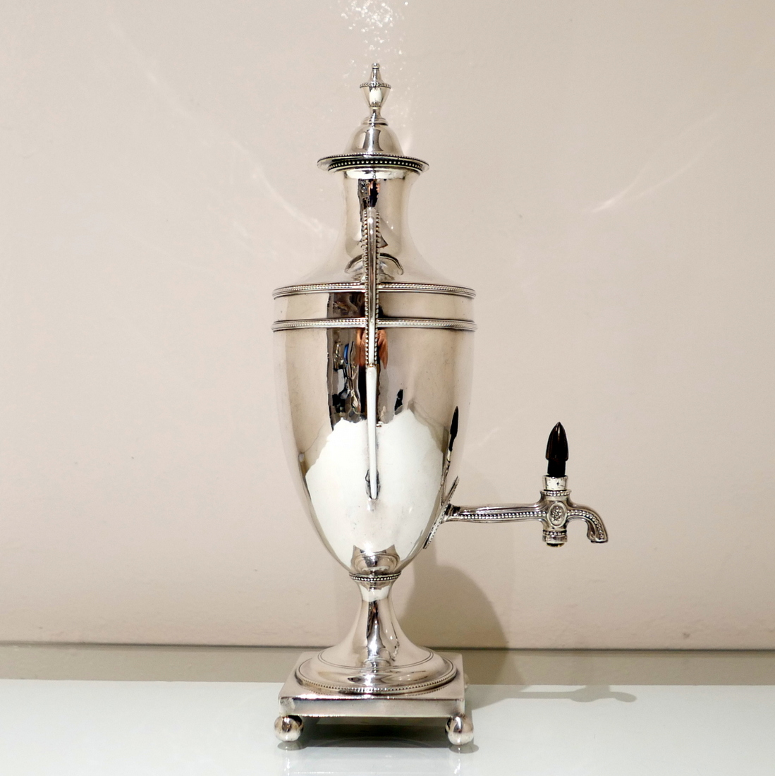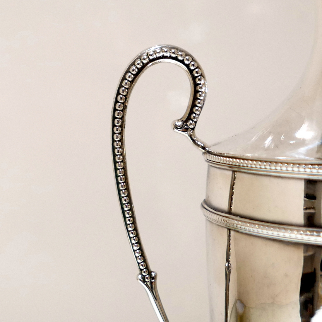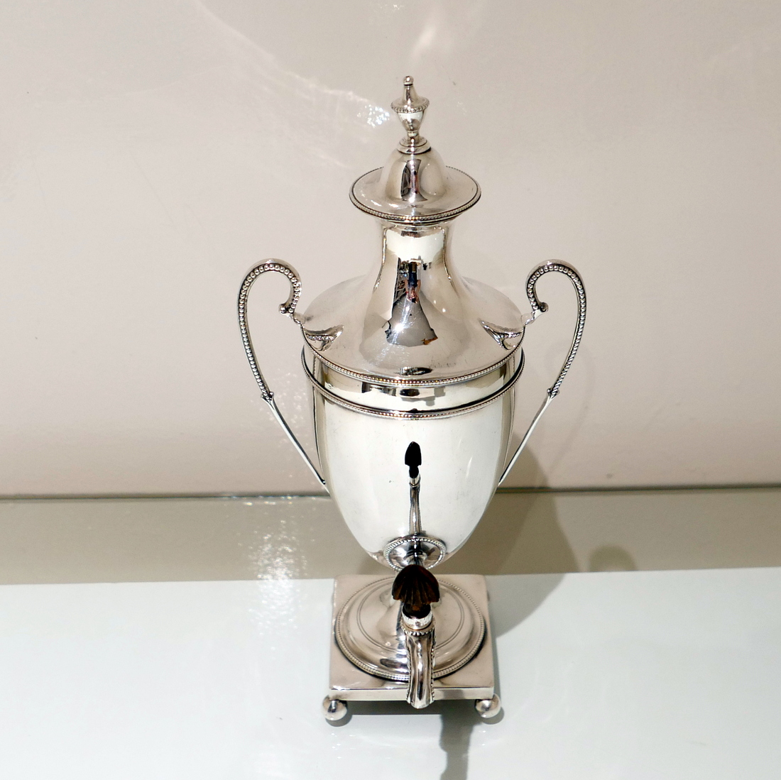 An extremely beautiful vase shaped plain formed Georgian silver coffee urn decorated with highly desirable bead borders and elongated scroll handles. Â The domed lid is detachable and the square raised pedestal foot is mounted on four elegant ball feet.