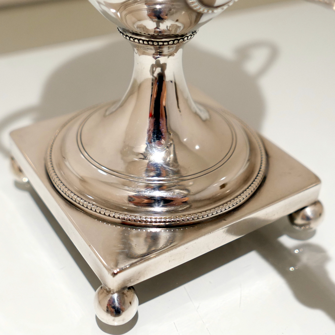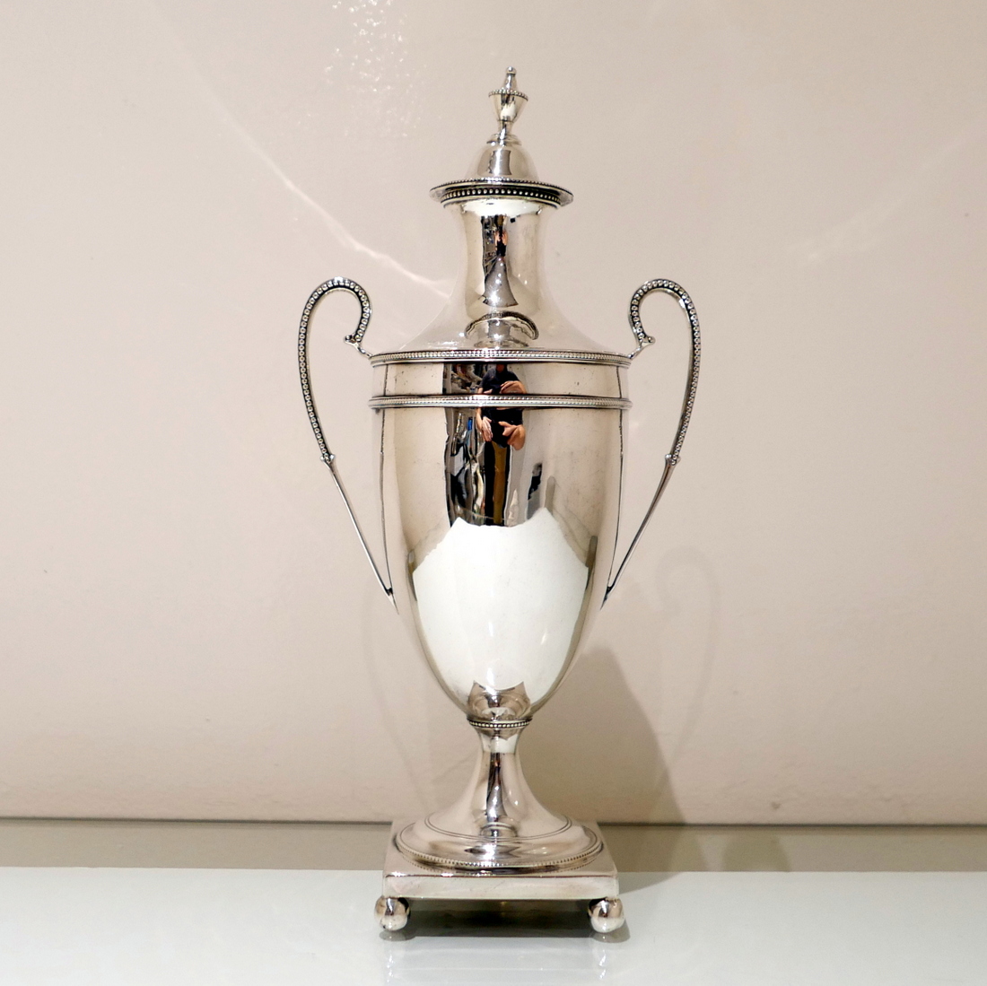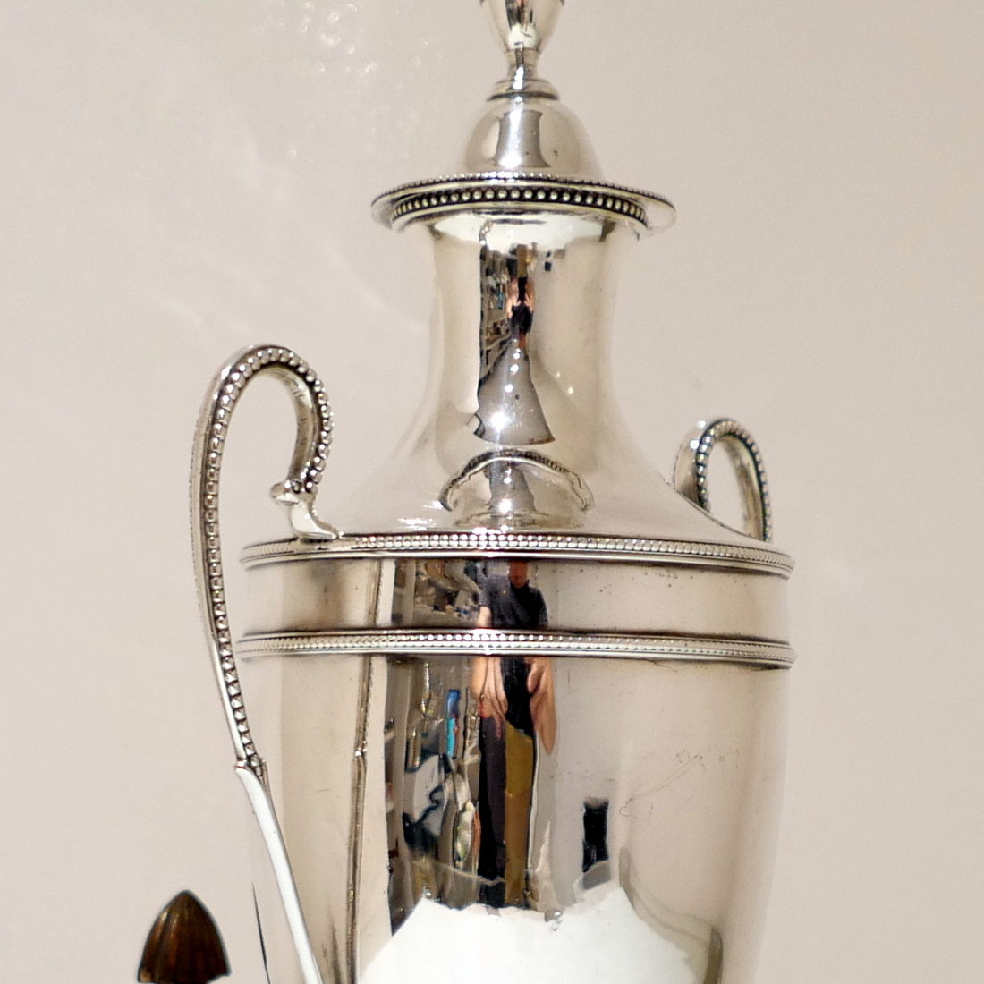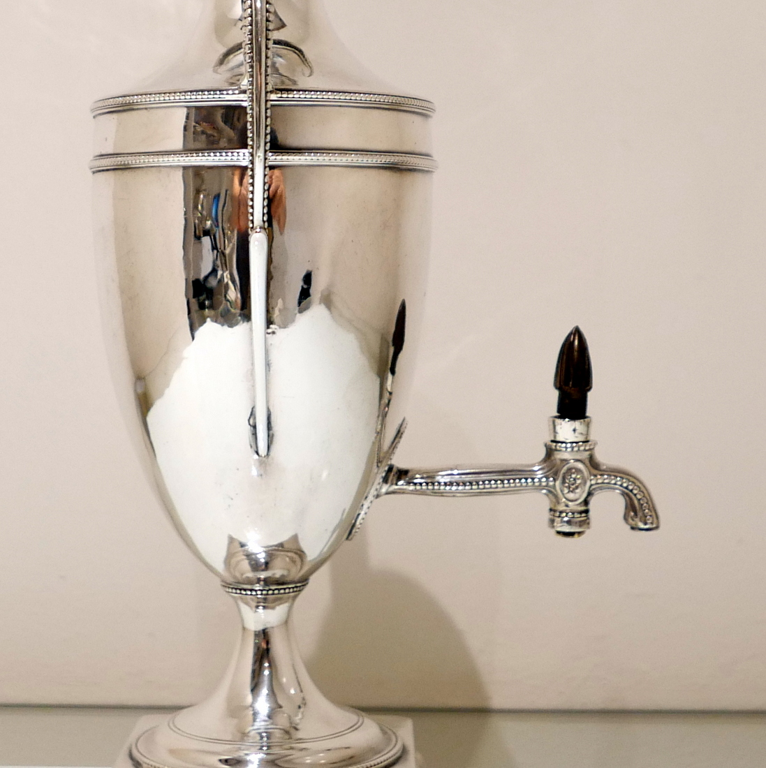 An extremely beautiful vase shaped plain formed Georgian silver coffee urn decorated with highly desirable bead borders and elongated scroll handles. Â The domed lid is detachable and the square raised pedestal foot is mounted on four elegant ball feet.
