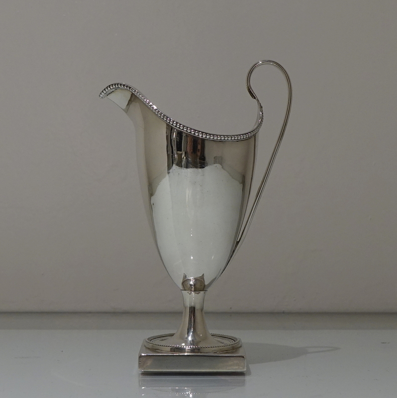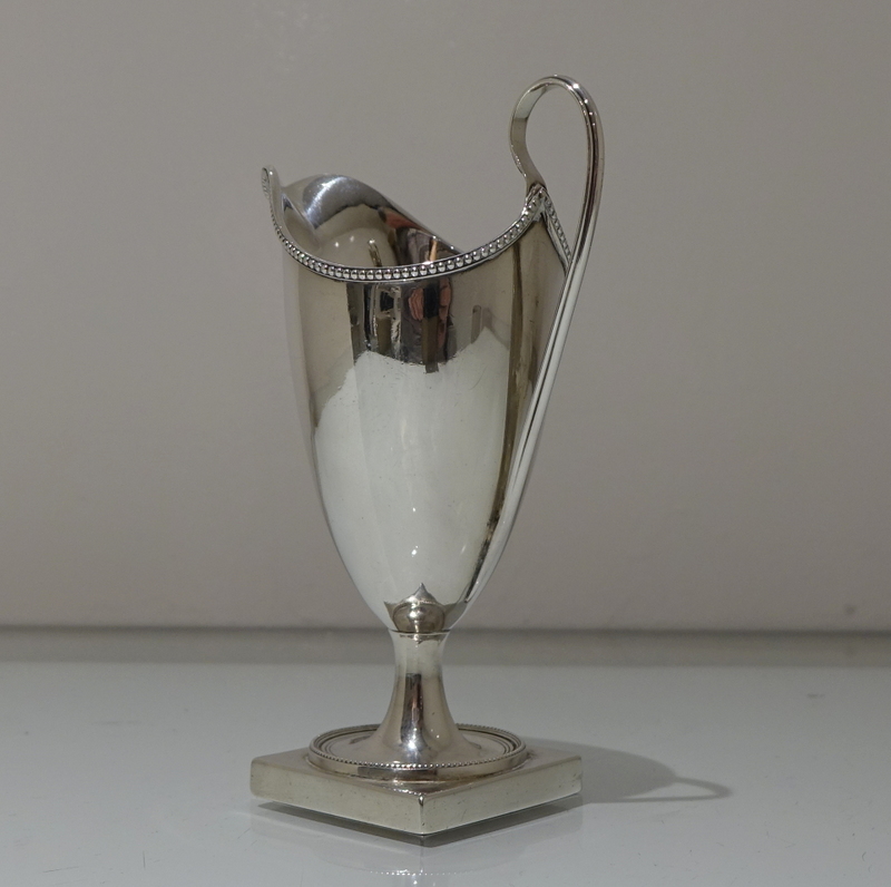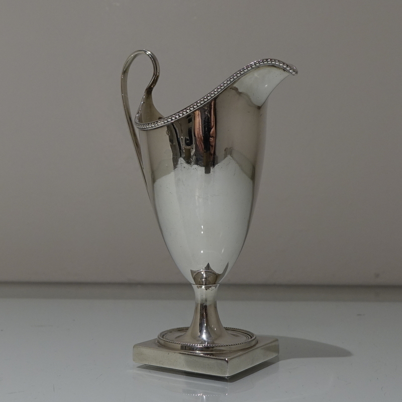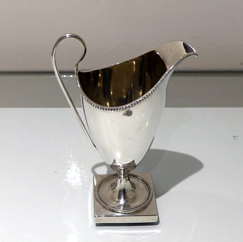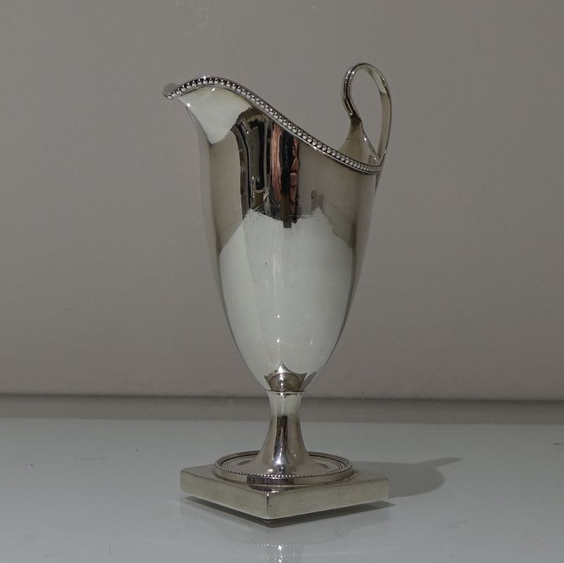 A very elegant Georgian plain formed helmet shaped cream jug with applied bead borders for decorative highlights. Â The foot is square pedestal formed and the handle is reeded loop design.