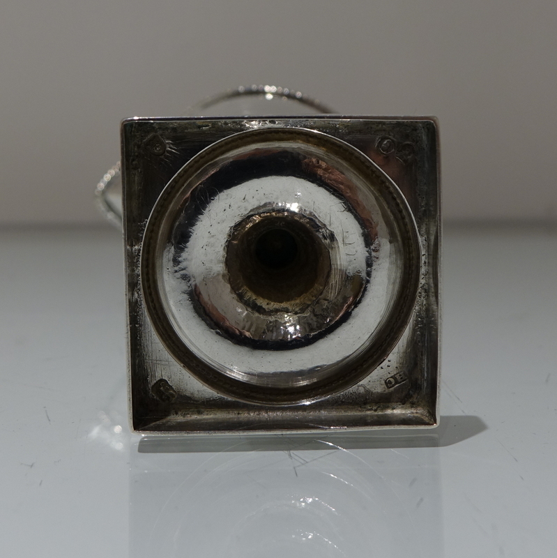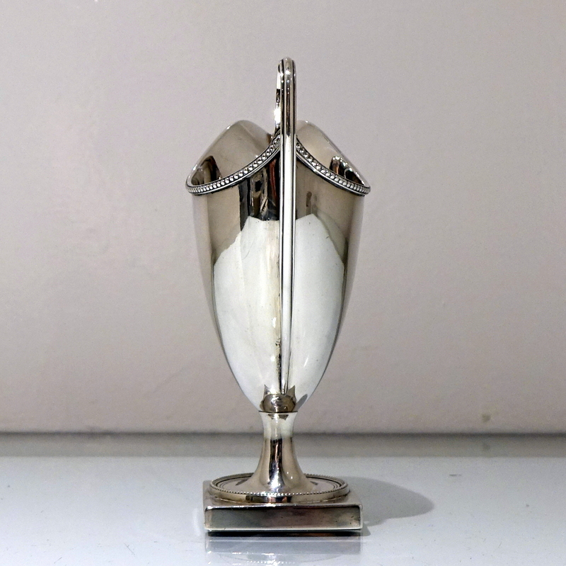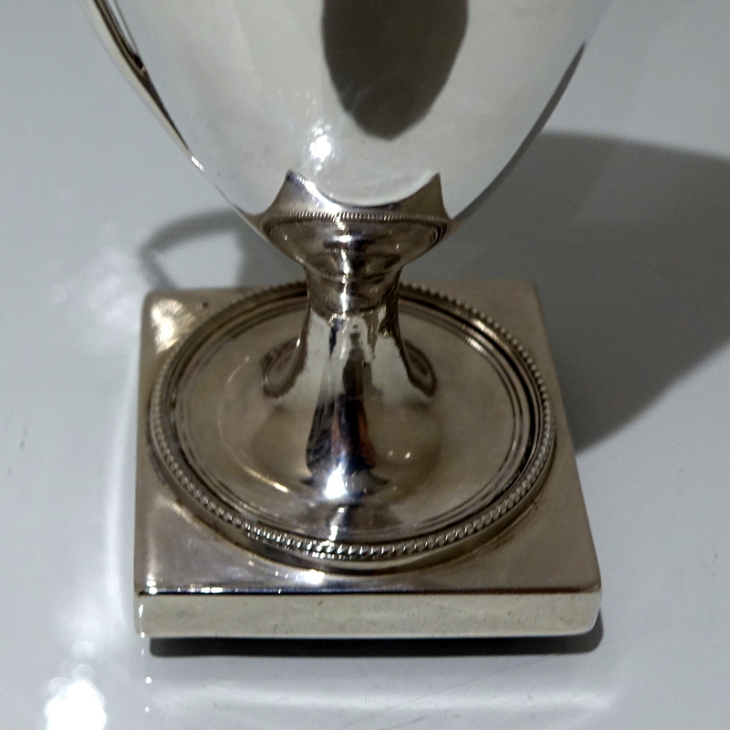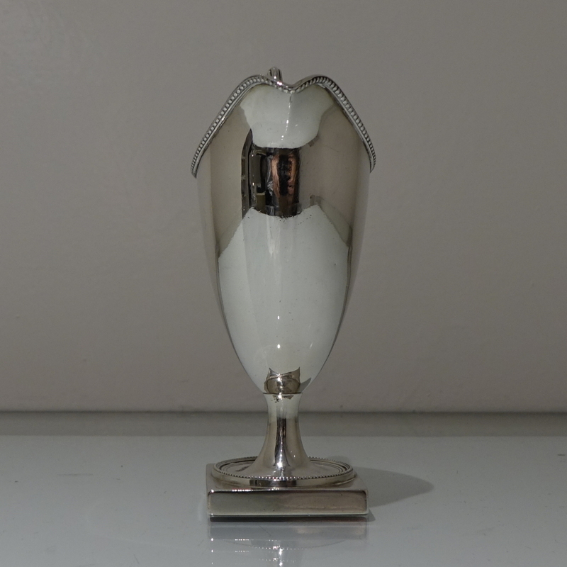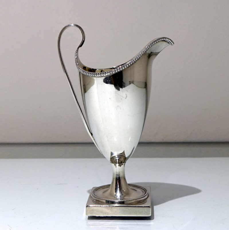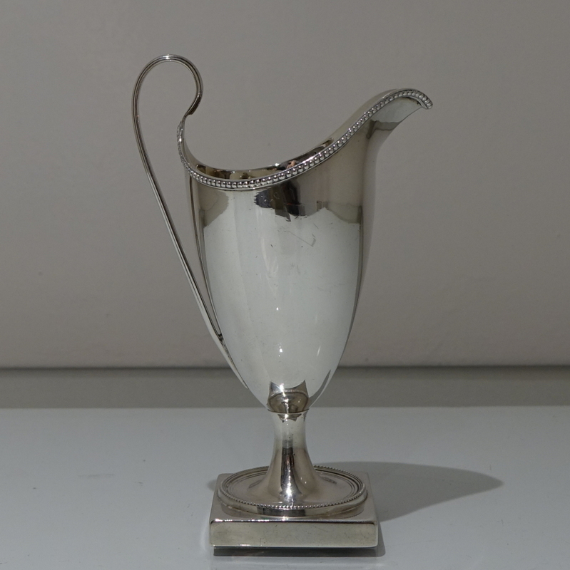 A very elegant Georgian plain formed helmet shaped cream jug with applied bead borders for decorative highlights. Â The foot is square pedestal formed and the handle is reeded loop design.