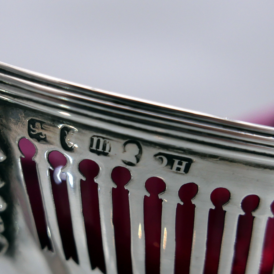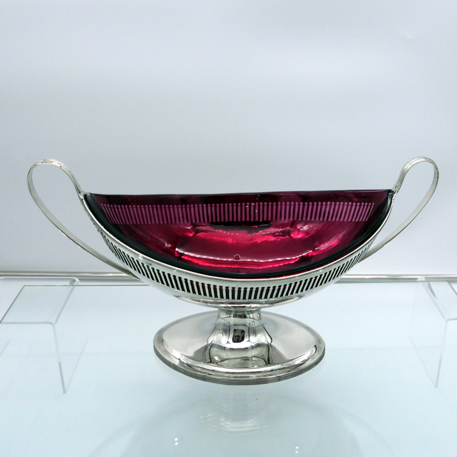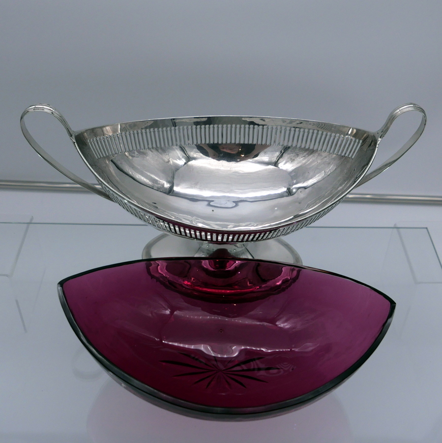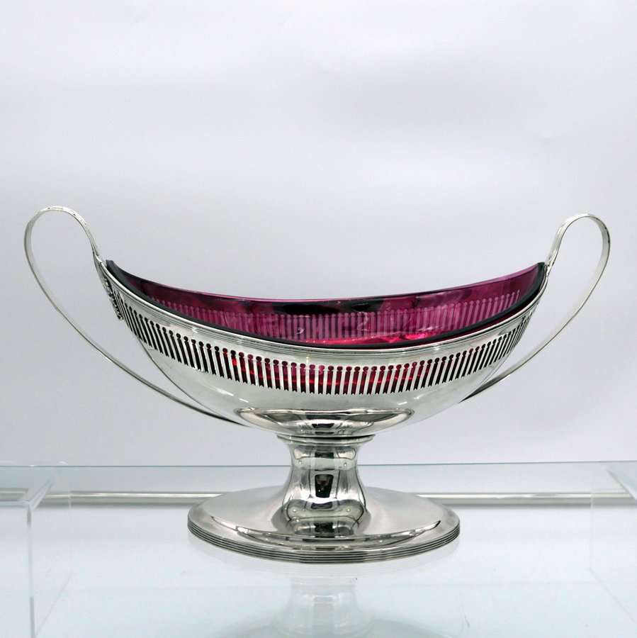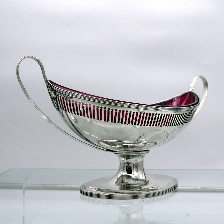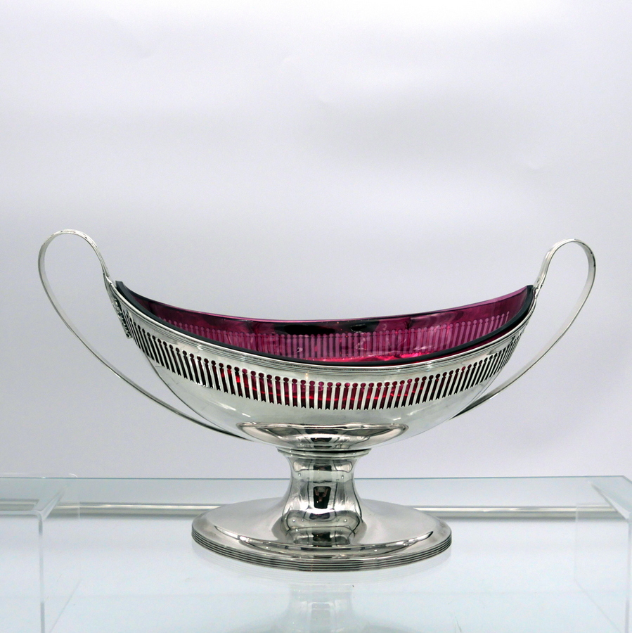 An incredibly rare oval Georgian era silver boat shaped dish decorated with a beautiful hand pierced gallery which stylishly contrasts against a colourful inset crystal liner. Â The detachable foot has a reed border for lowlights.