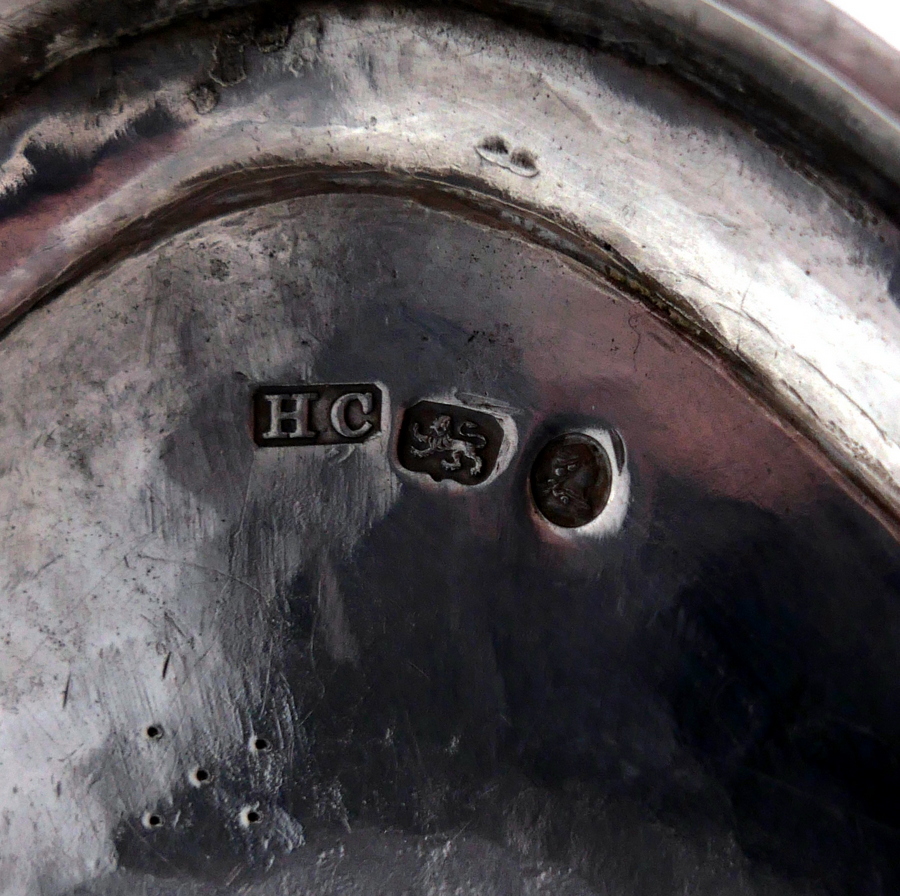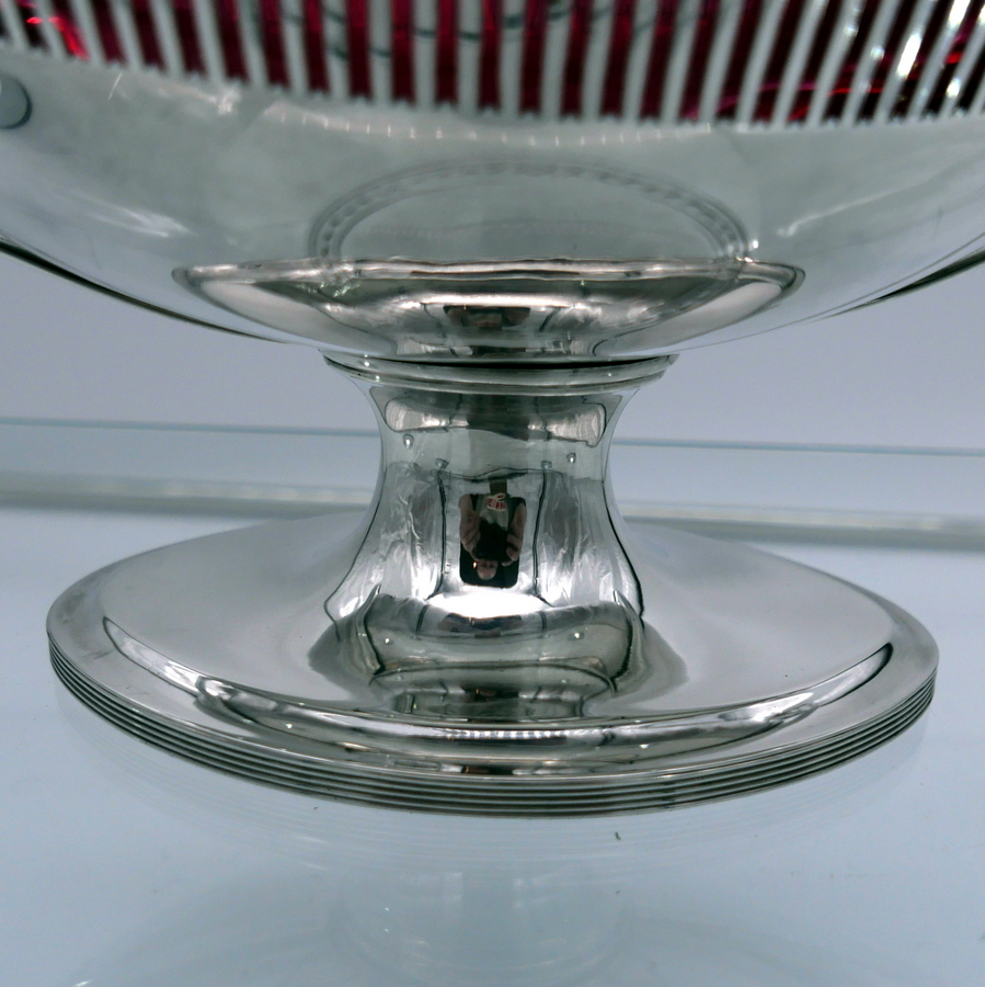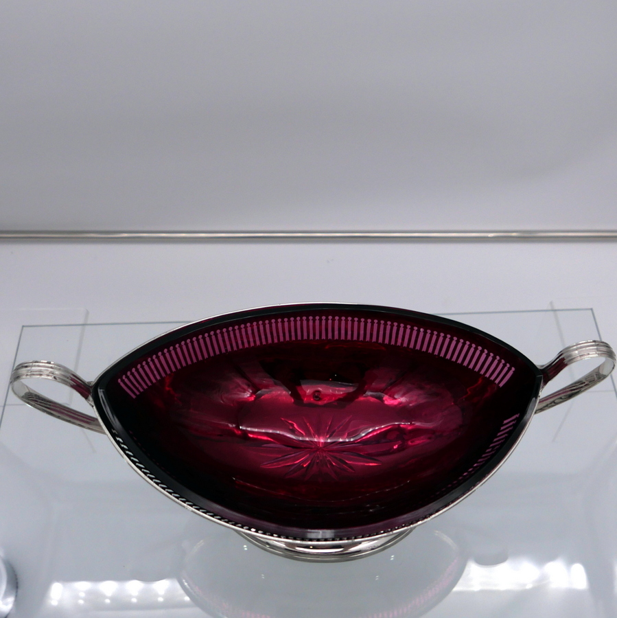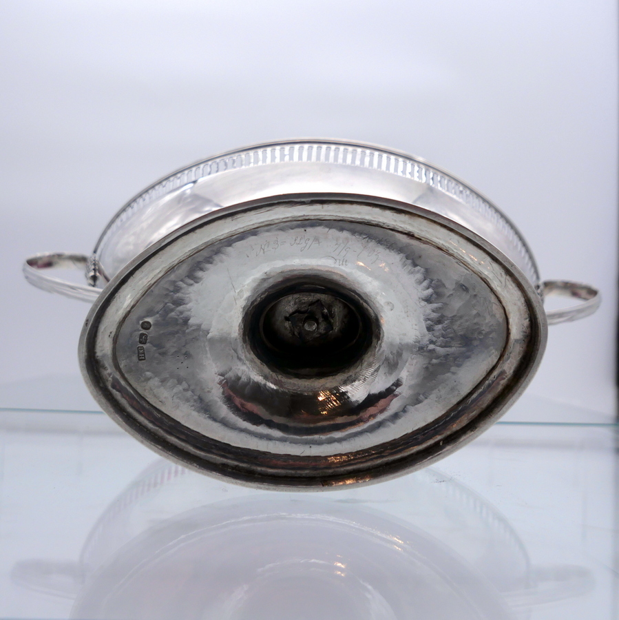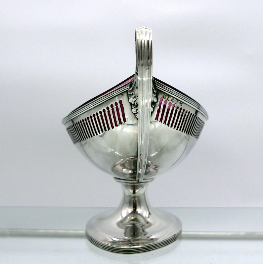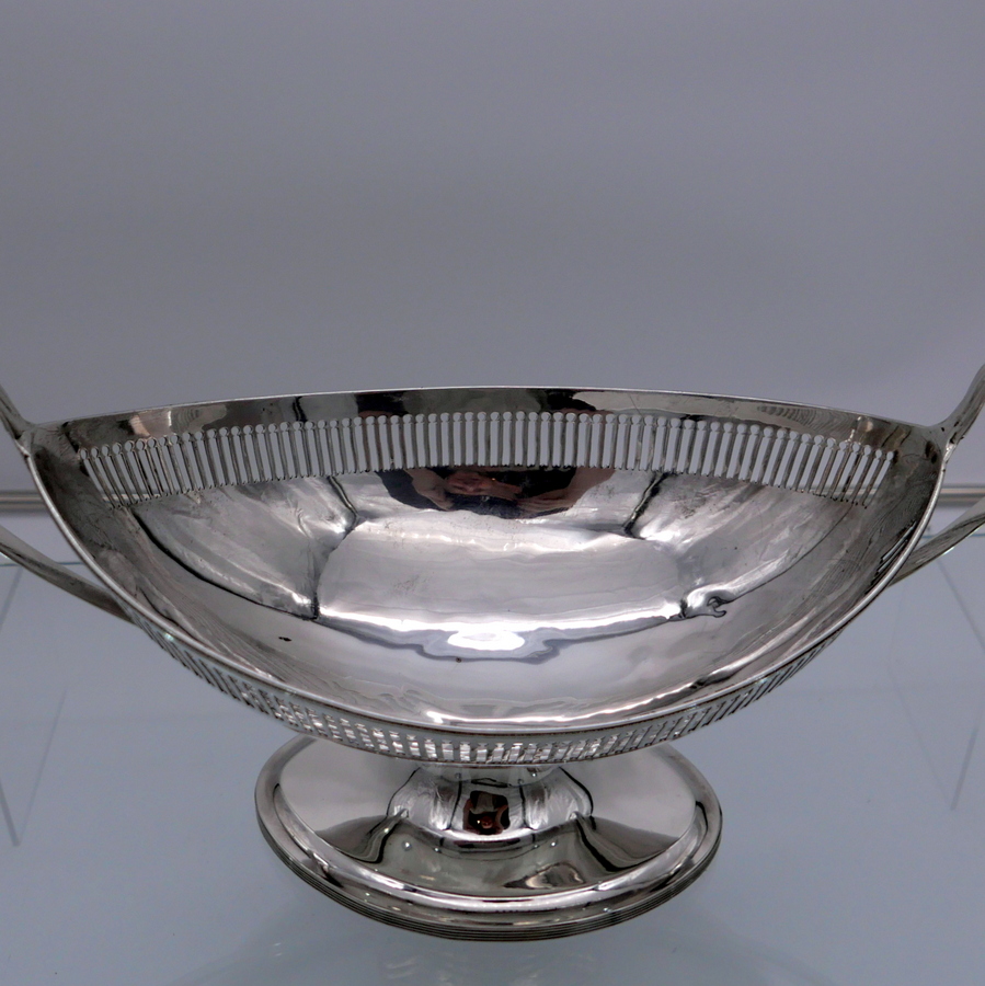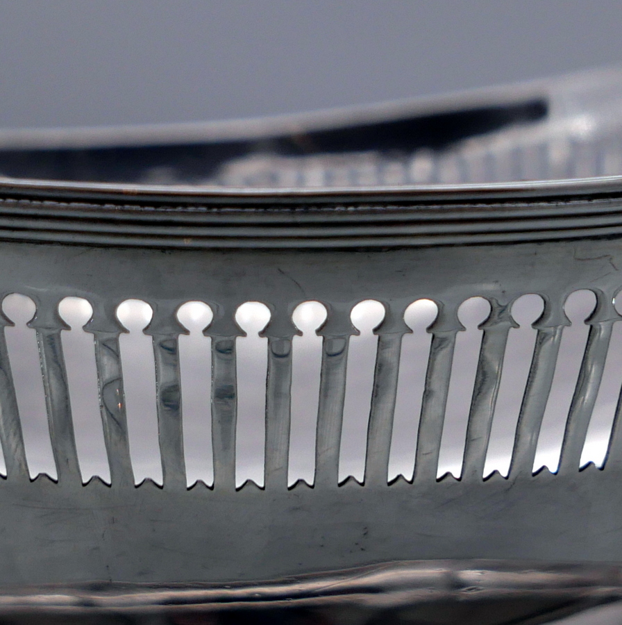 An incredibly rare oval Georgian era silver boat shaped dish decorated with a beautiful hand pierced gallery which stylishly contrasts against a colourful inset crystal liner. Â The detachable foot has a reed border for lowlights.