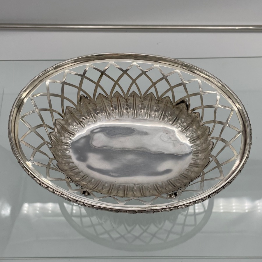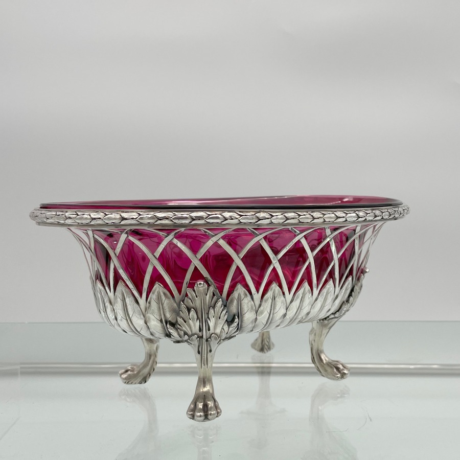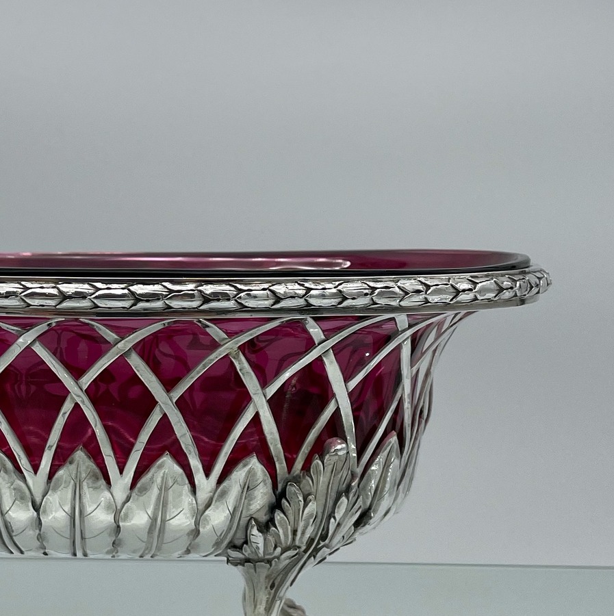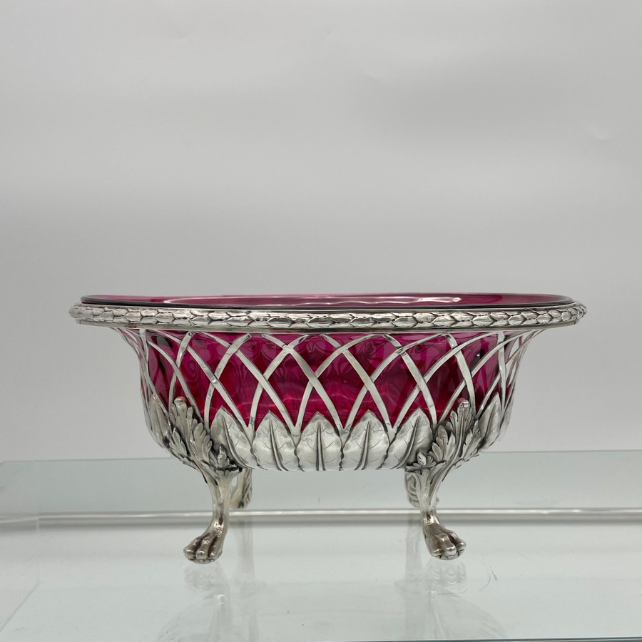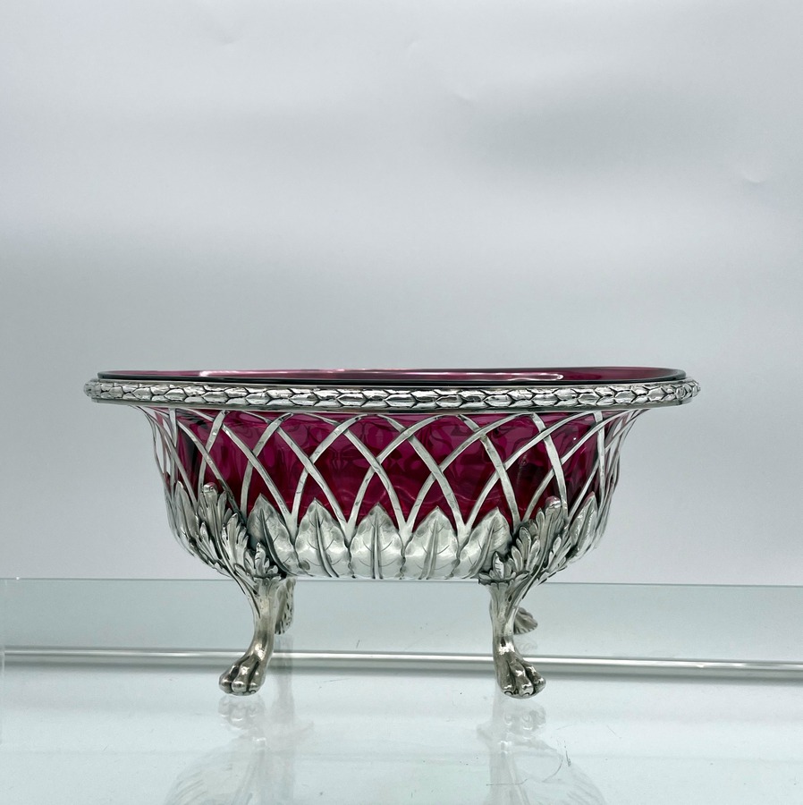 A delightful oval silver Georgian fruit dish designed with elongated lattice walls and a gorgeous laurel leaf underbelly. Â The dish stand s on four cast claw feet and has a detachable lilac coloured star cut crystal bowl.