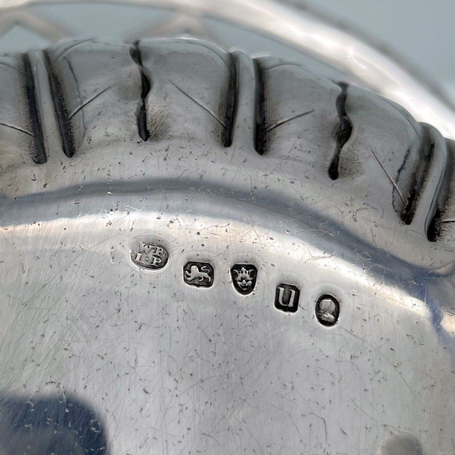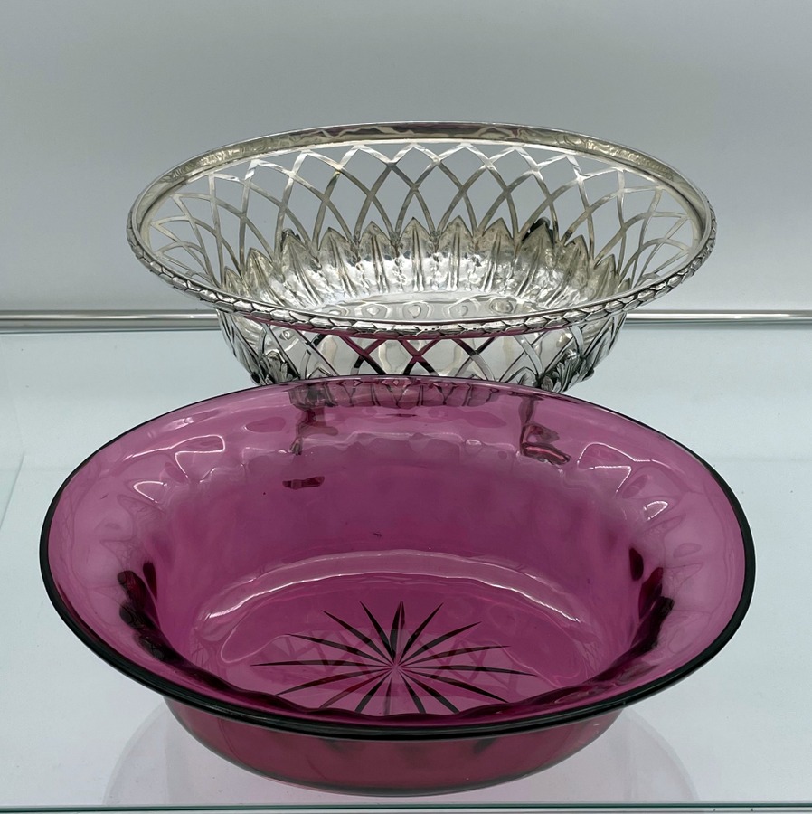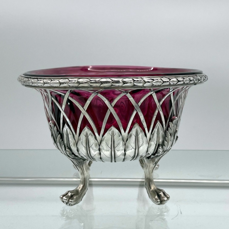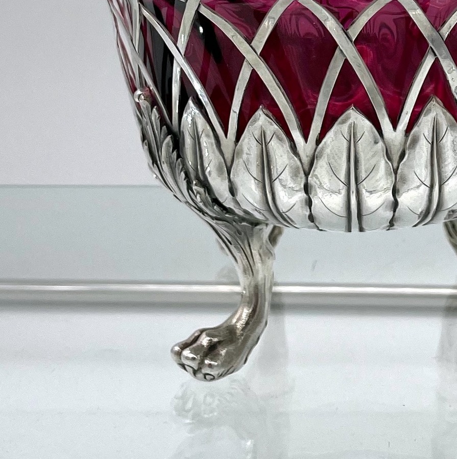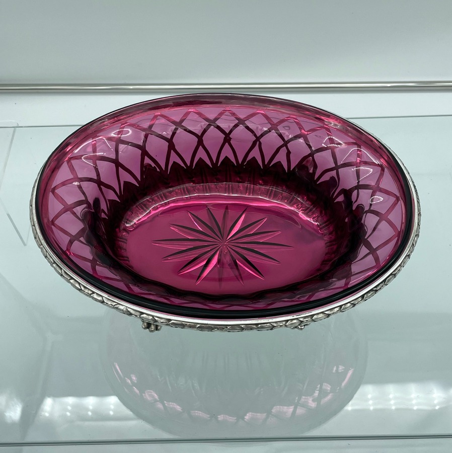 A delightful oval silver Georgian fruit dish designed with elongated lattice walls and a gorgeous laurel leaf underbelly. Â The dish stand s on four cast claw feet and has a detachable lilac coloured star cut crystal bowl.