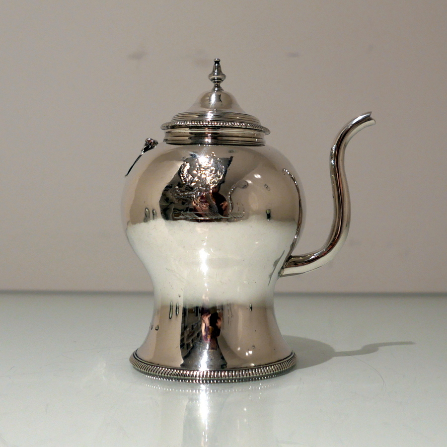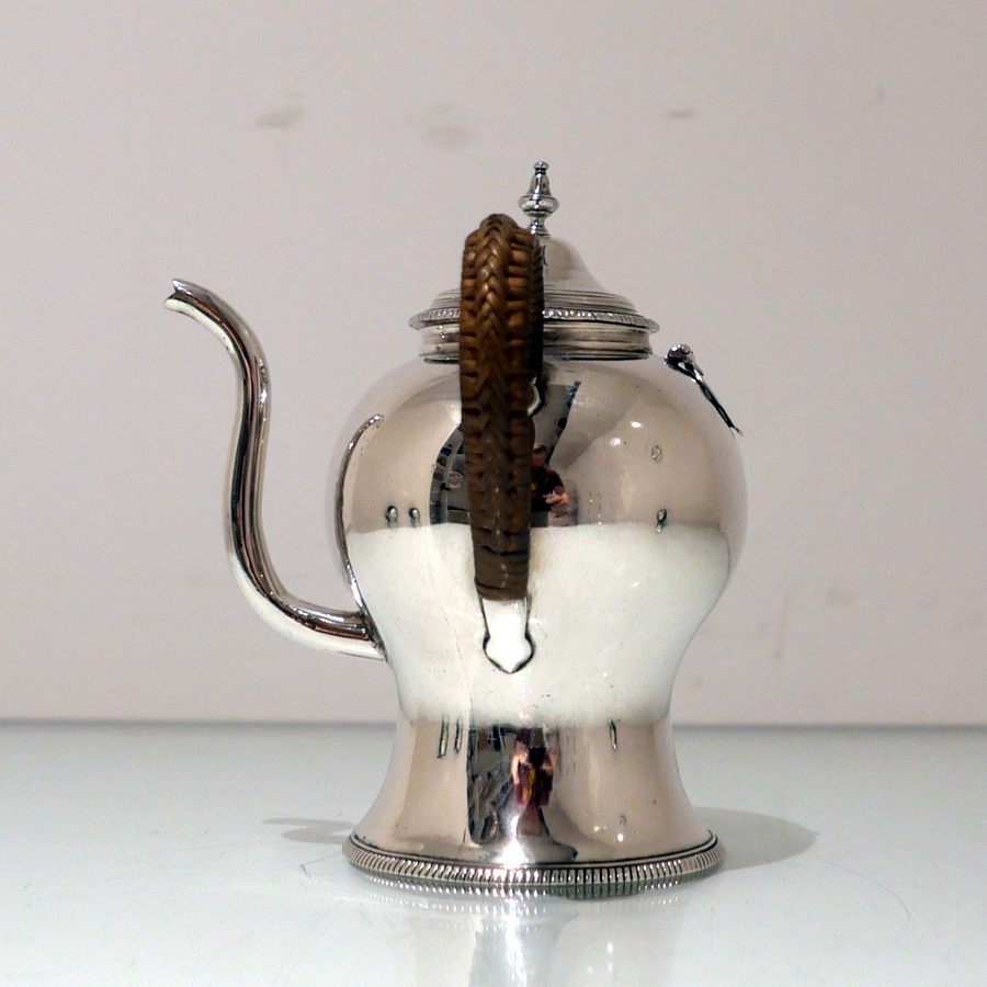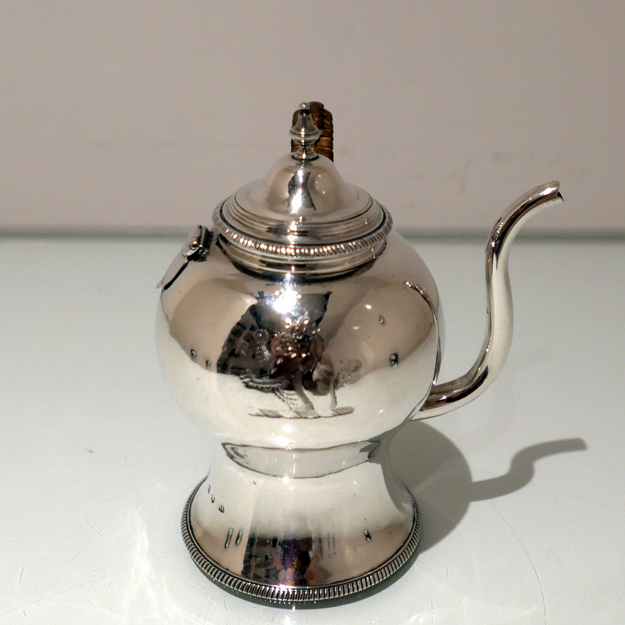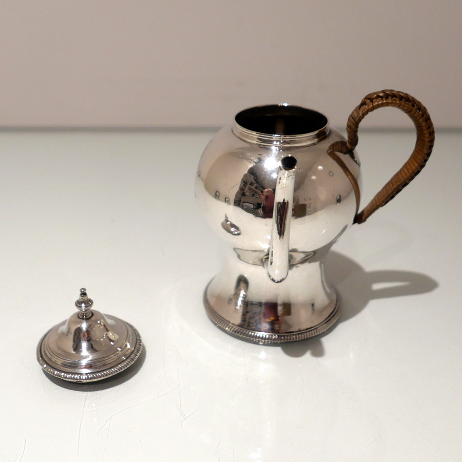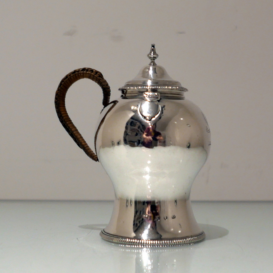 A lovely antique George III silver gravy argyle with an elegant baluster shaped upper body and a waisted lower section sitting on wide flat bottomed base.  The rim of the base and the neck are decorated with classic applied  gadroon wire borders.  The scroll formed handle is covered with woven wicker.  The argyle has a stylish contemporary hand engraved lions crest for importance.