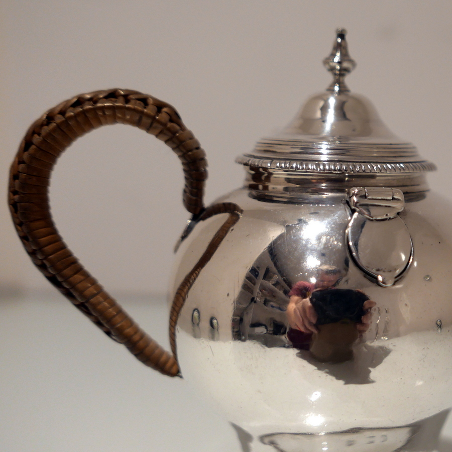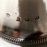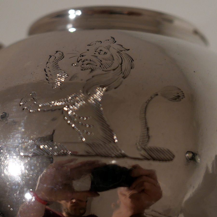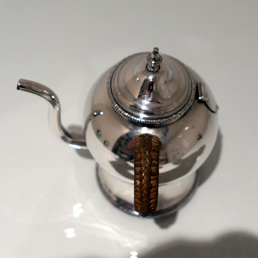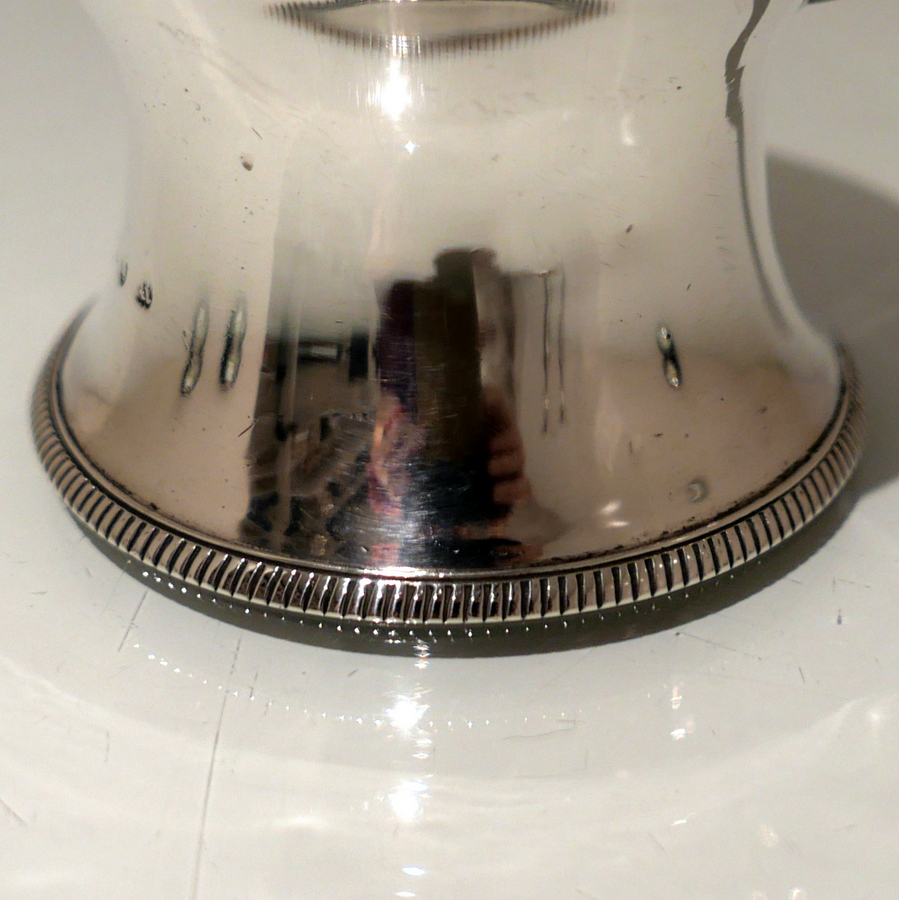 A lovely antique George III silver gravy argyle with an elegant baluster shaped upper body and a waisted lower section sitting on wide flat bottomed base.  The rim of the base and the neck are decorated with classic applied  gadroon wire borders.  The scroll formed handle is covered with woven wicker.  The argyle has a stylish contemporary hand engraved lions crest for importance.