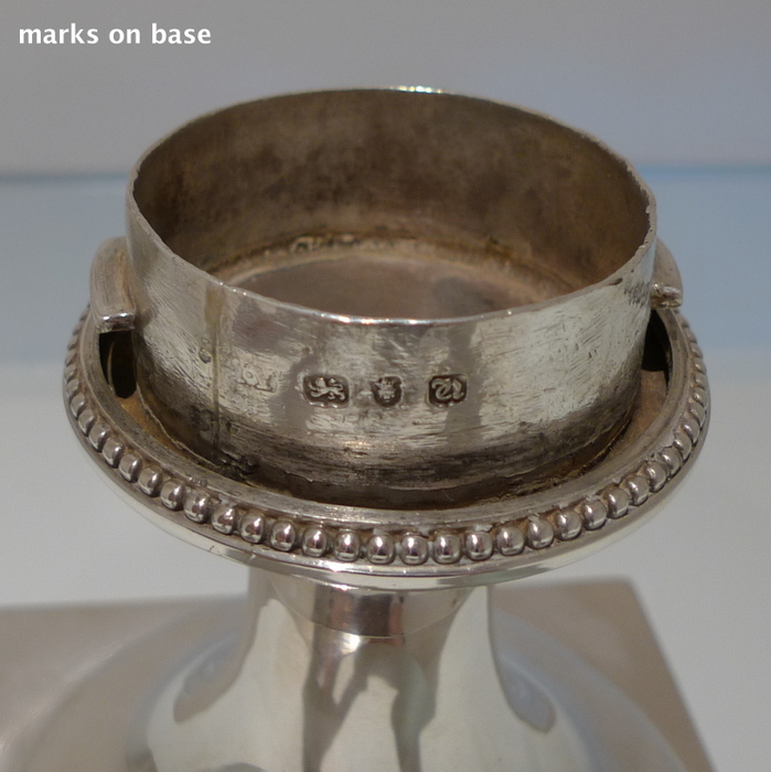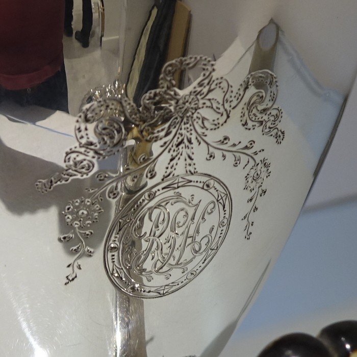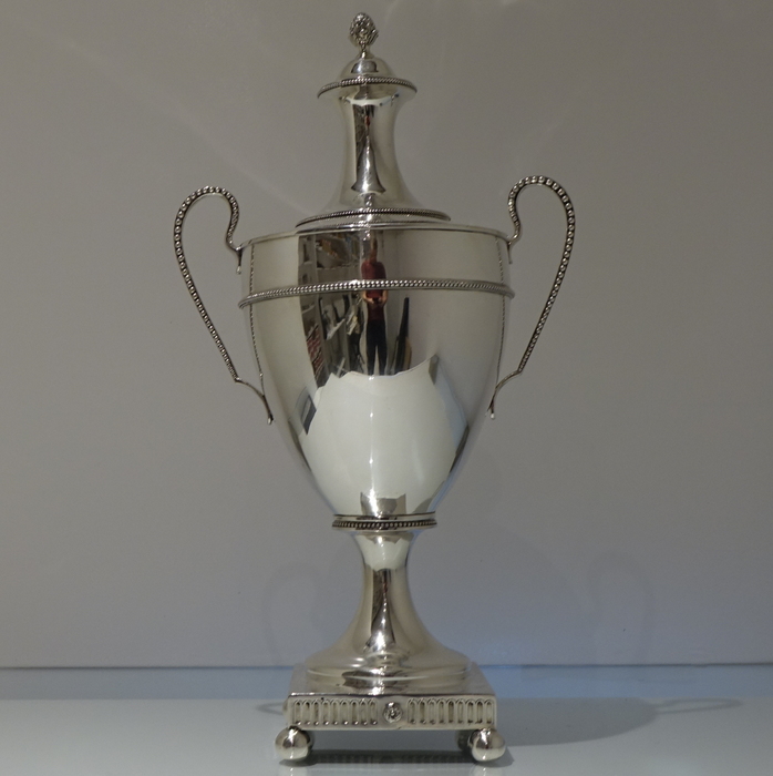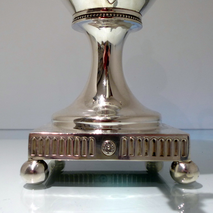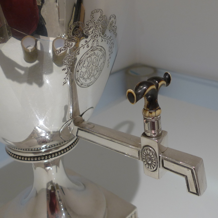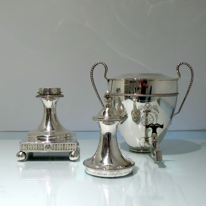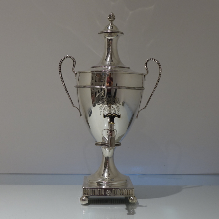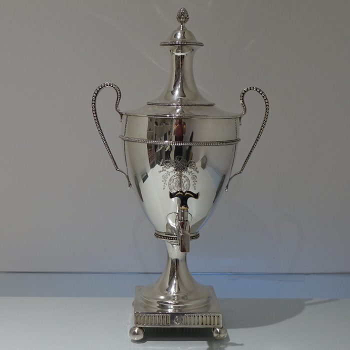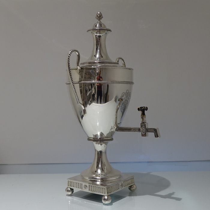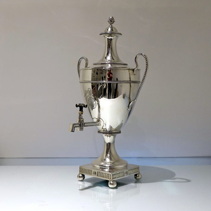 A stylish 18th century vase shaped tea urn with elegant bead borders for highlights. Â The foot is attached with a bayonet (swivel) action and has elegant decoration for lowlights. Â There is an elegant contemporary armorial for importance.