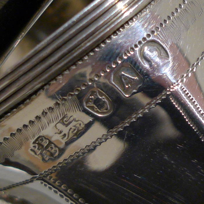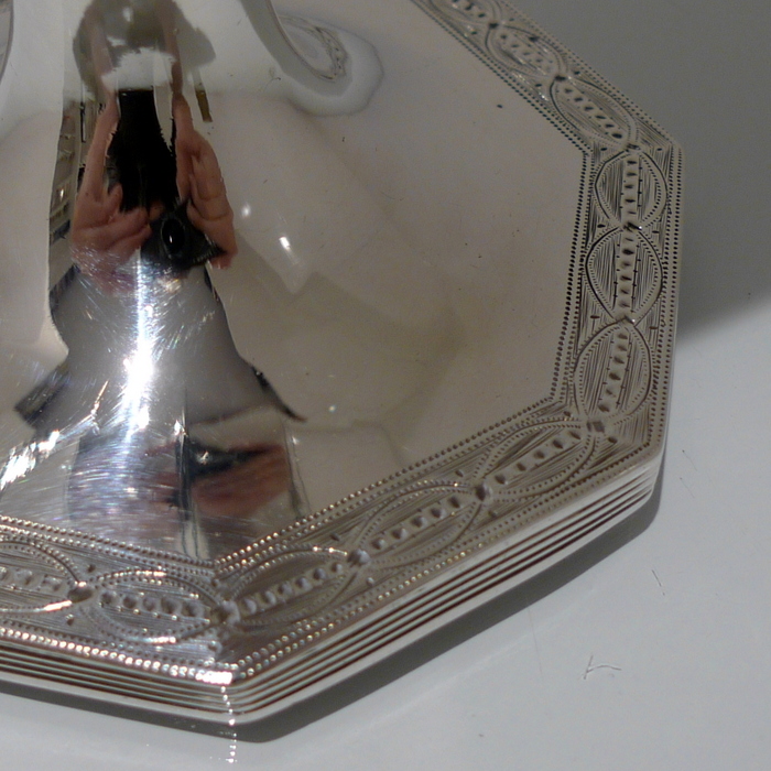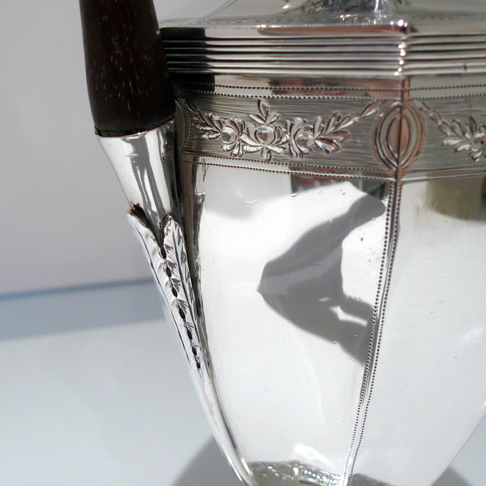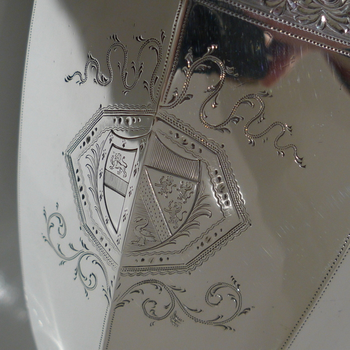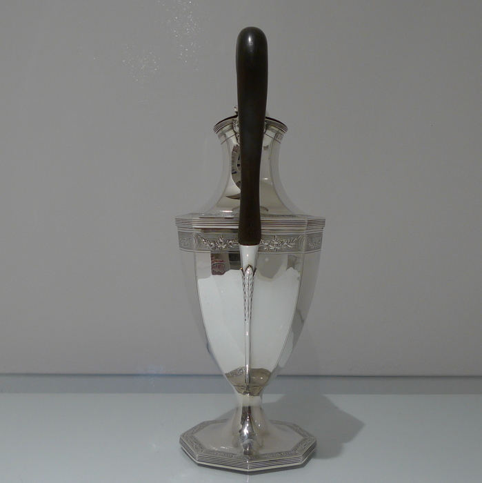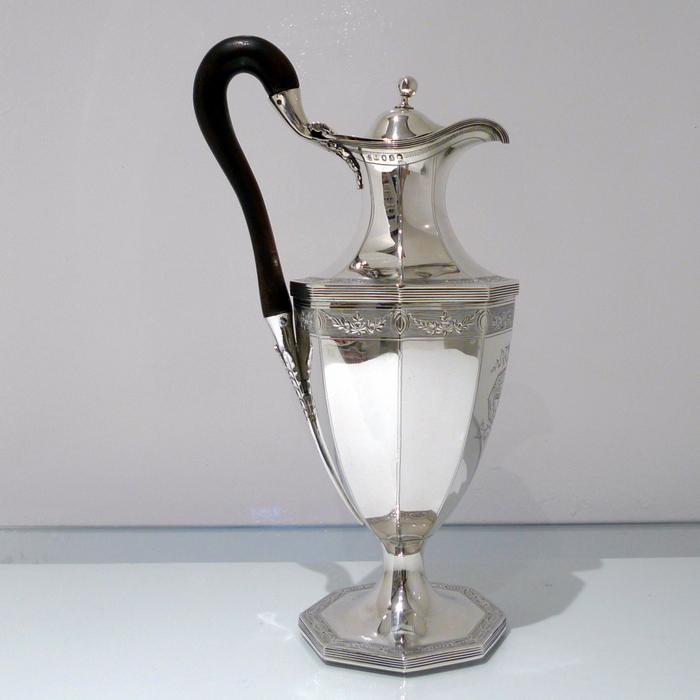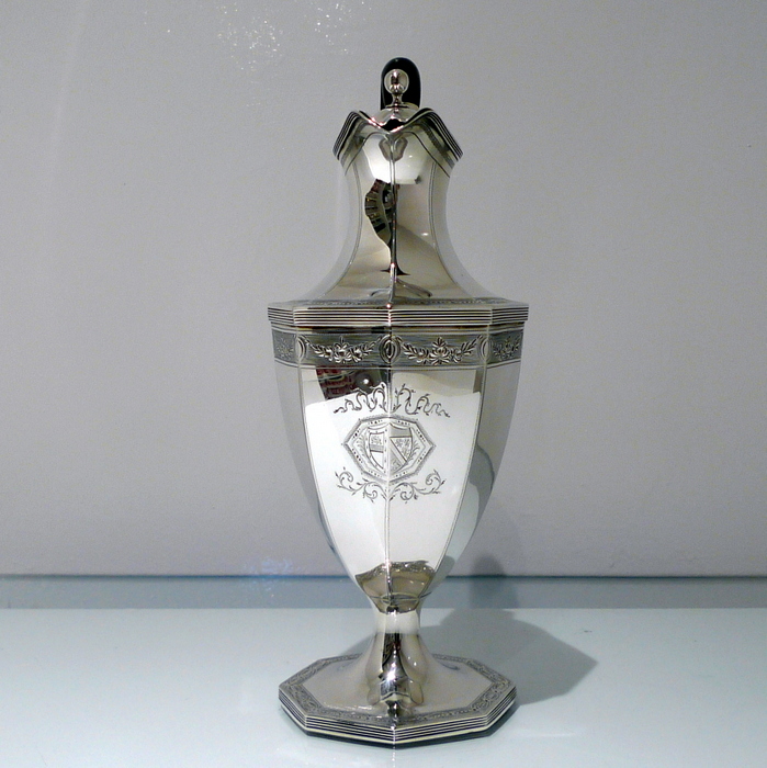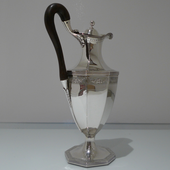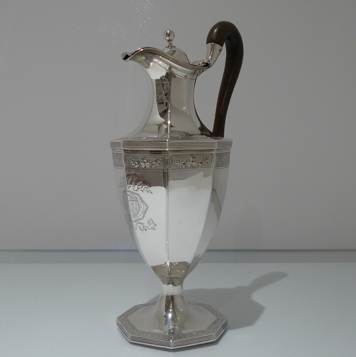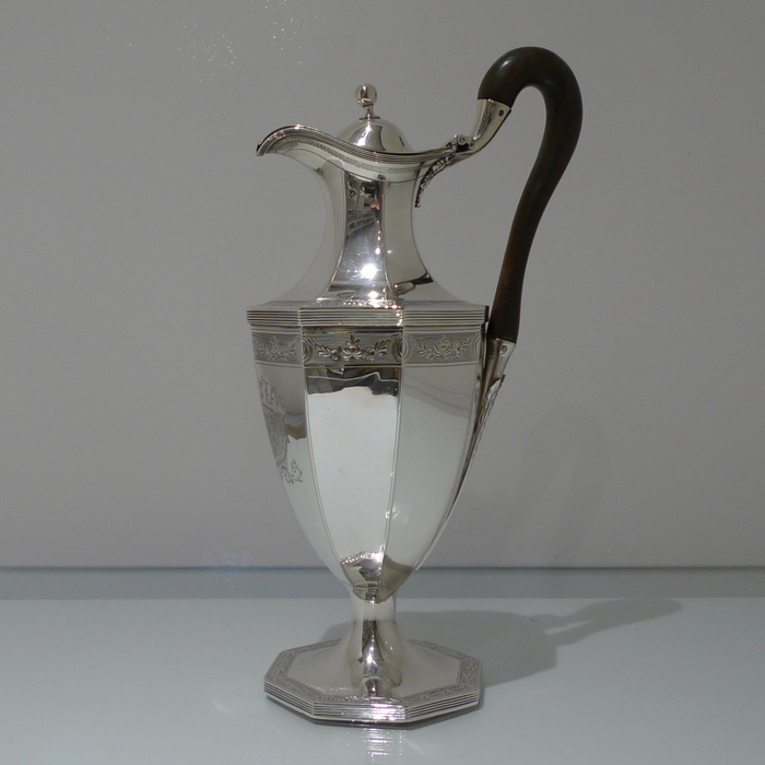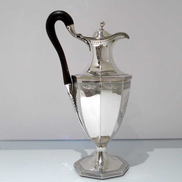 A very rare 18th century bright cut engraved wine/hot water jug. The jug has a stunning contemporary armorial engraved on the centre front of the body for importance. The lid is hinged and the impressive applied fruitwood scroll handle adds to the beauty of a superbly designed article.