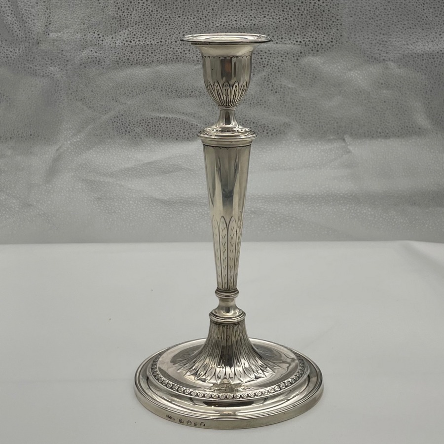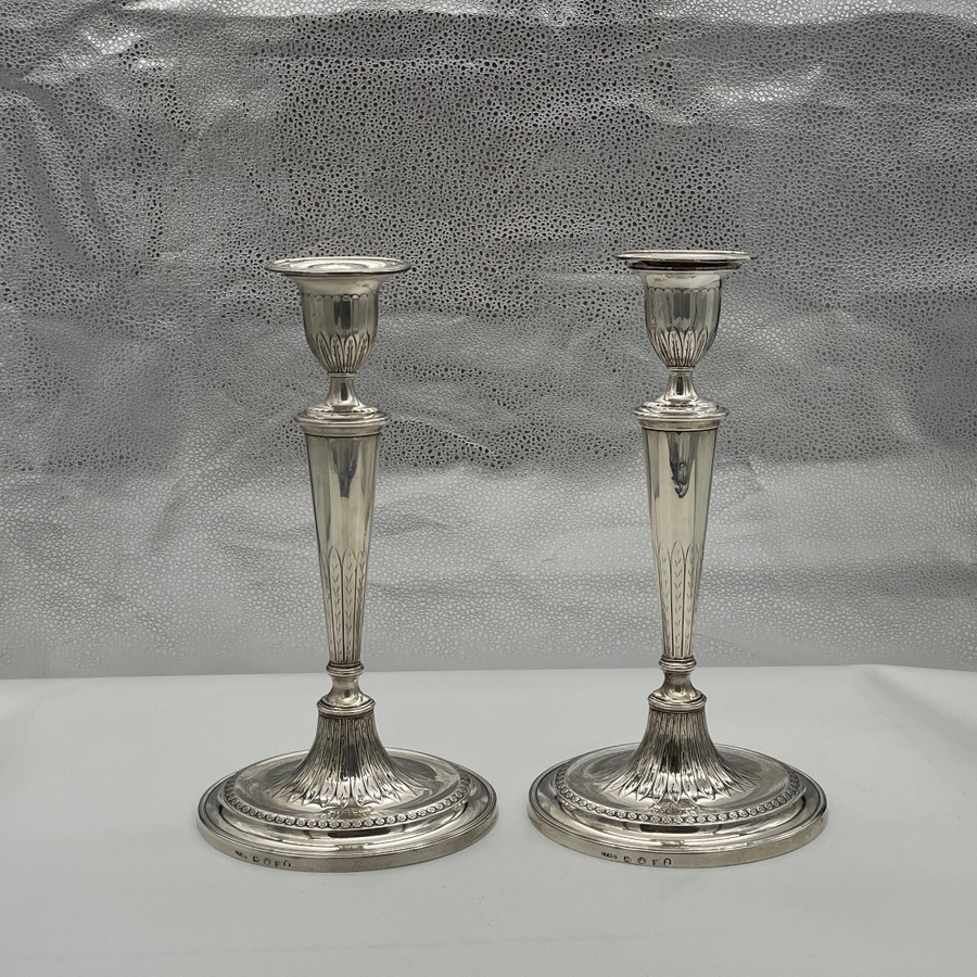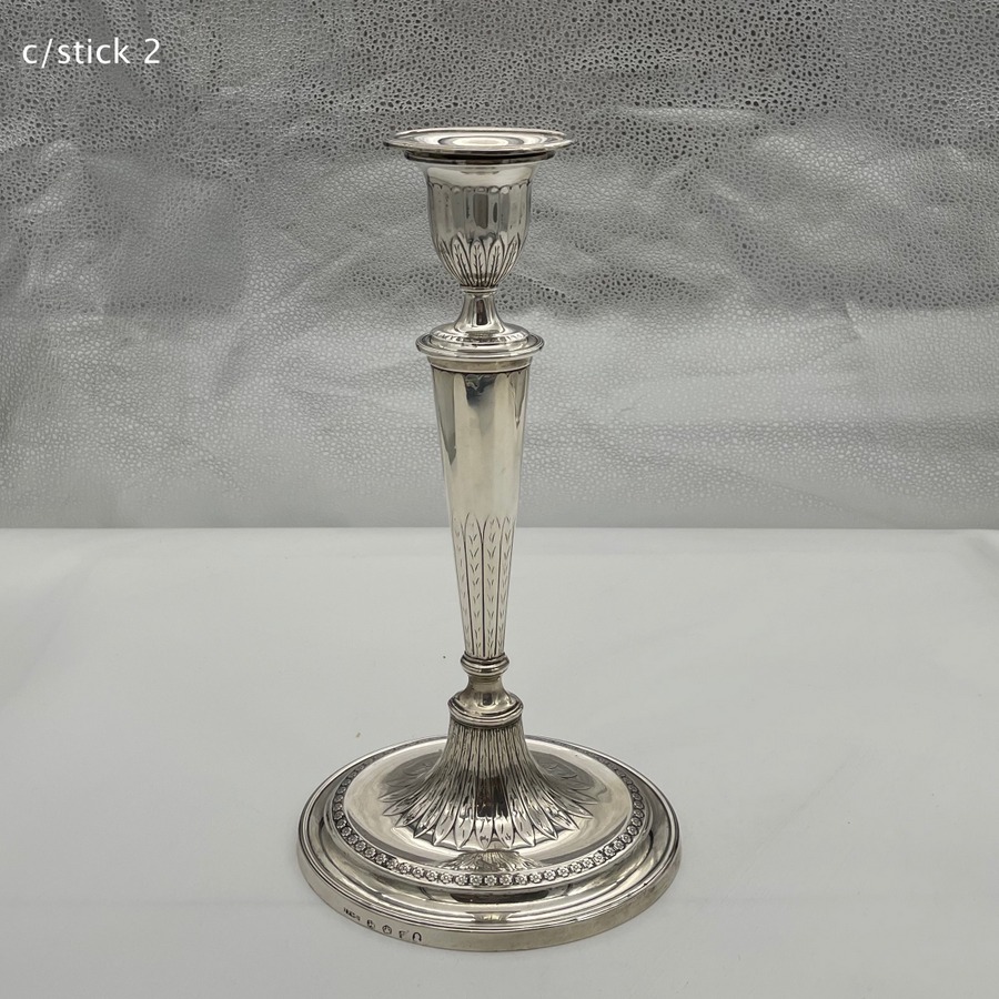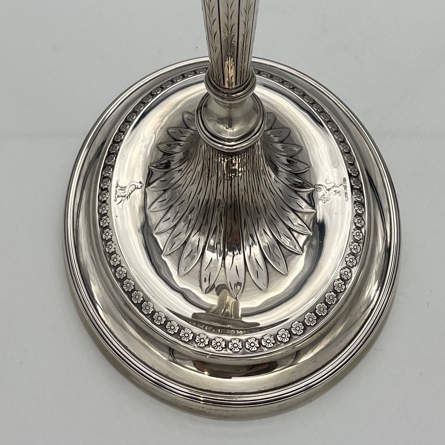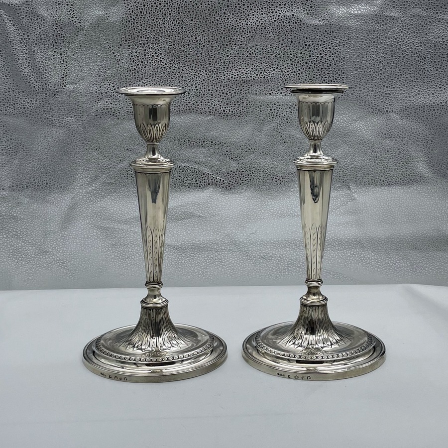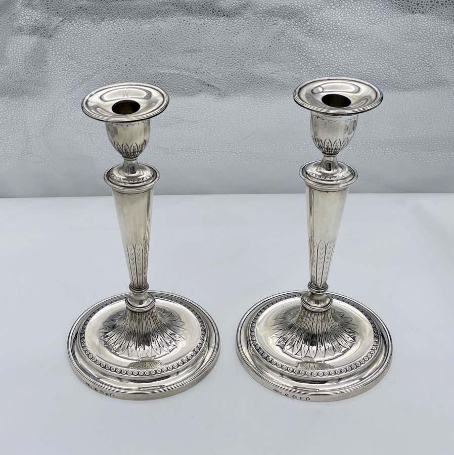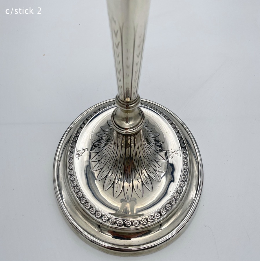 A wonderful pair of Adam style Georgian silver candlesticks designed with elegant oval bases which are beautifully decorated with climbing leaves which is then repeated on the stems and capitals. Â There is a truly fabulous rosette themed gallery border for lowlights and hand engraved contemporary crests for importance.
