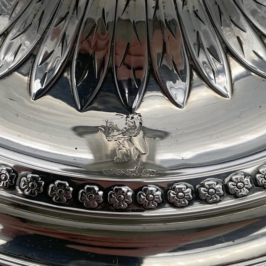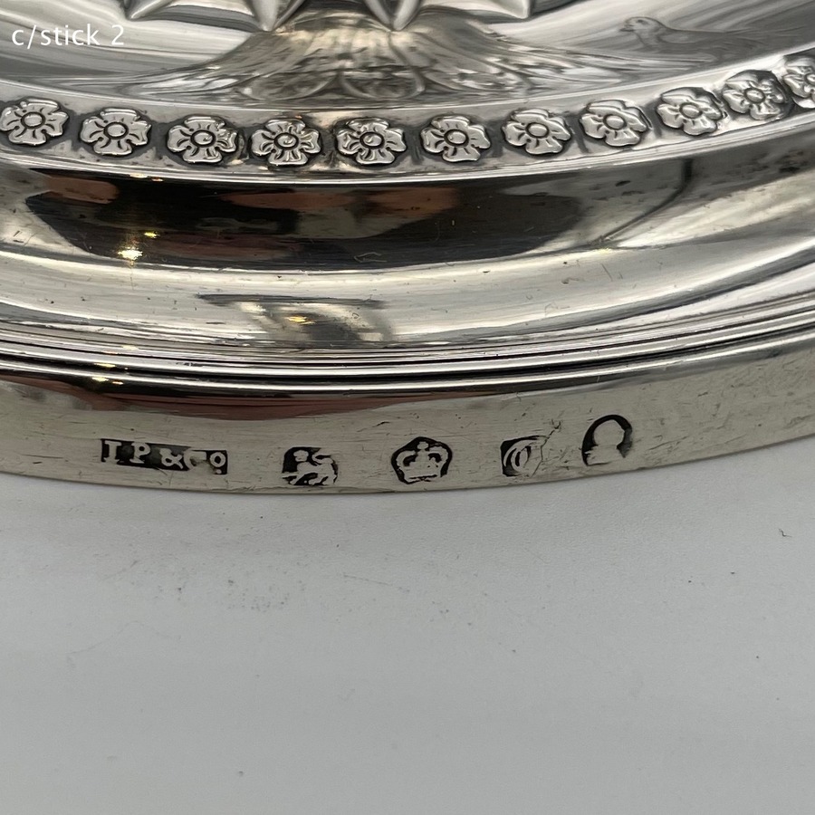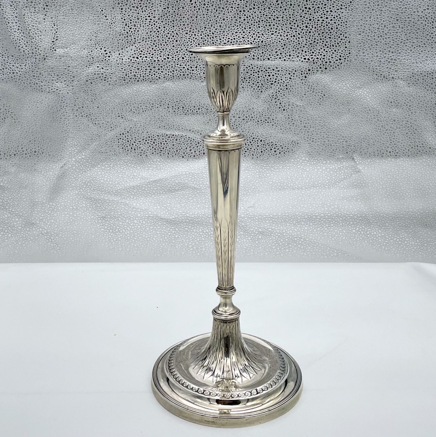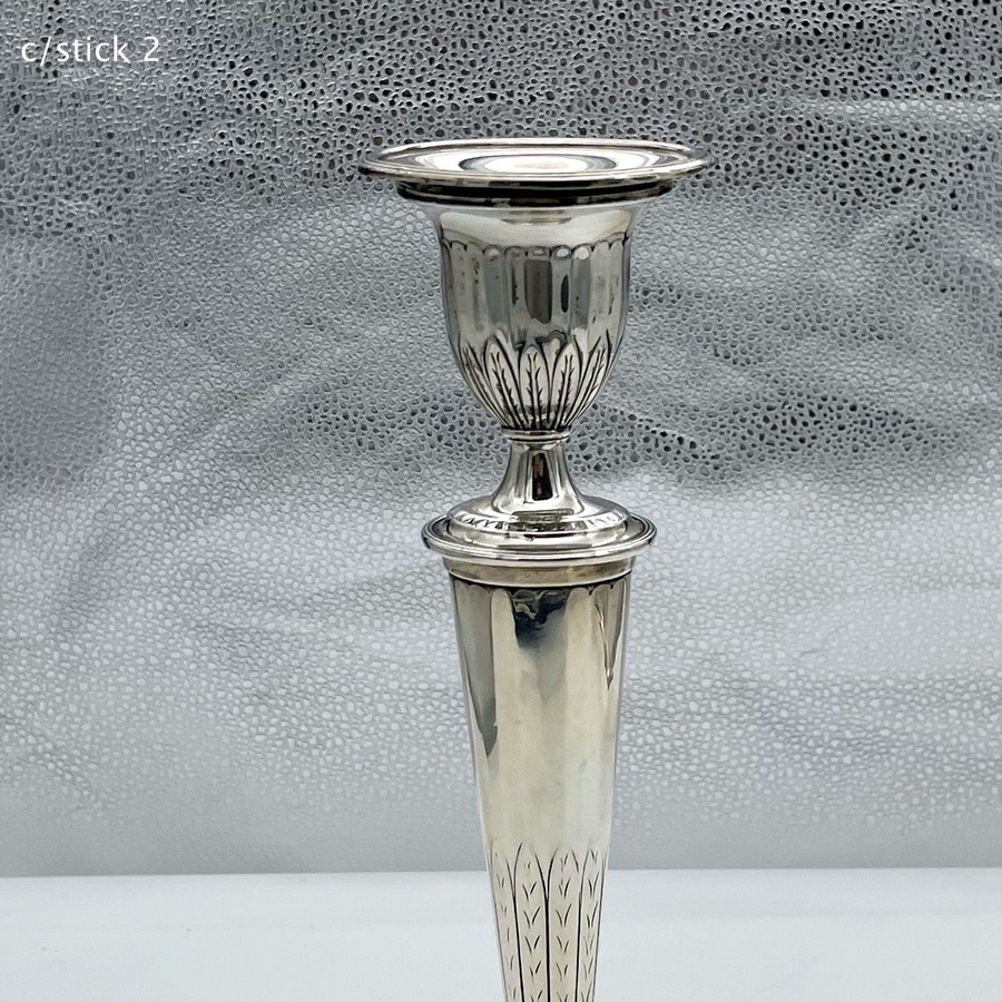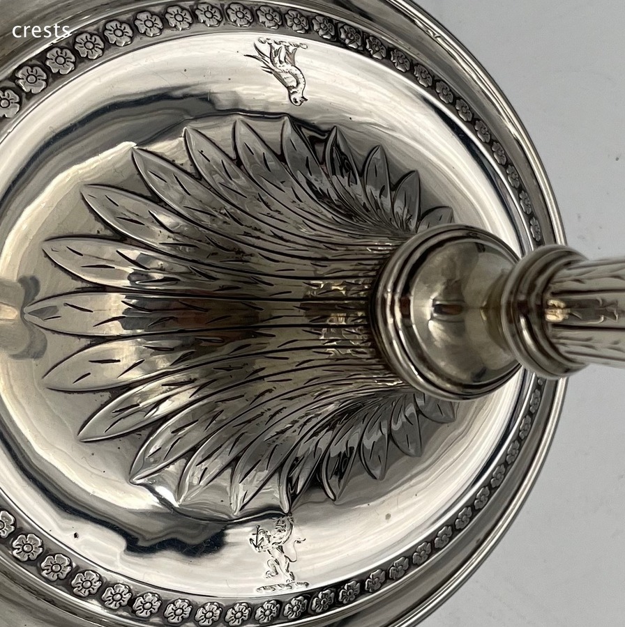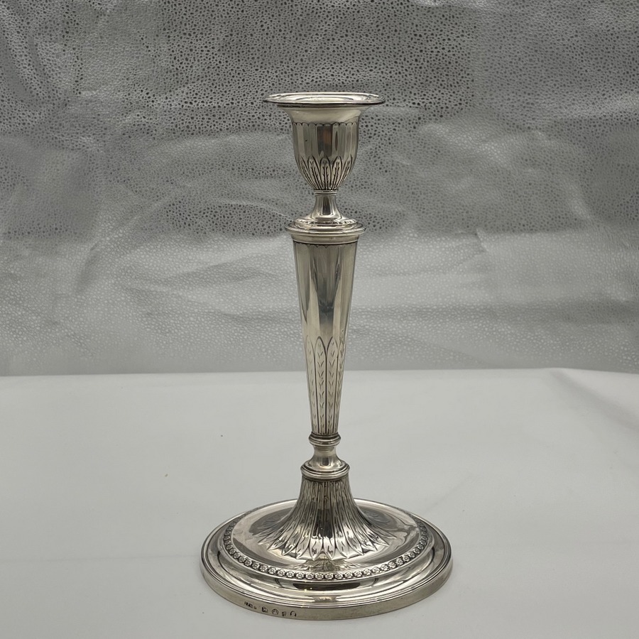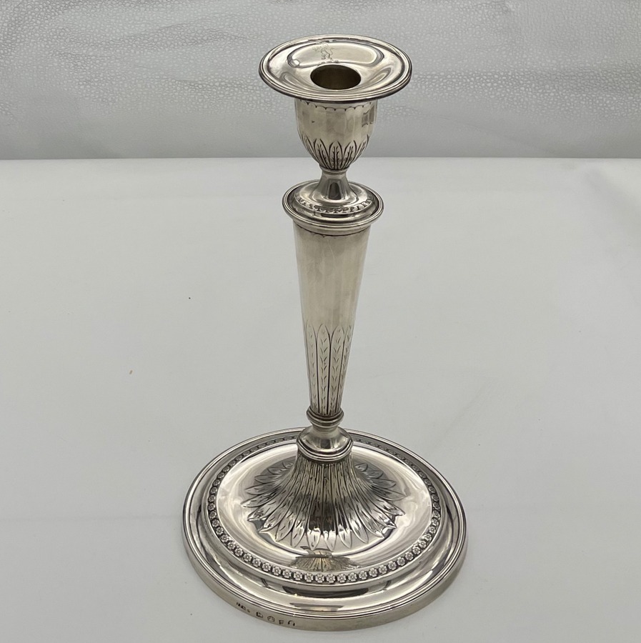 A wonderful pair of Adam style Georgian silver candlesticks designed with elegant oval bases which are beautifully decorated with climbing leaves which is then repeated on the stems and capitals. Â There is a truly fabulous rosette themed gallery border for lowlights and hand engraved contemporary crests for importance.