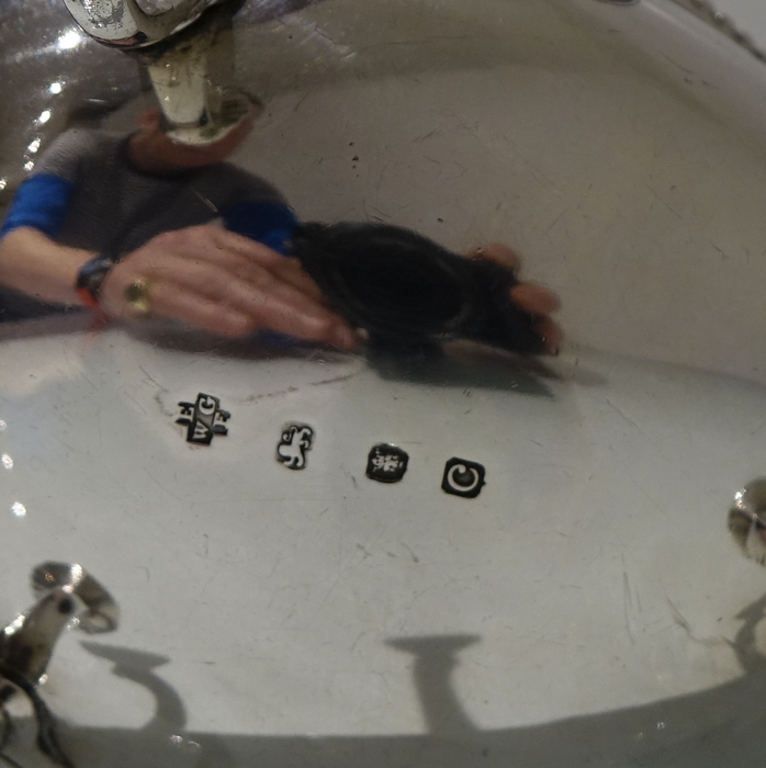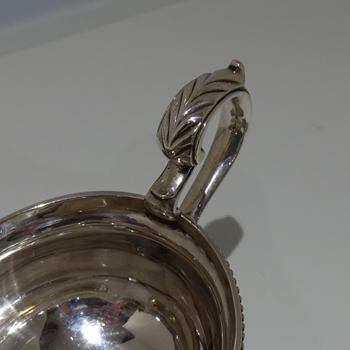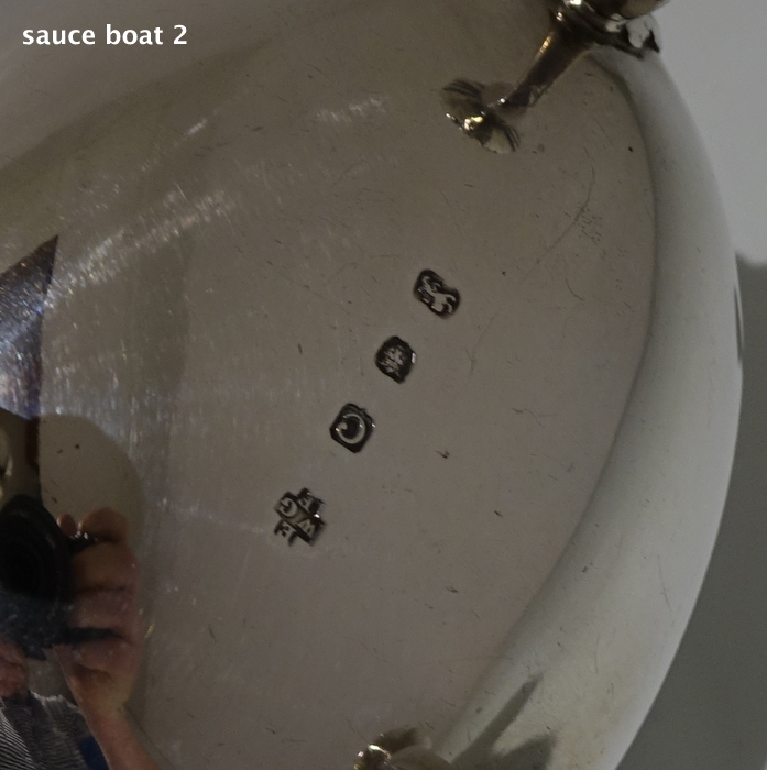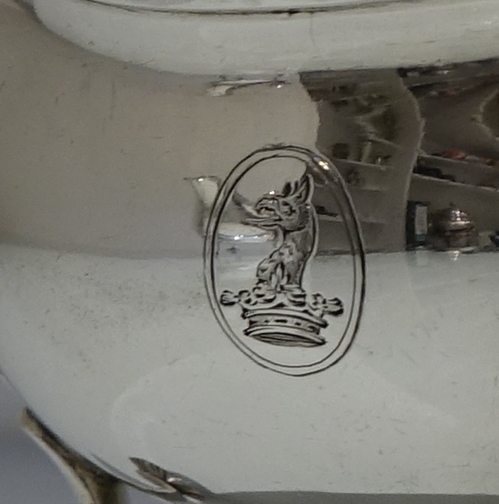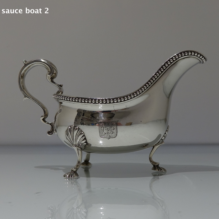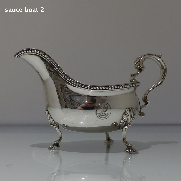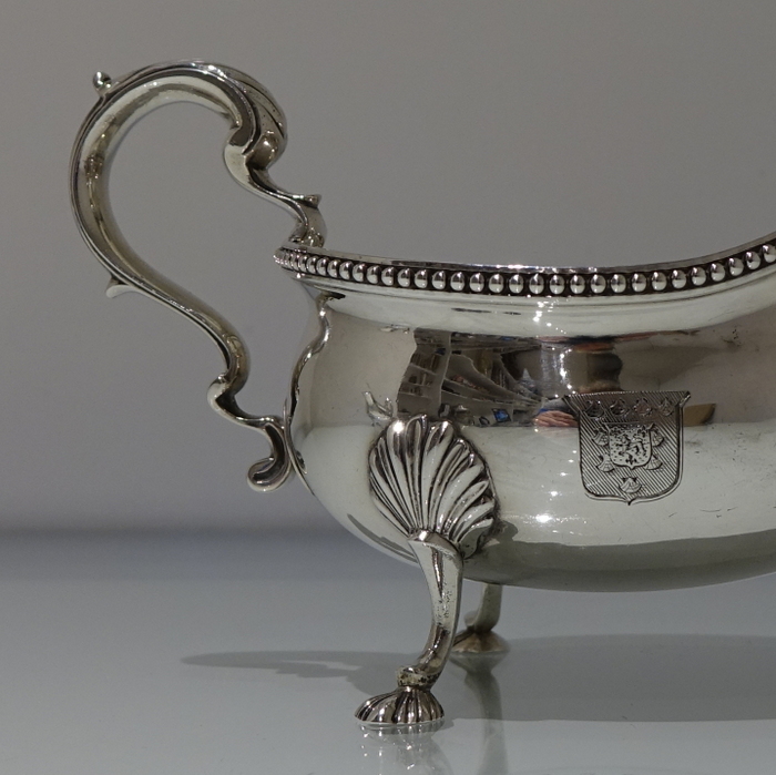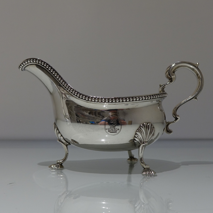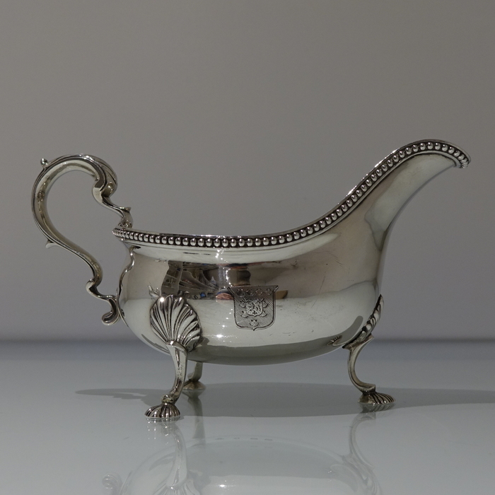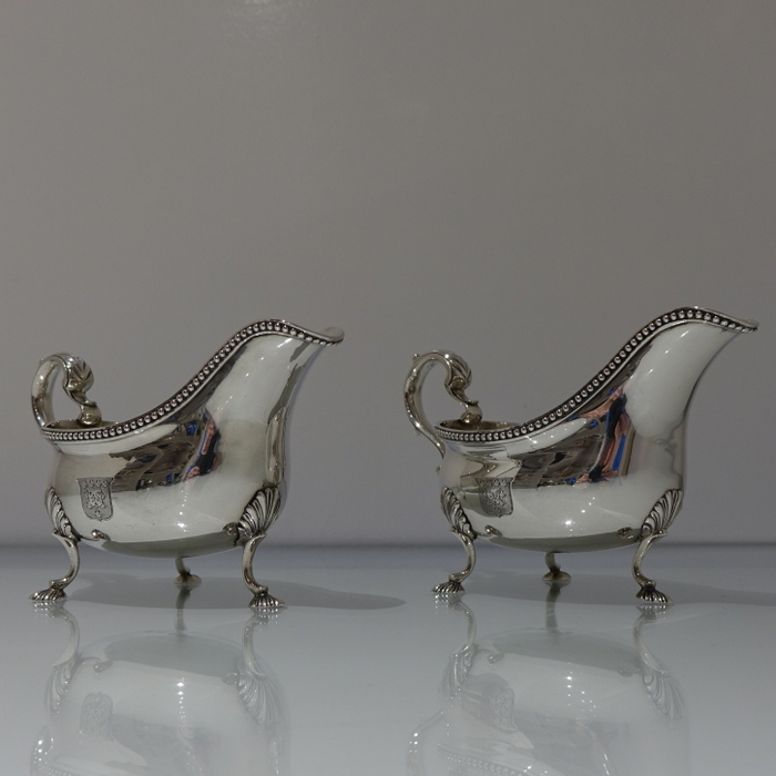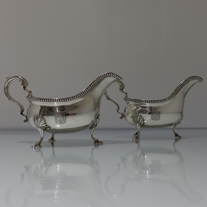 A stylish pair of 18th century bead border sauce boats sitting on three ornate feet. Â The handles are scroll in design and are crowned with elegant thumb pieces. Â There is both a contemporary armorial and crest for importance.