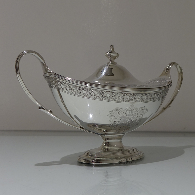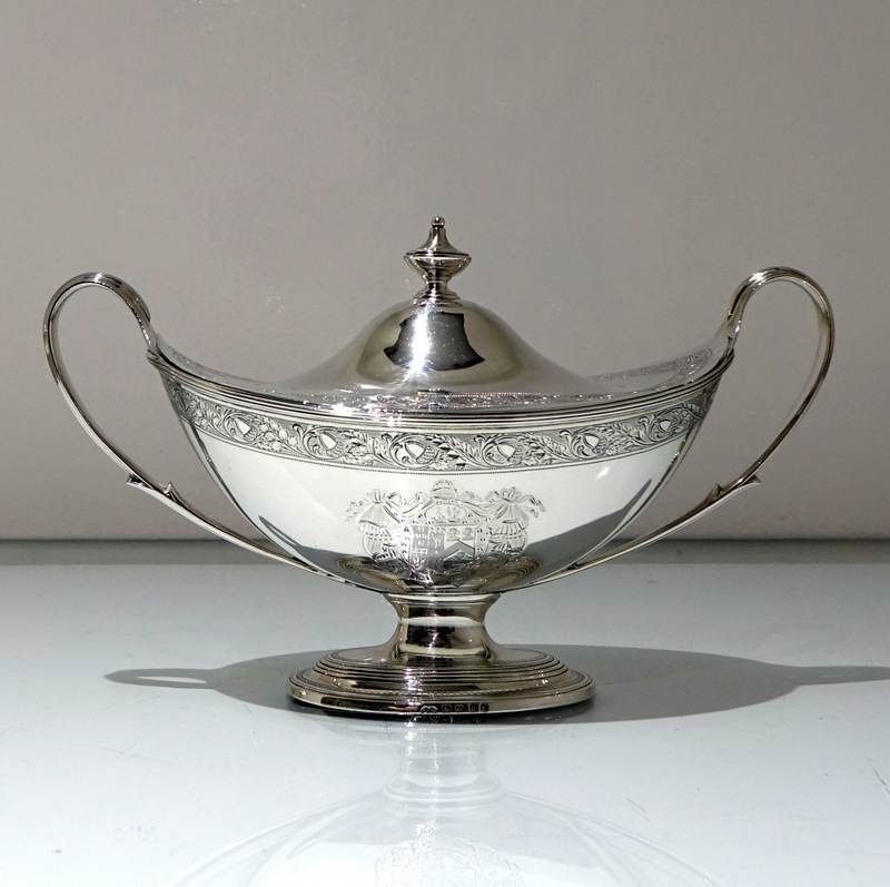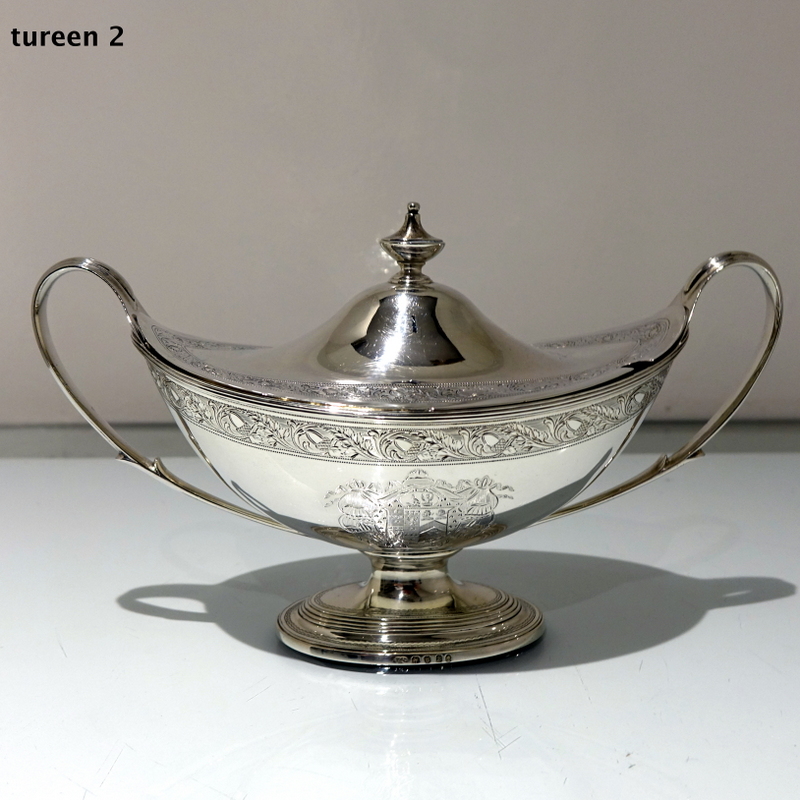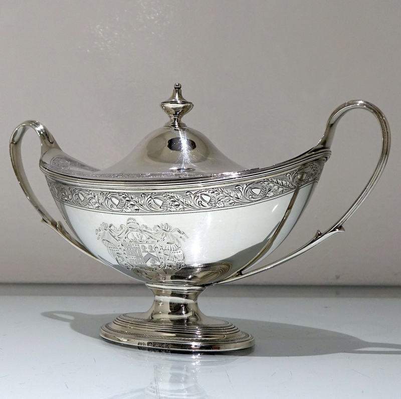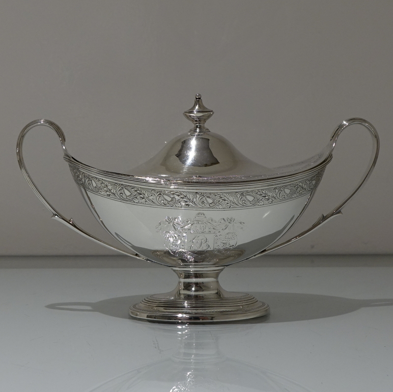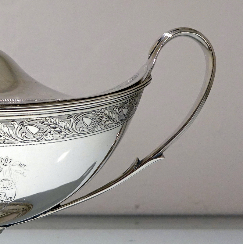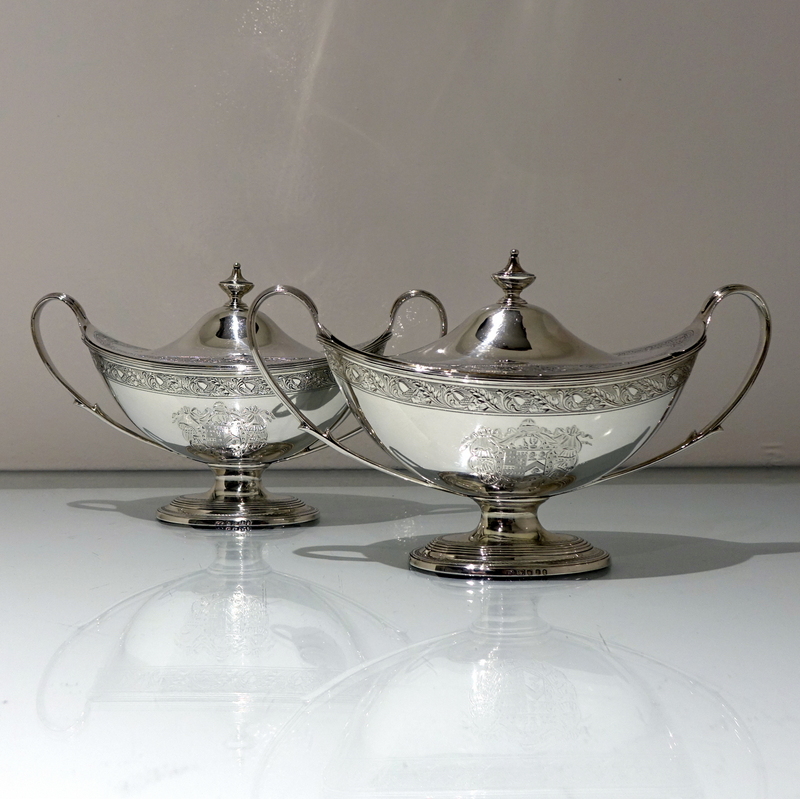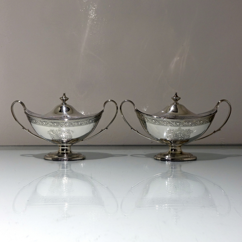 A stunning pair of 18th century boat shaped sauce tureens with detachable lids. Â The body of the tureens have a beautiful upper band of intricate bright cut engraving for highlights. Â The centre of both sides of the bodies have elegant contemporary armorials for importance. Â The handles are scroll formed and the feet are oval raised pedestal in design.