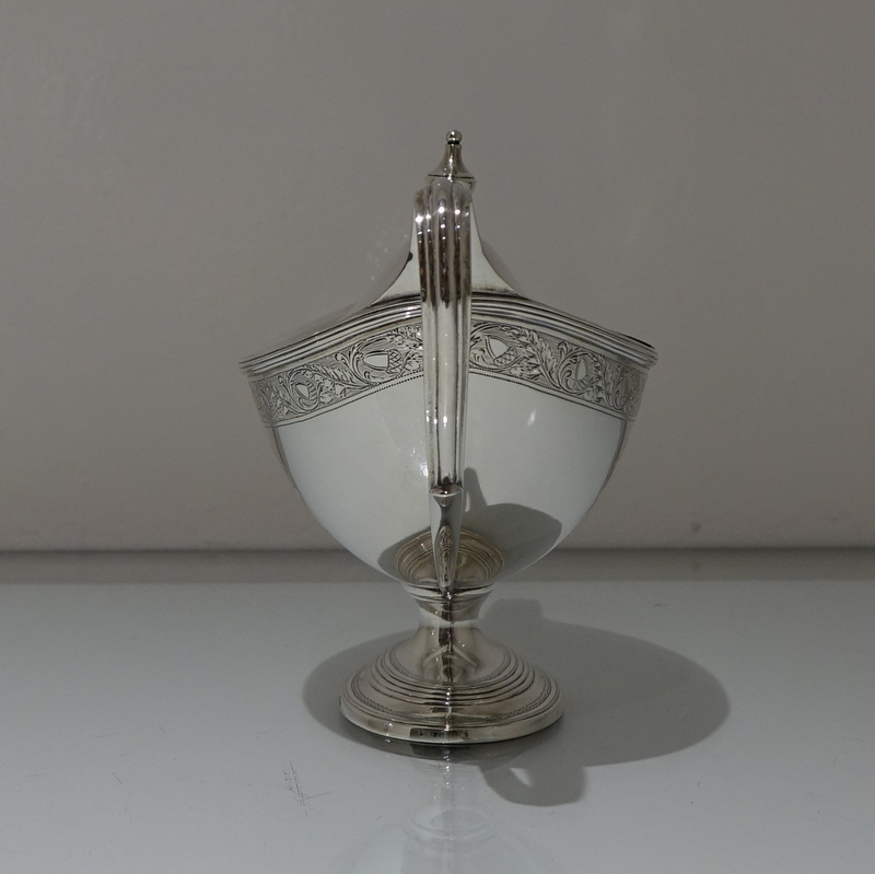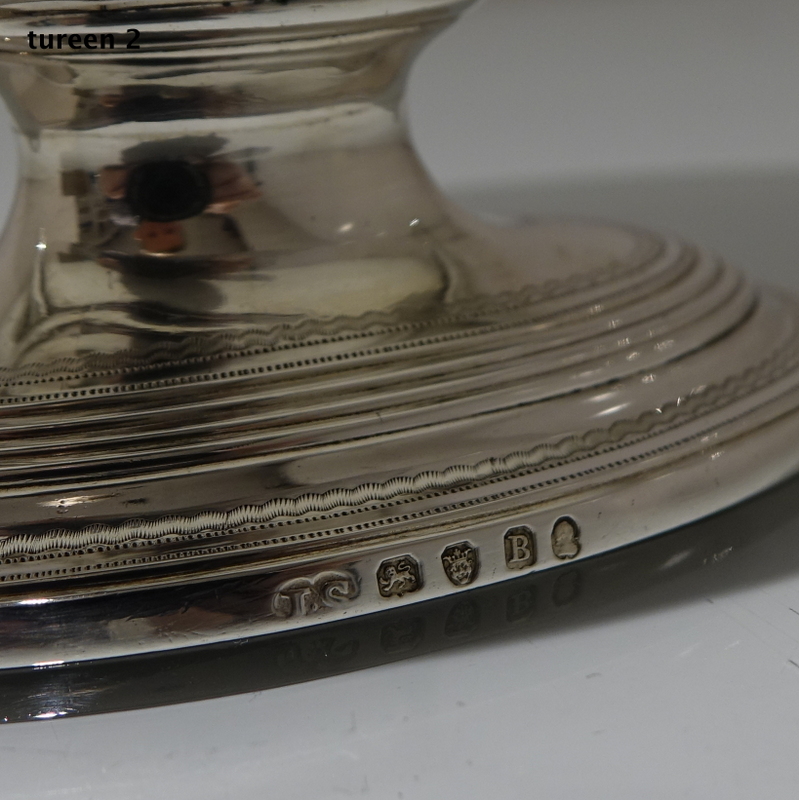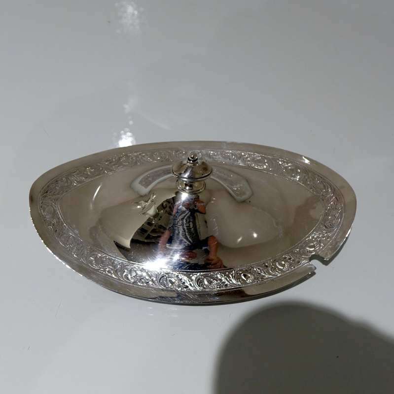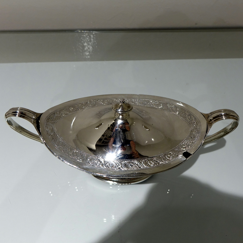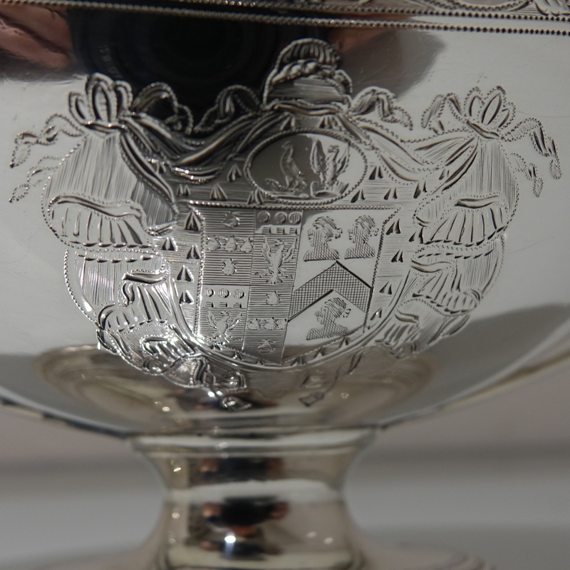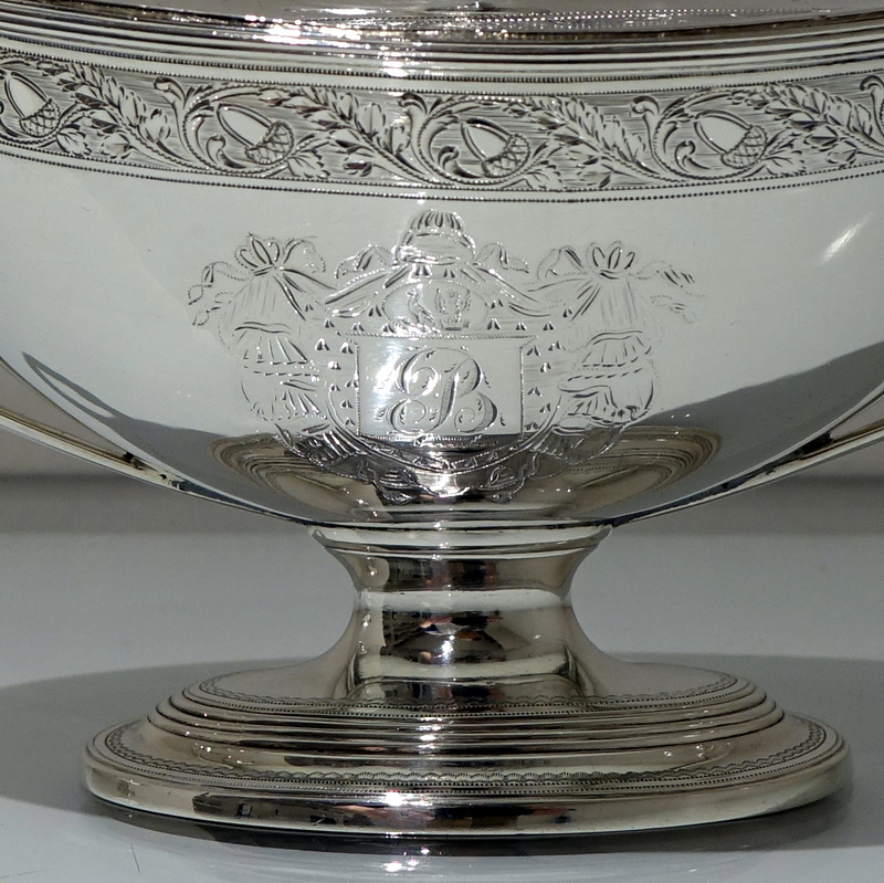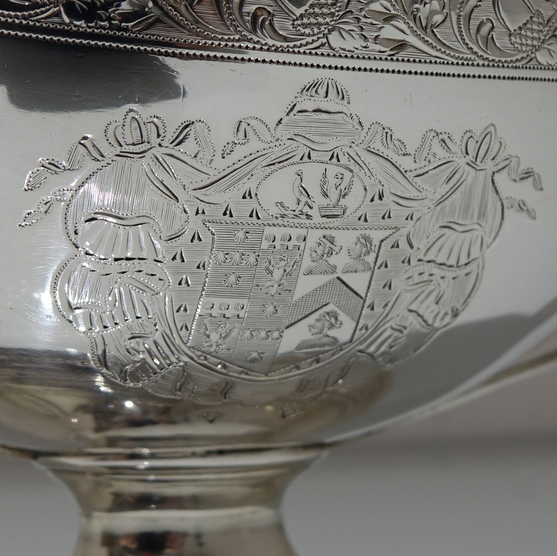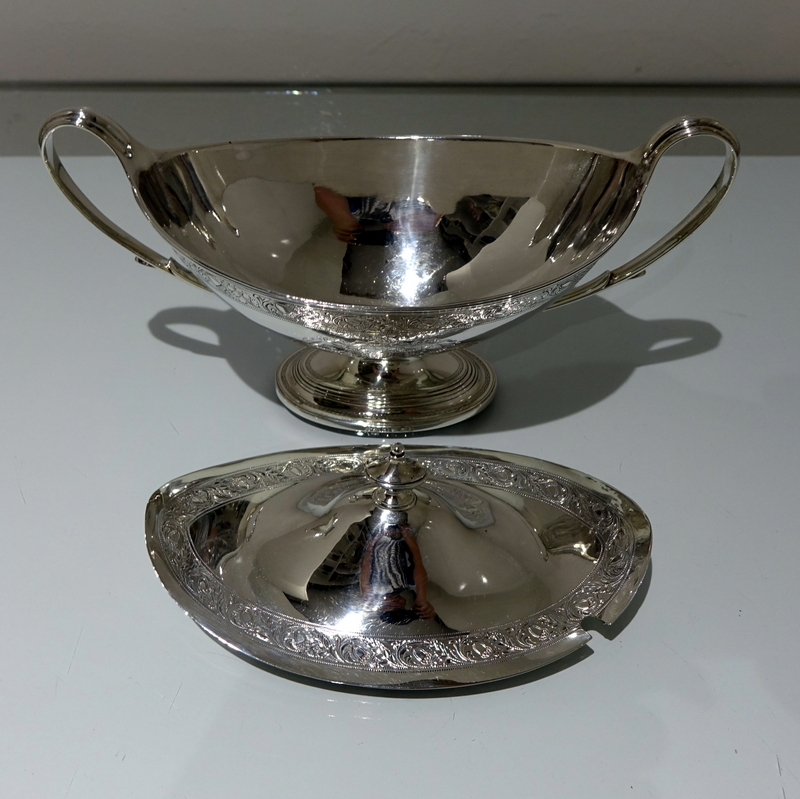 A stunning pair of 18th century boat shaped sauce tureens with detachable lids. Â The body of the tureens have a beautiful upper band of intricate bright cut engraving for highlights. Â The centre of both sides of the bodies have elegant contemporary armorials for importance. Â The handles are scroll formed and the feet are oval raised pedestal in design.
