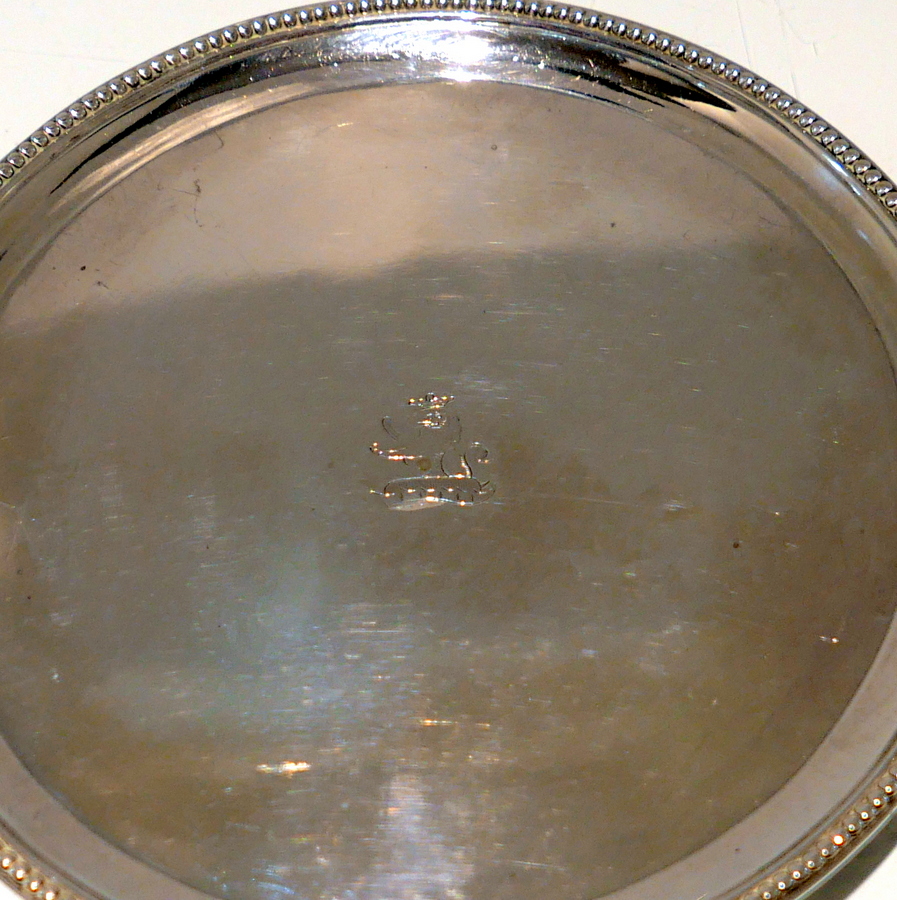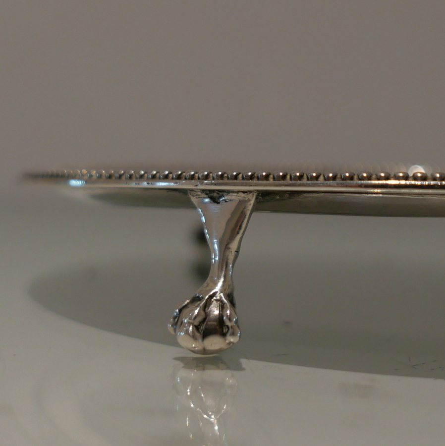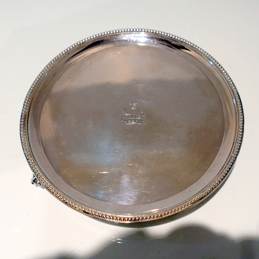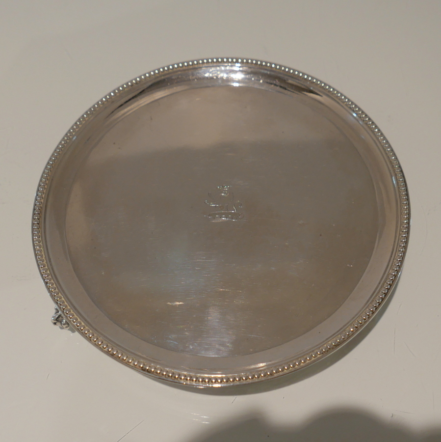 A sweet 18th century silver circular salver decorated with an outer bead border and sitting on stylish ball and claw feet. Â The centre front has a beautiful contemporary hand engraved crest for importance.