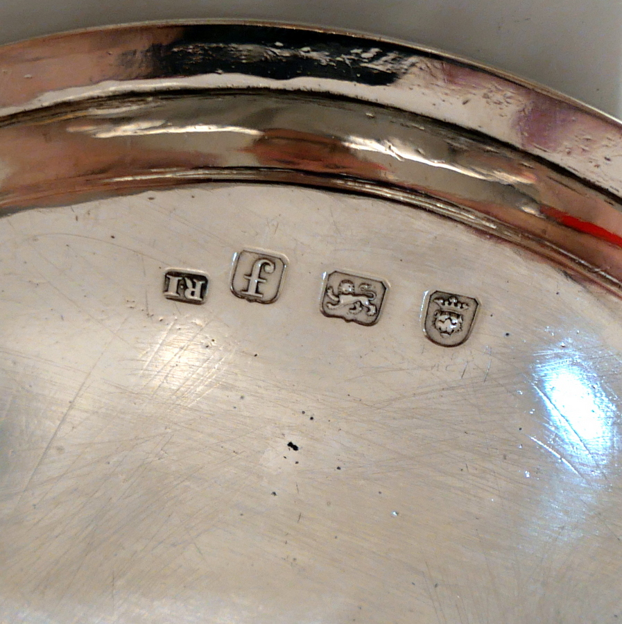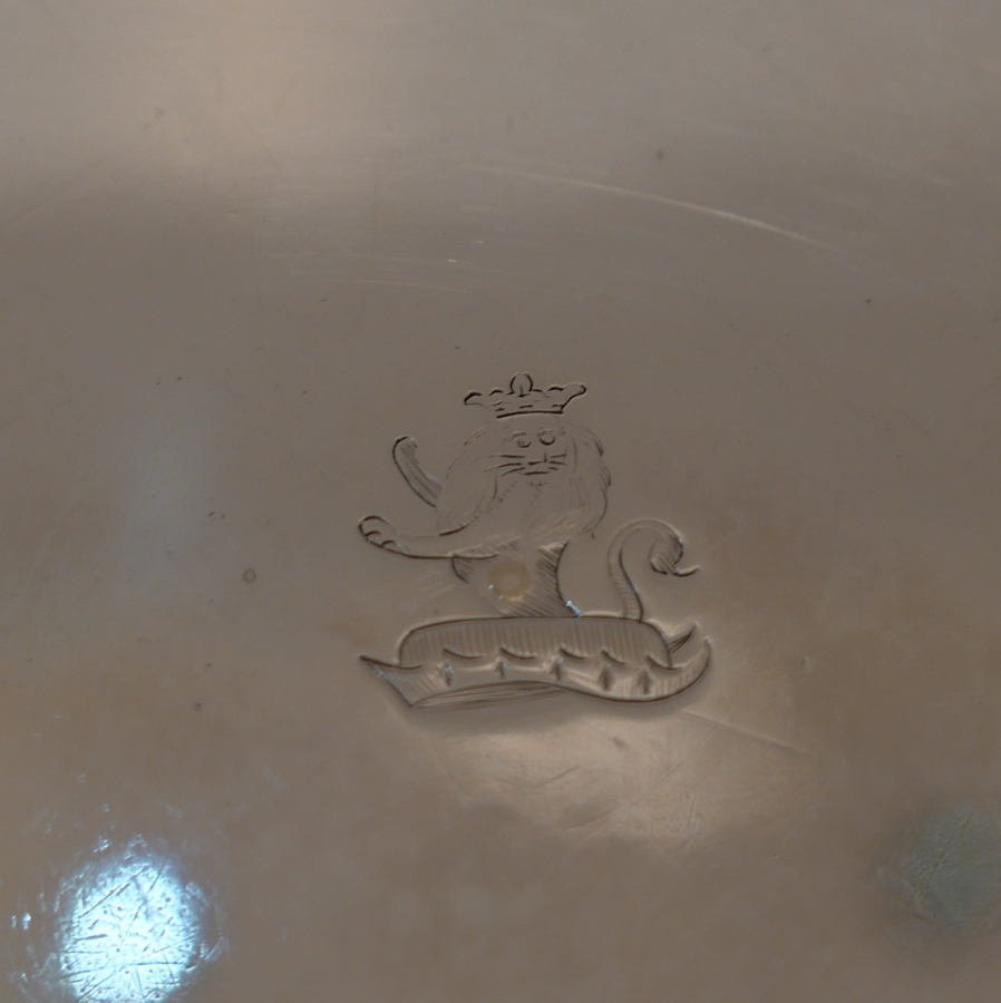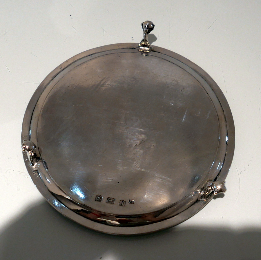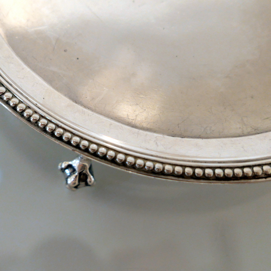 A sweet 18th century silver circular salver decorated with an outer bead border and sitting on stylish ball and claw feet. Â The centre front has a beautiful contemporary hand engraved crest for importance.