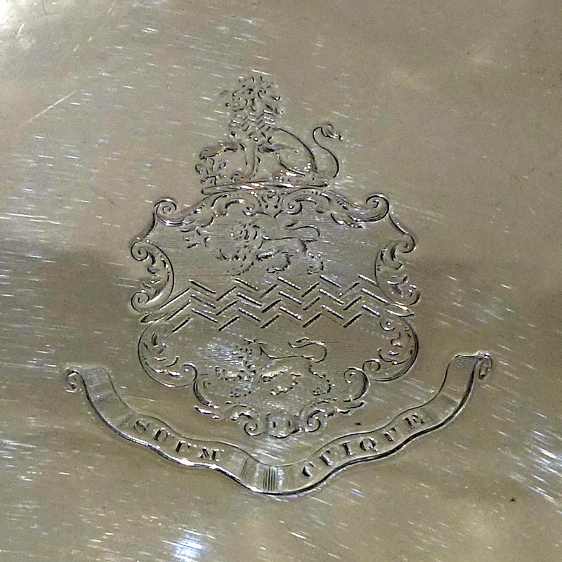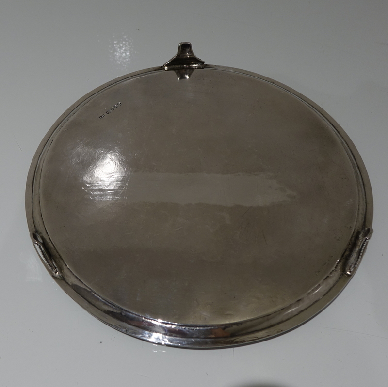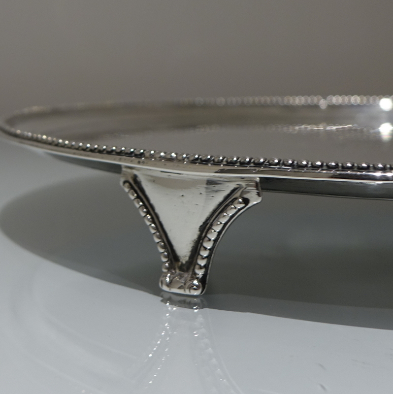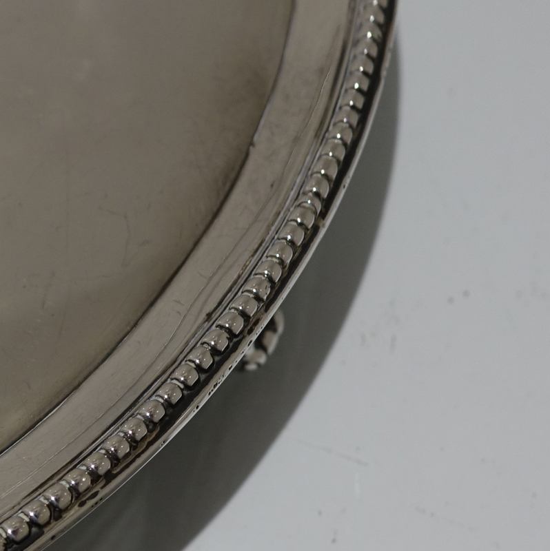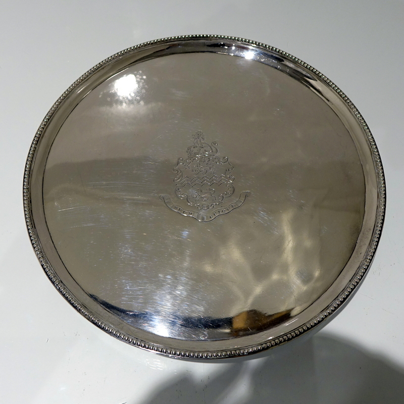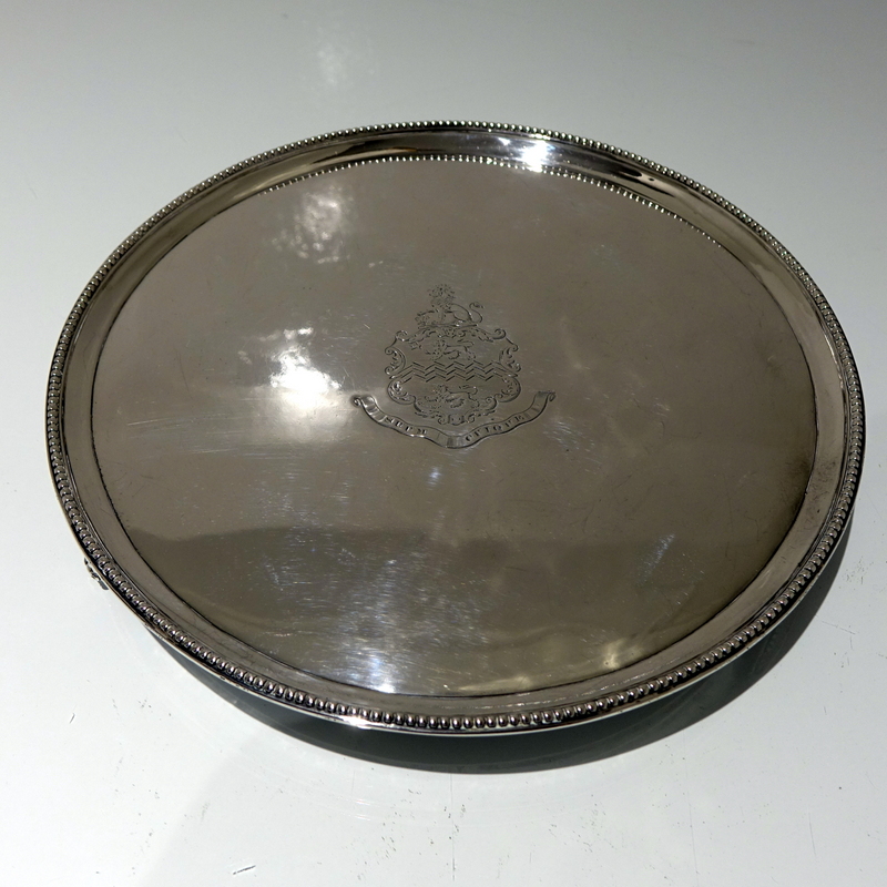 A stylish 18th century circular salver decorated with an outer applied bead border. Â The salver sits on three elegant feet which has additional outer bead decoration for lowlights. Â The centre front has a beautiful contemporary armorial for importance.