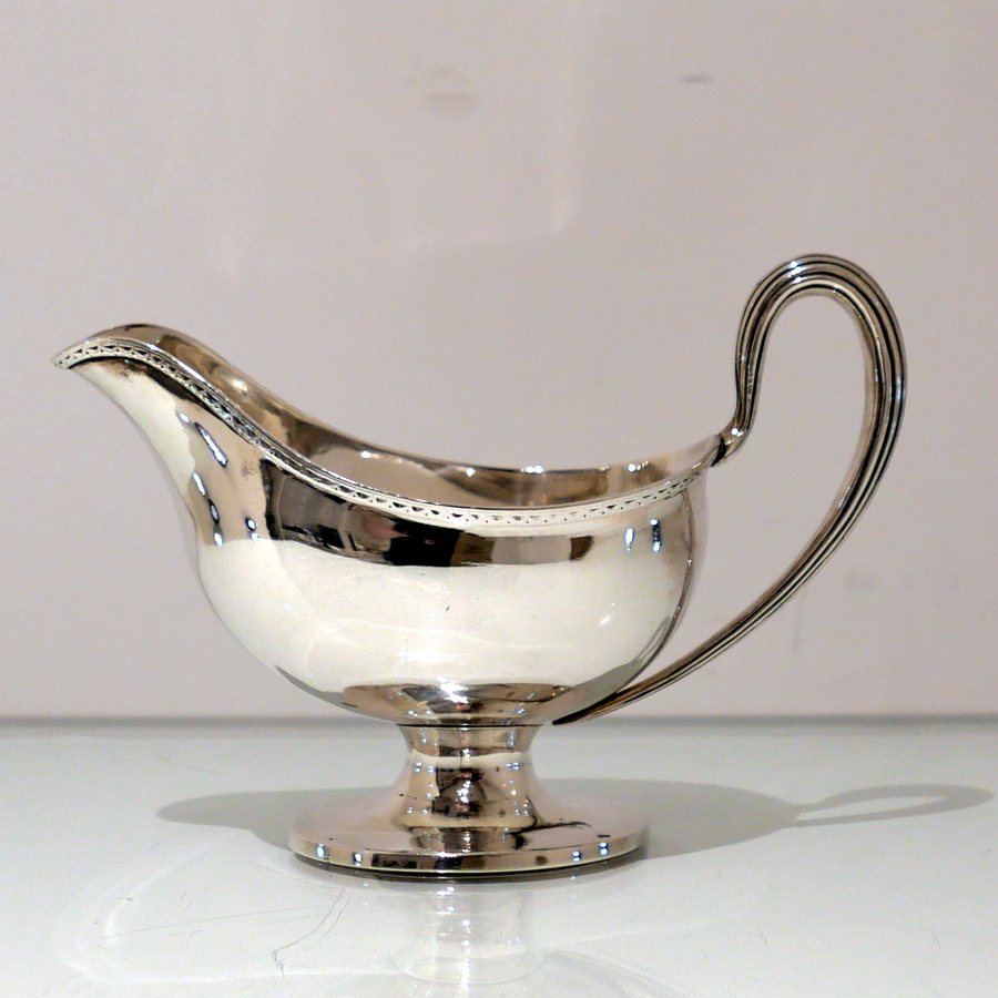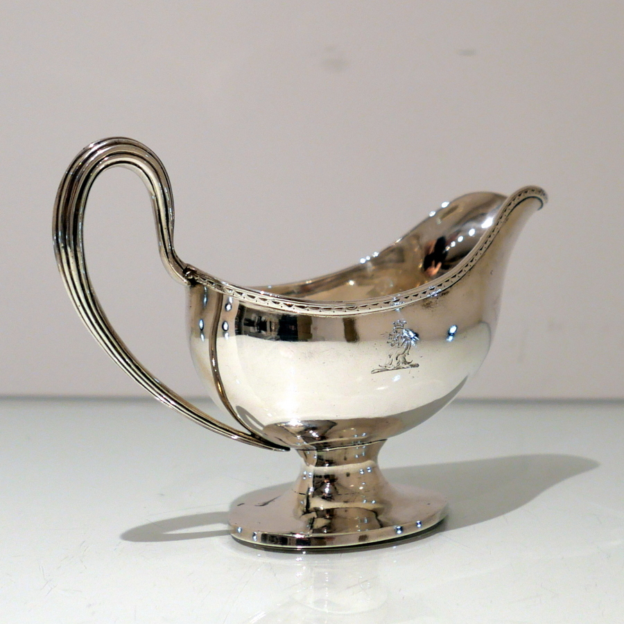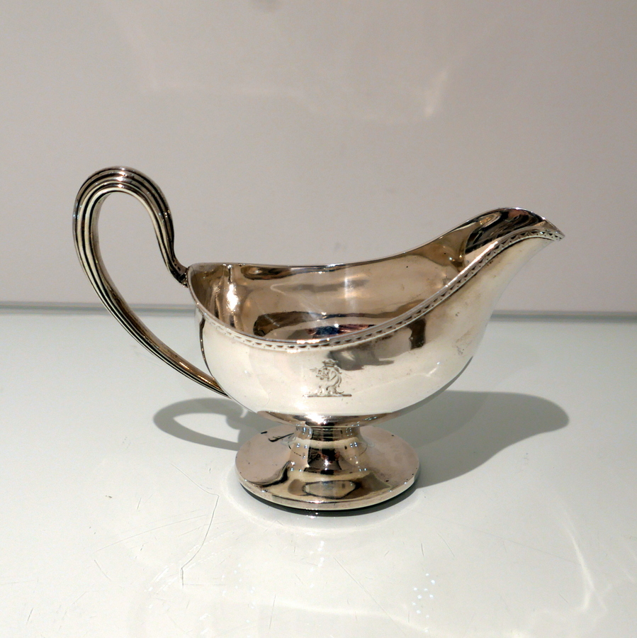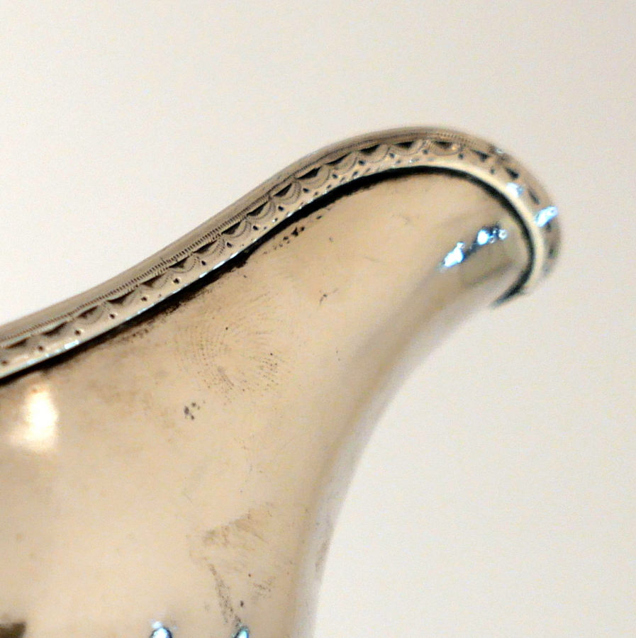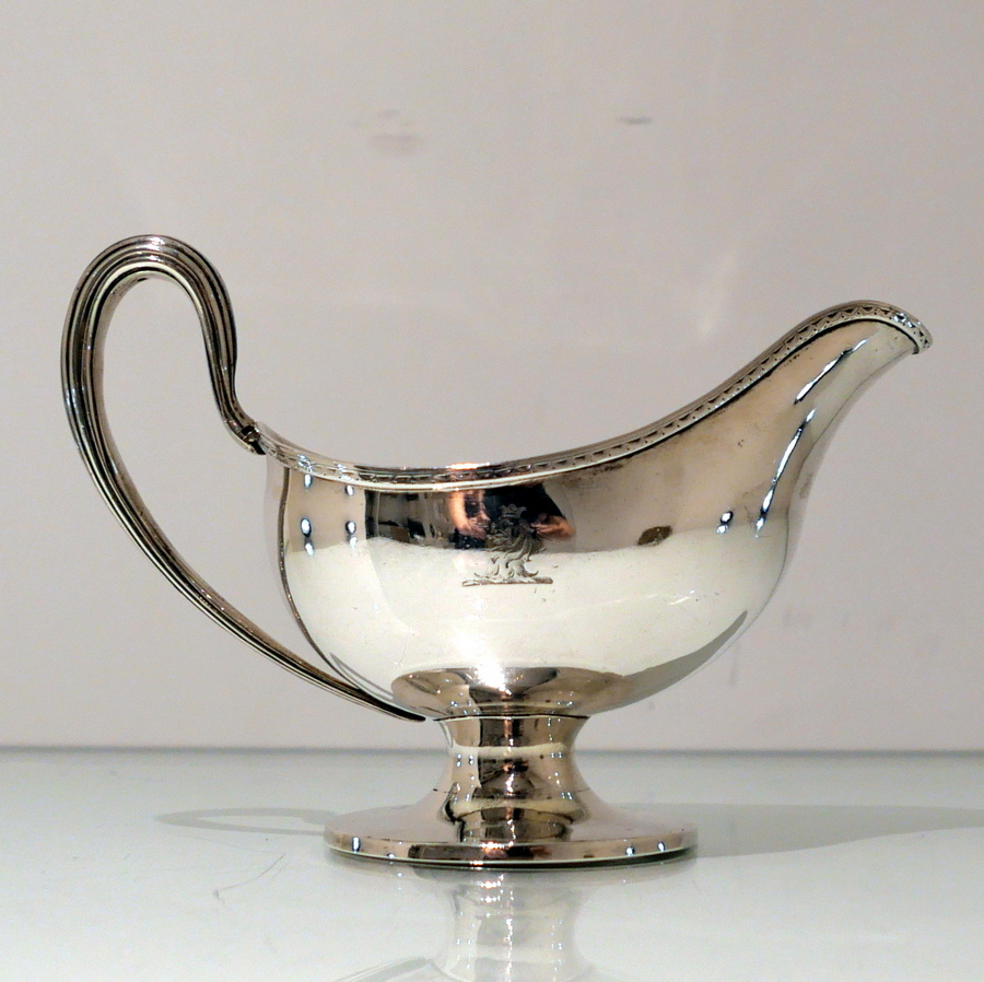 A beautiful 18th century sterling silver sauceboat elegantly plain formed in design and decorated with a stylish intricate band of upper bright cut engraving for highlights. Â There is a a hand engraved contemporary crest for importance.