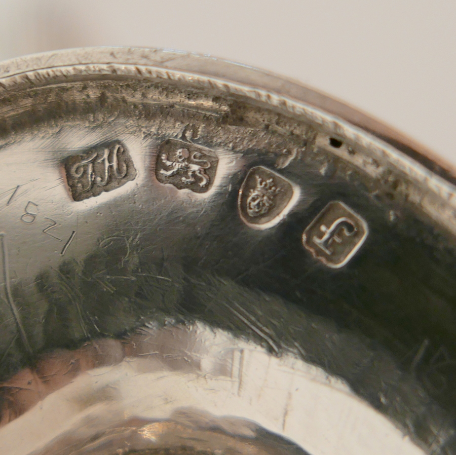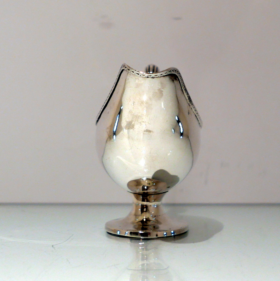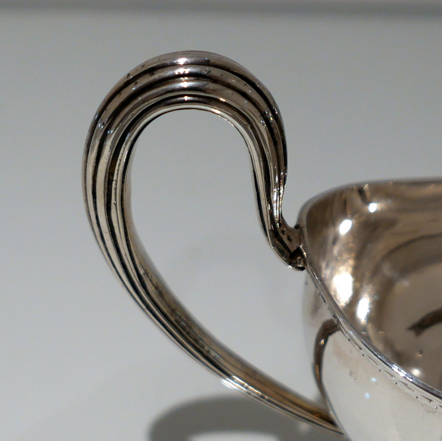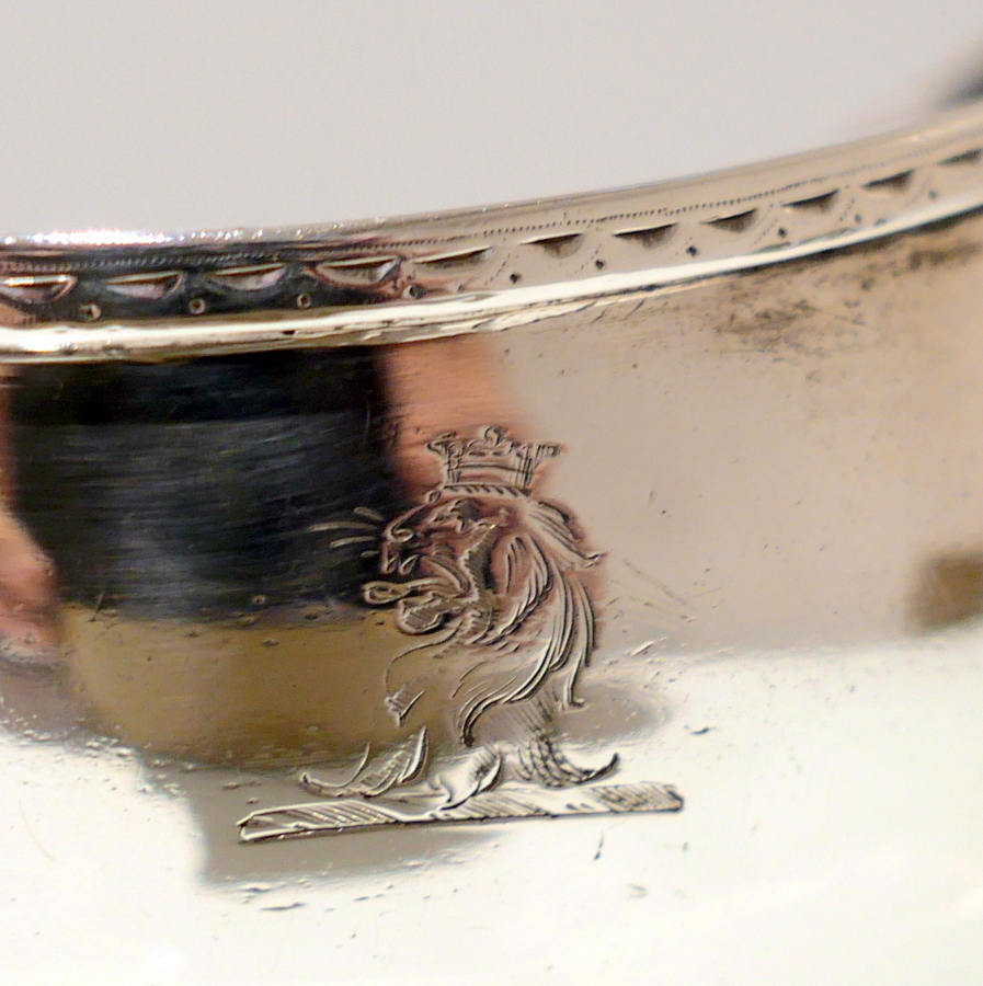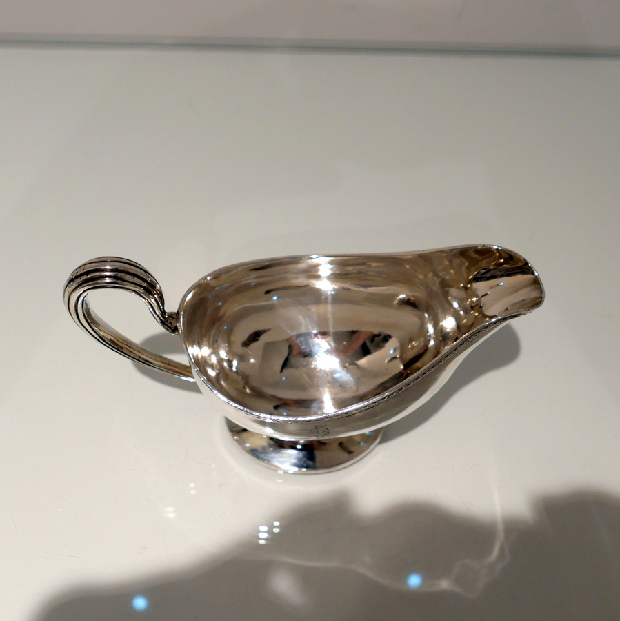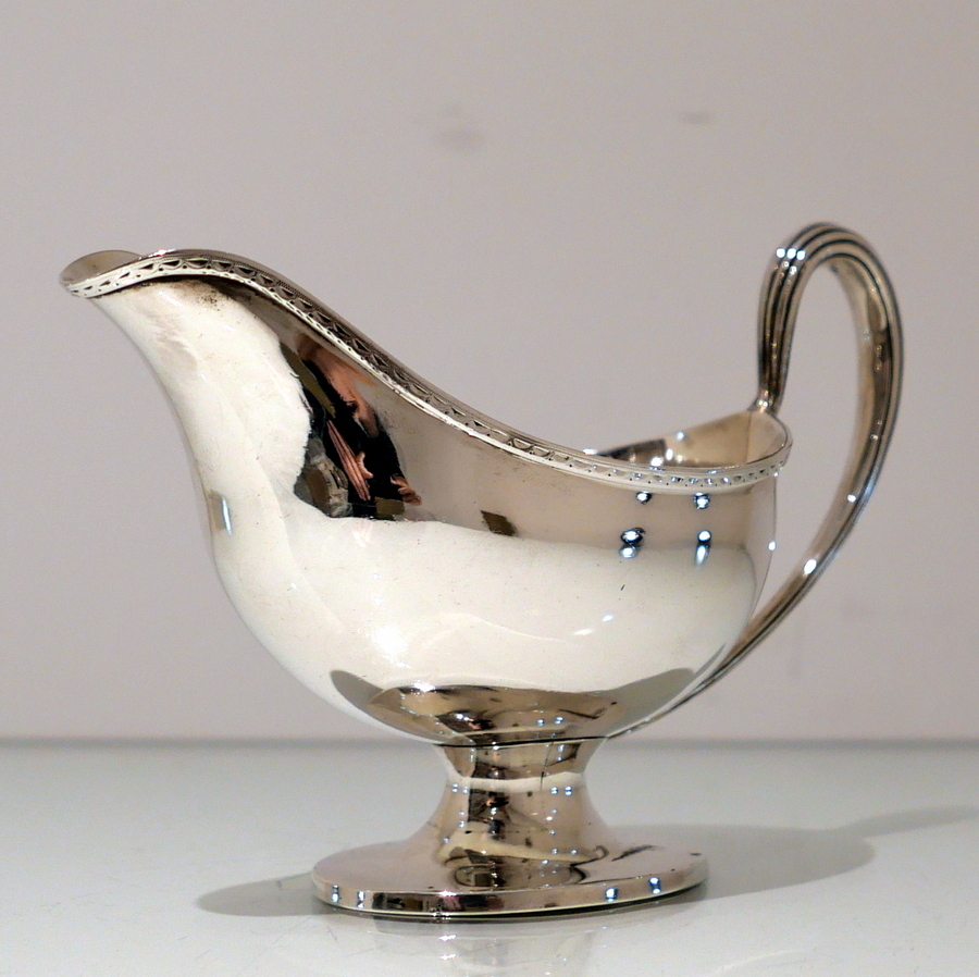 A beautiful 18th century sterling silver sauceboat elegantly plain formed in design and decorated with a stylish intricate band of upper bright cut engraving for highlights. Â There is a a hand engraved contemporary crest for importance.
