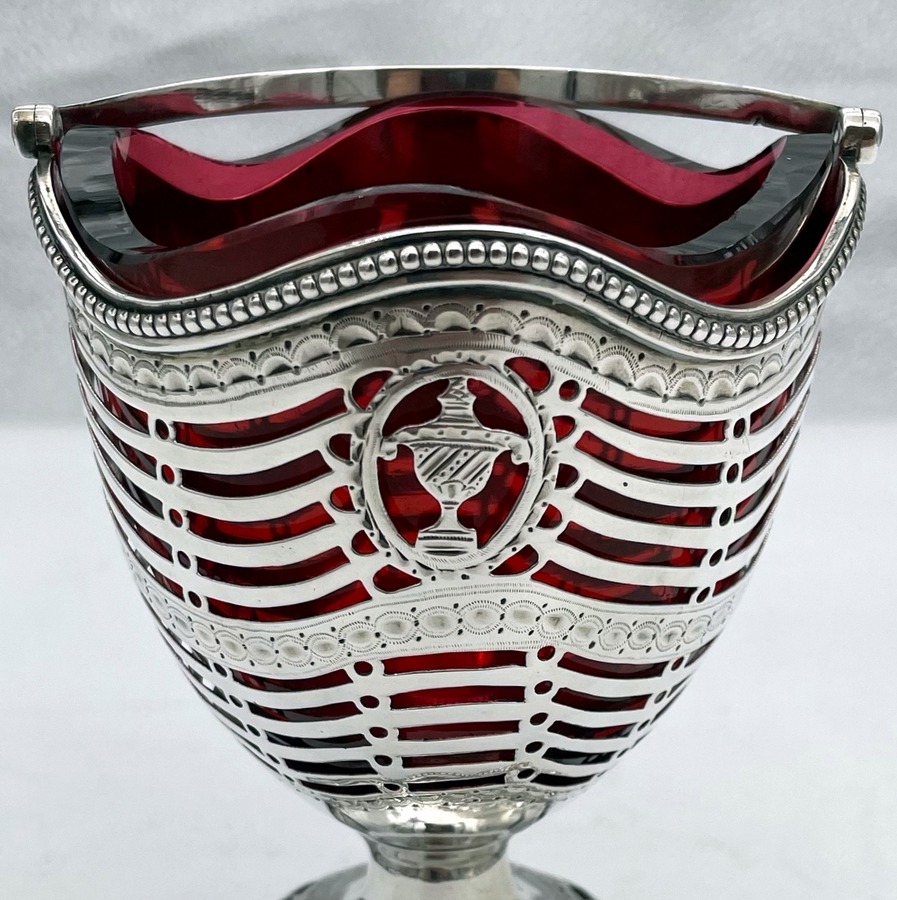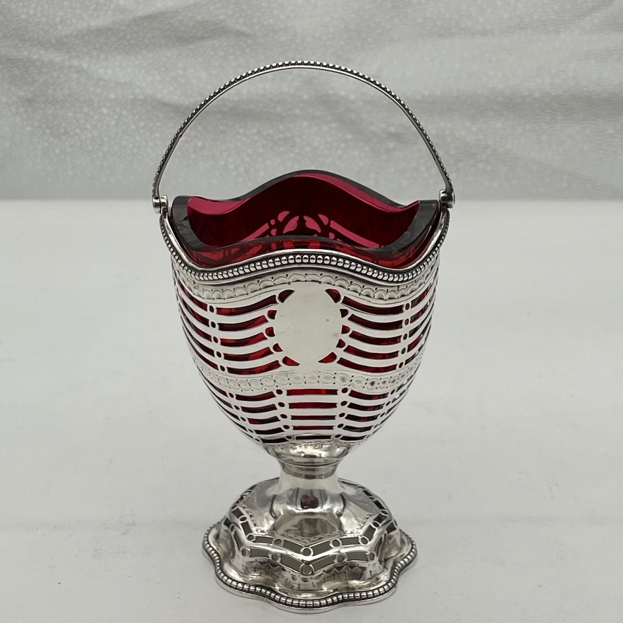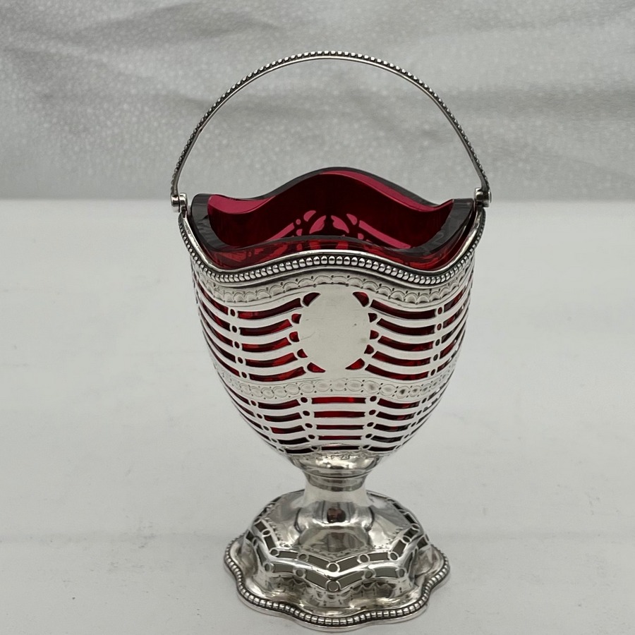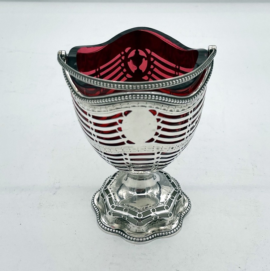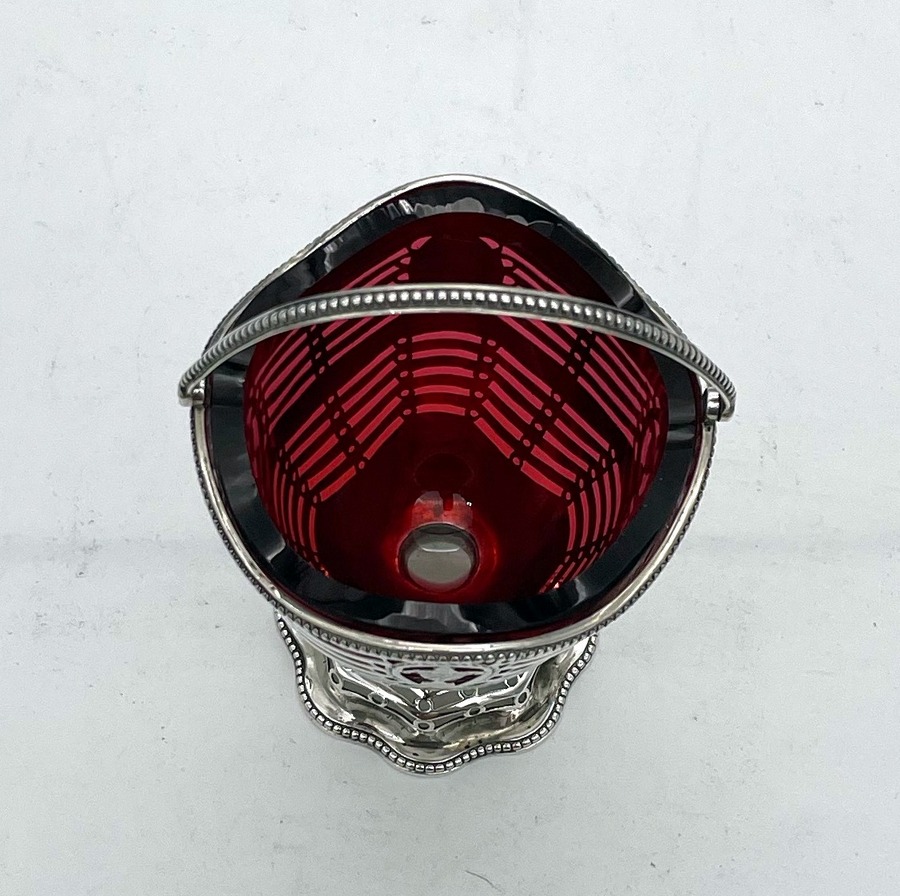 A delightful Georgian silver bead bordered swing handle sugar basket designed with intricate hand piercing and bands of bright cut engraving for highlights. Â The stylish wavy edged border mirrors the detachable stylish cranberry liner insert for visual decorative contrast.