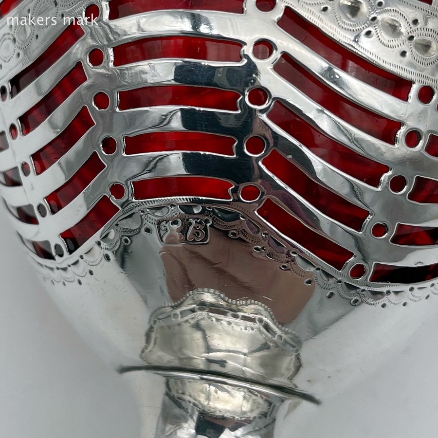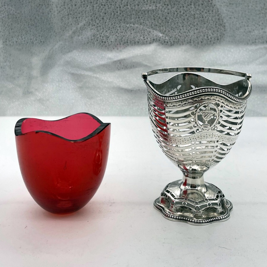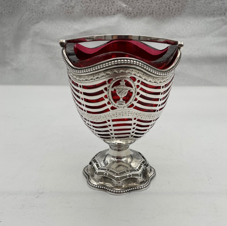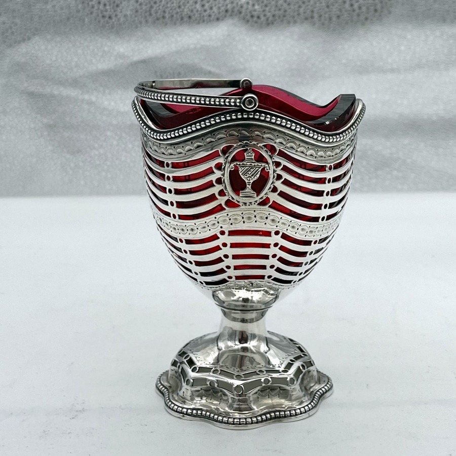 A delightful Georgian silver bead bordered swing handle sugar basket designed with intricate hand piercing and bands of bright cut engraving for highlights. Â The stylish wavy edged border mirrors the detachable stylish cranberry liner insert for visual decorative contrast.