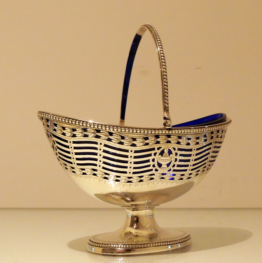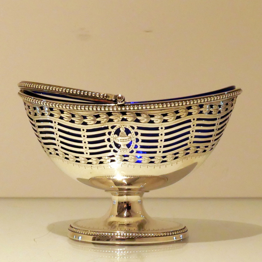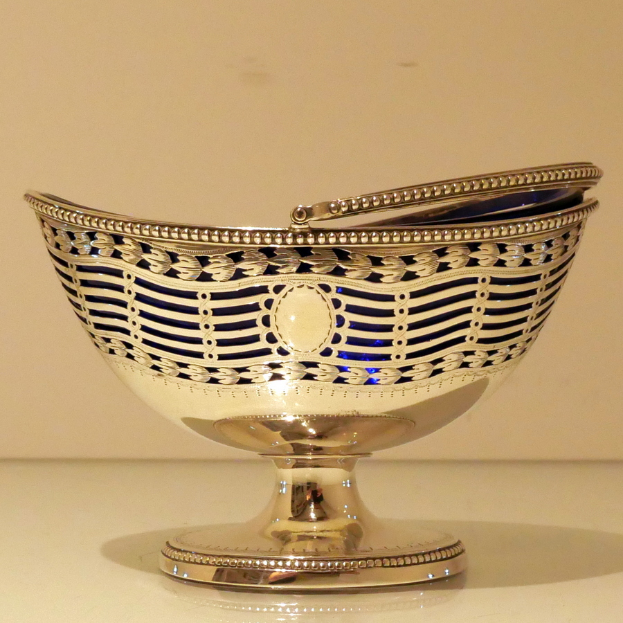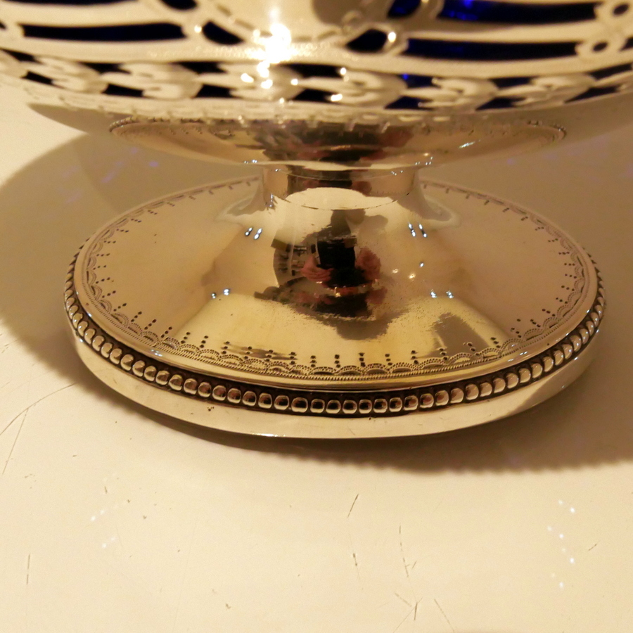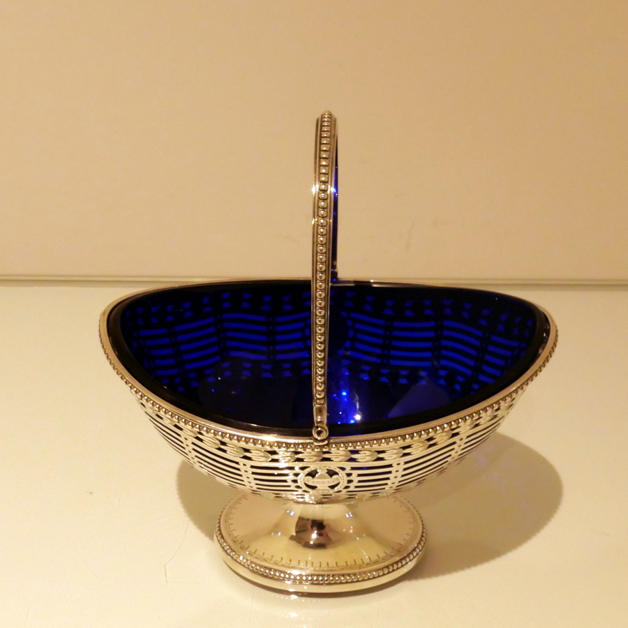 A beautiful bright cut engraved swing handle oval bead decorated sterling silver sugar basket sitting on a raised pedestal foot and presented with a blue inner glass liner for decorative contrast.