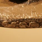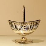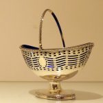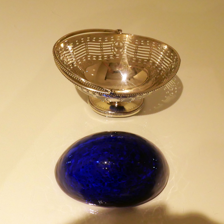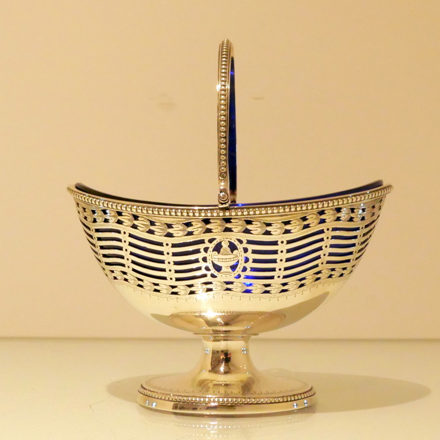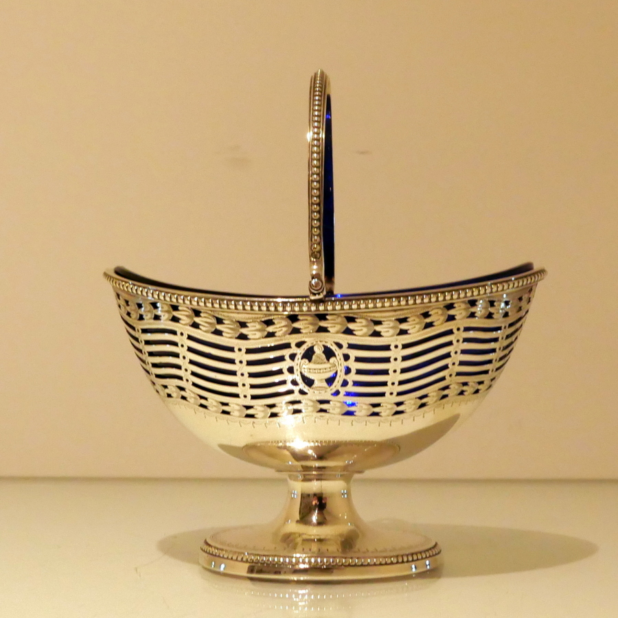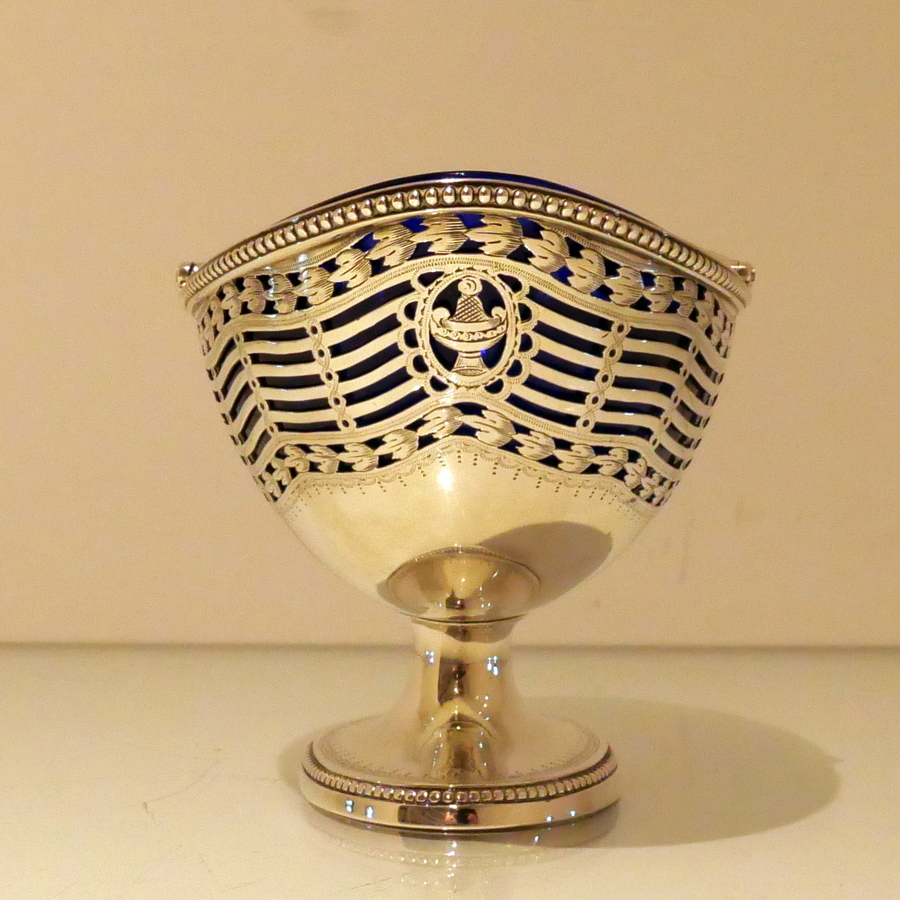 A beautiful bright cut engraved swing handle oval bead decorated sterling silver sugar basket sitting on a raised pedestal foot and presented with a blue inner glass liner for decorative contrast.