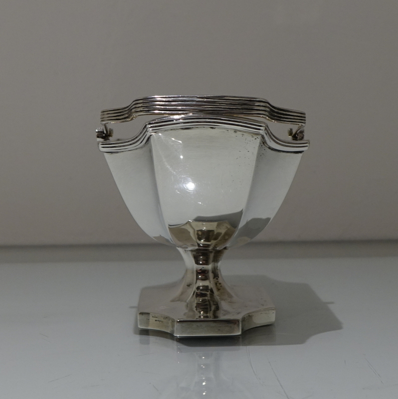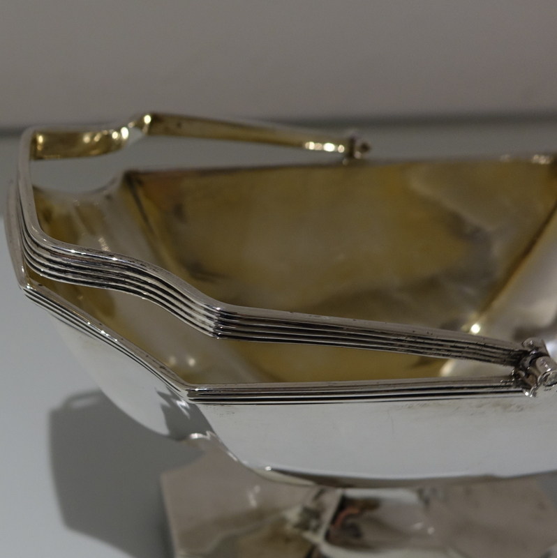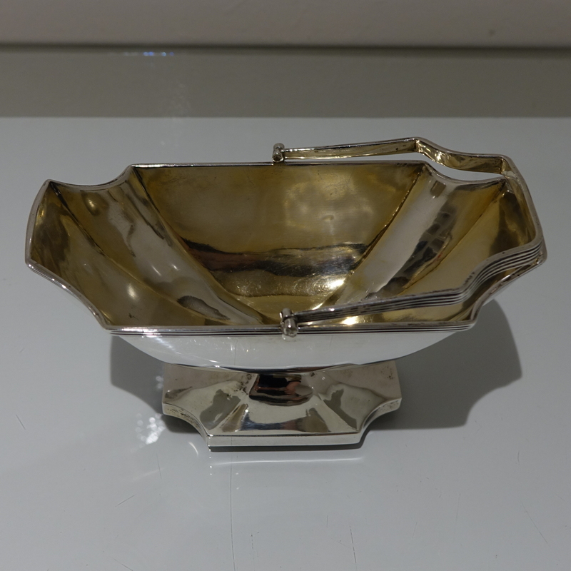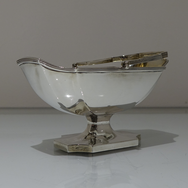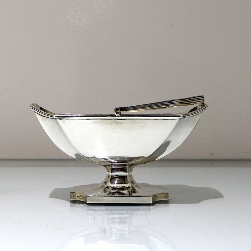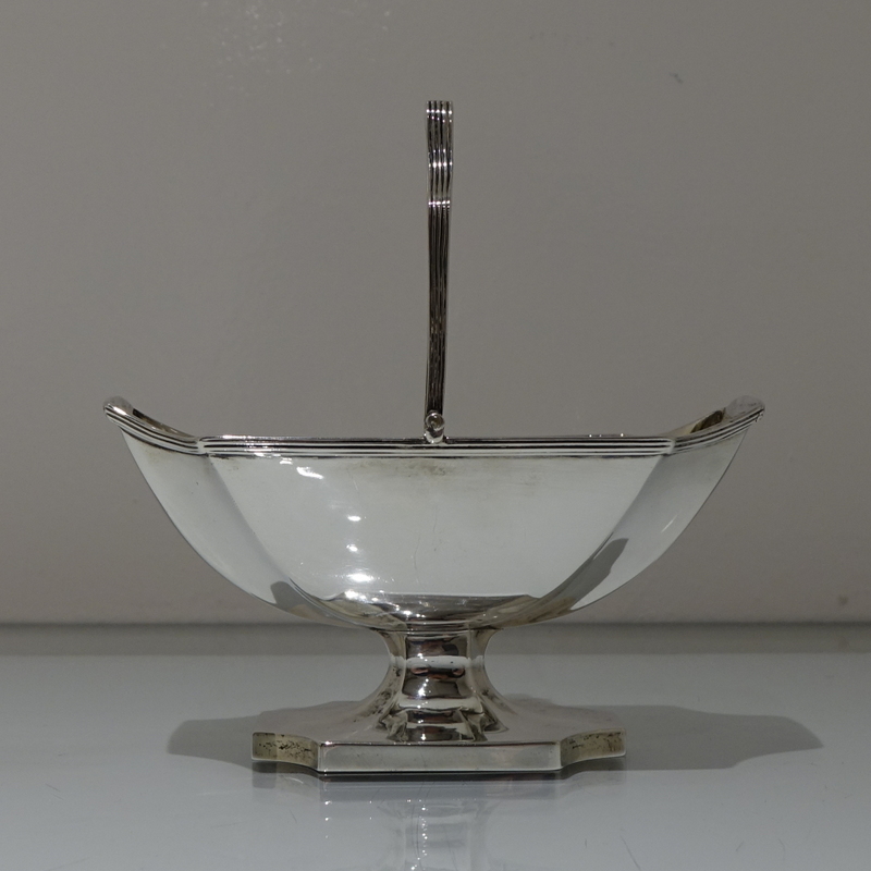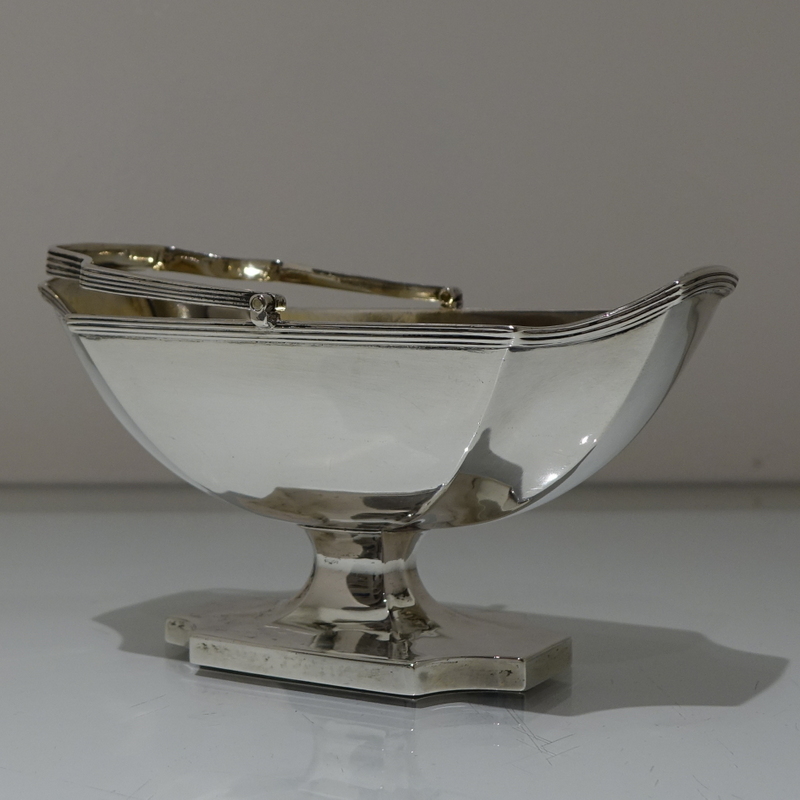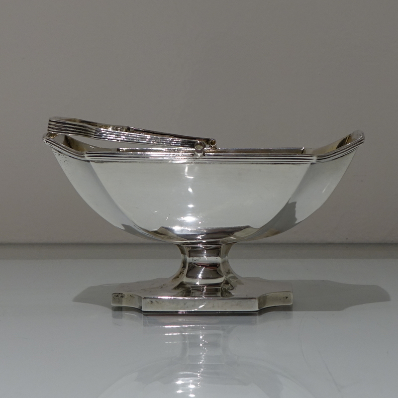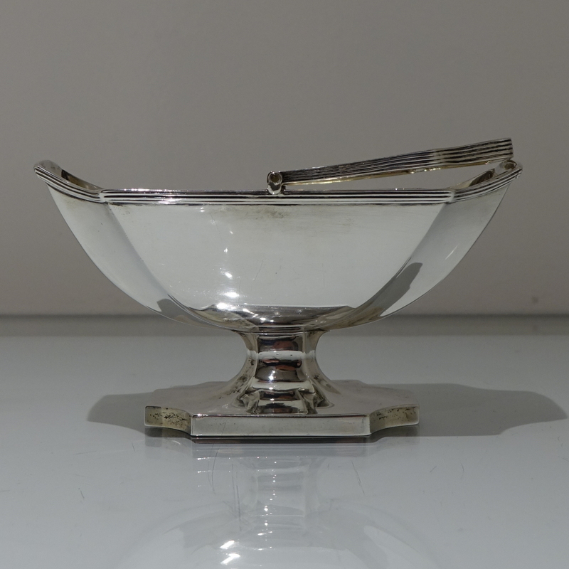 A beautiful rectangular cut cornered, plain- formed Georgian swing handled sugar basket. Â Decorated with a simple but elegant upper reed border for highlights. Â The basket sits on a raised pedestal foot.