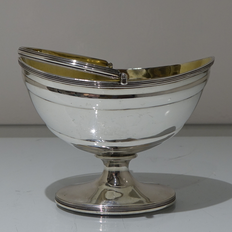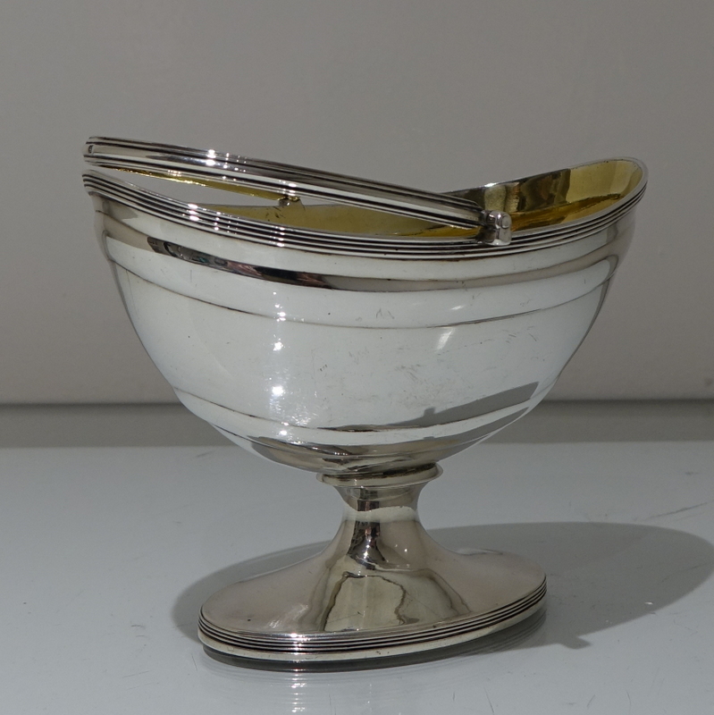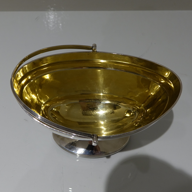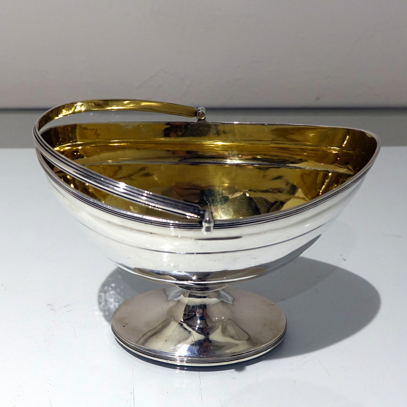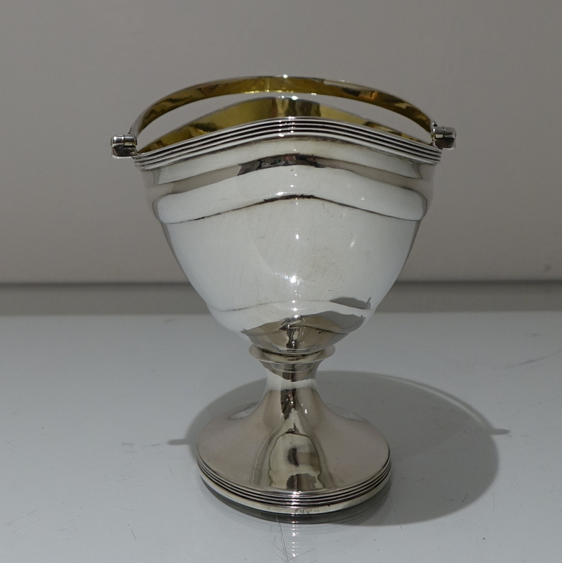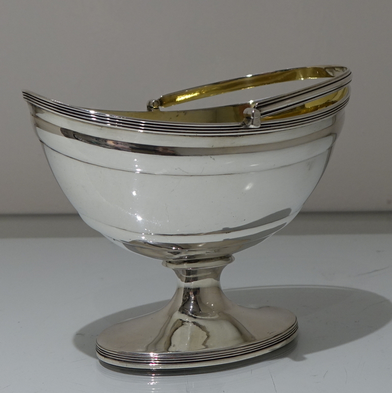 A stylish swing handled oval sugar basket decorated with applied upper and lower reed borders. Â The inside of the bowl has been gilded for decorative highlights.