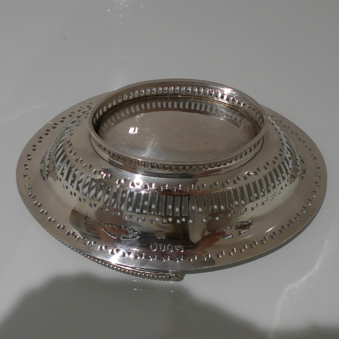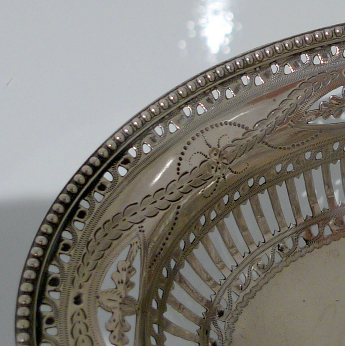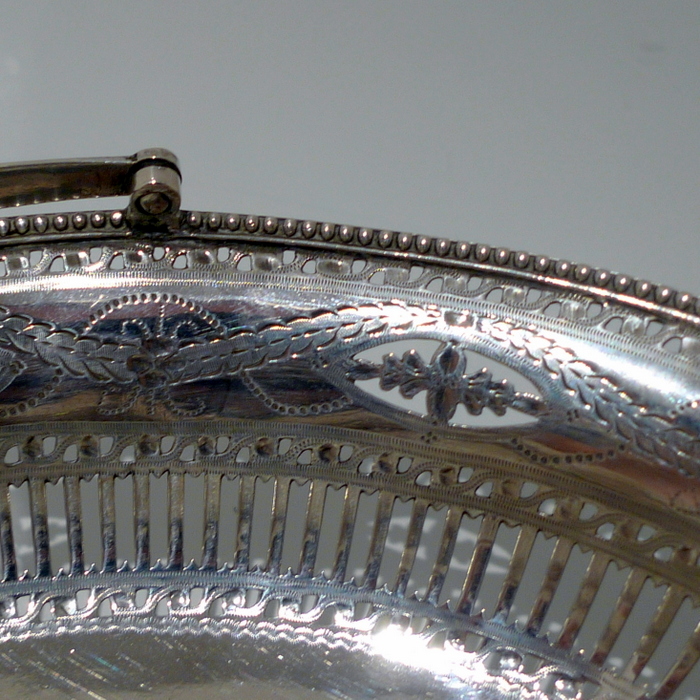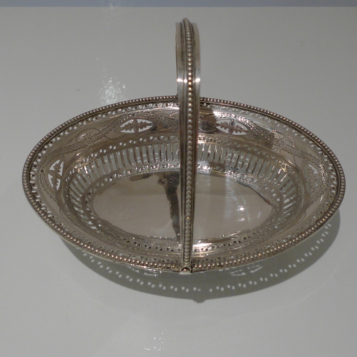A collectable swing handled sweet meat basket made by the highly renowned Hester Bateman. Â The body of the basket has been intricately hand pierced and has stylish bright cut engraving for decoration. Â The border and the handle has applied wire bead designs for highlights.