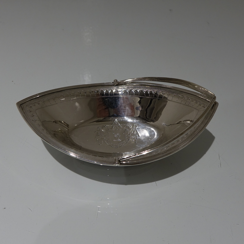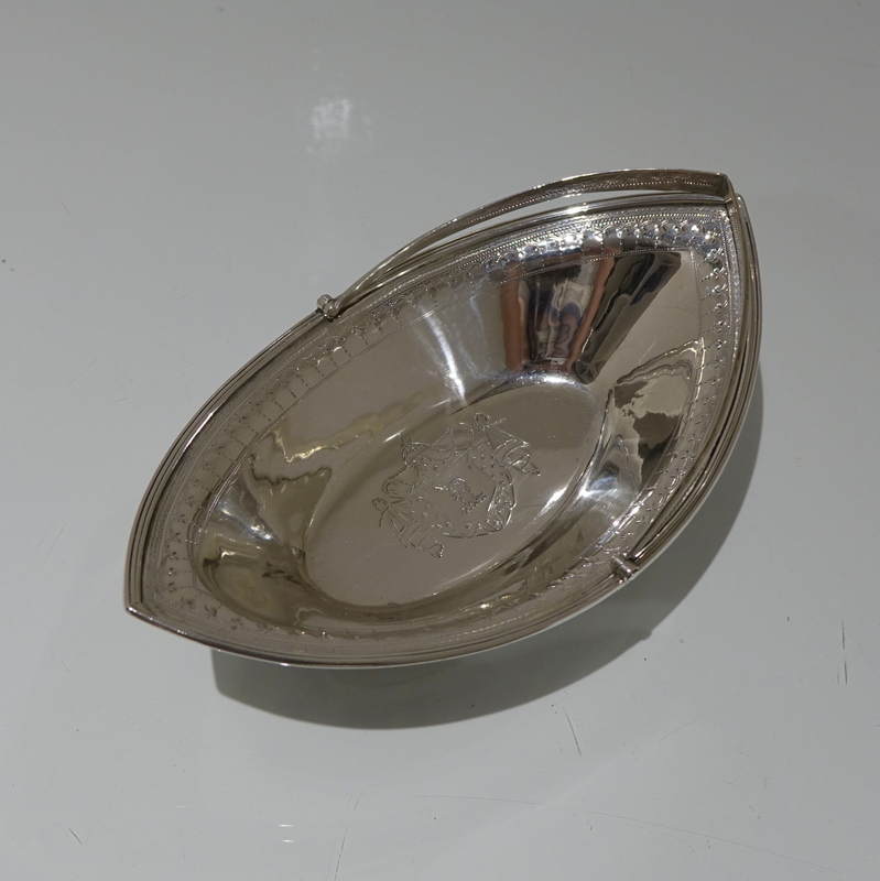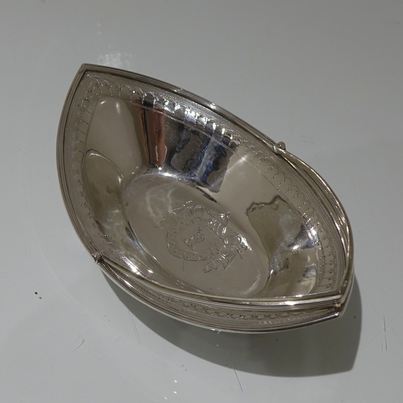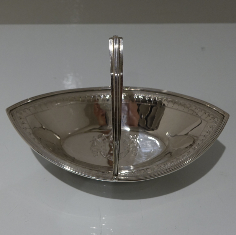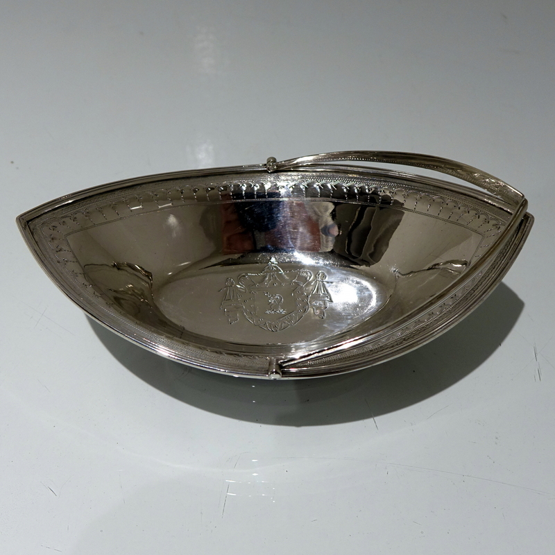 A splendid late 18th century oval bright cut engraved swing handled sweet meat basket. Â The outer edge of the bowl has intricate engraving for decoration and the centre front has a beautiful contemporary armorial for importance.