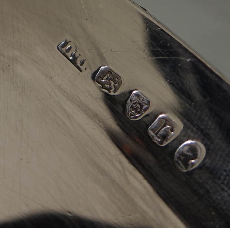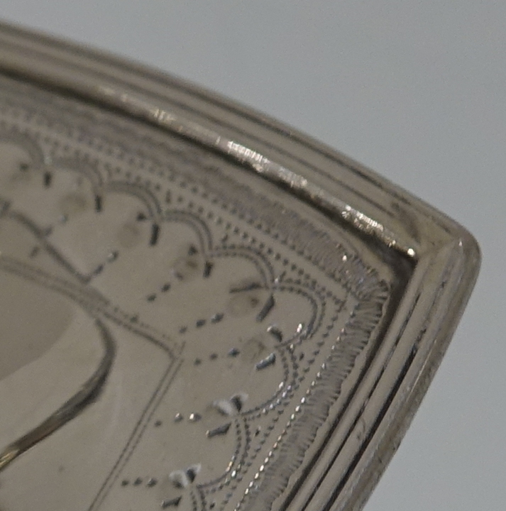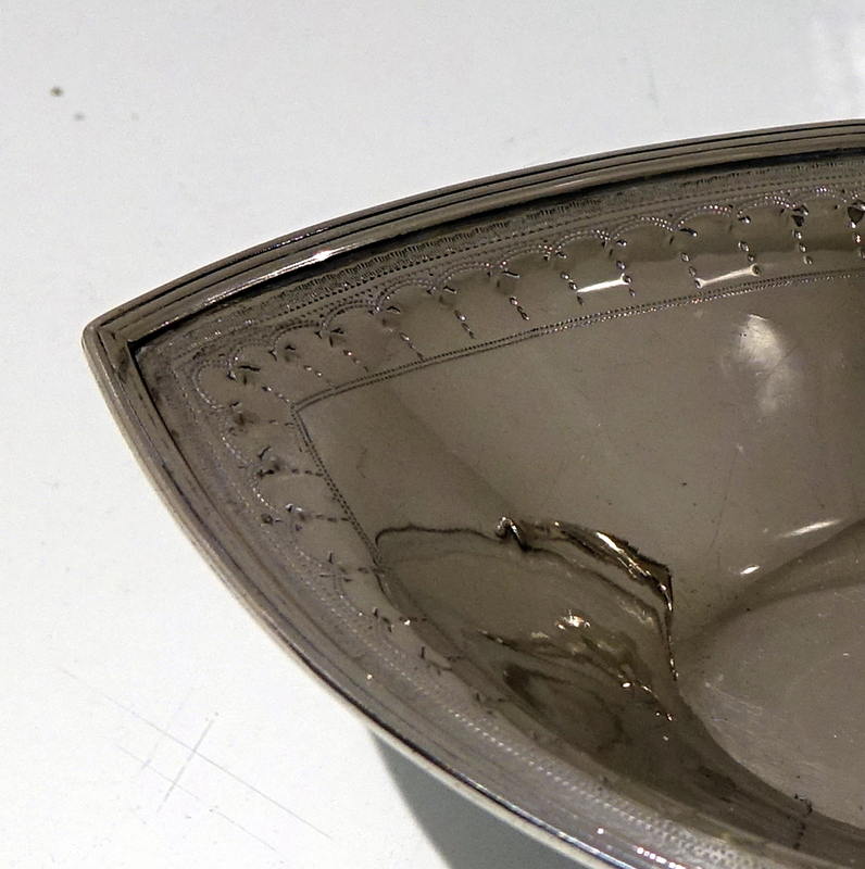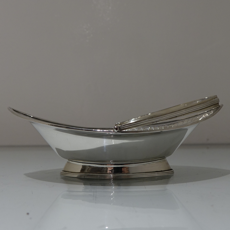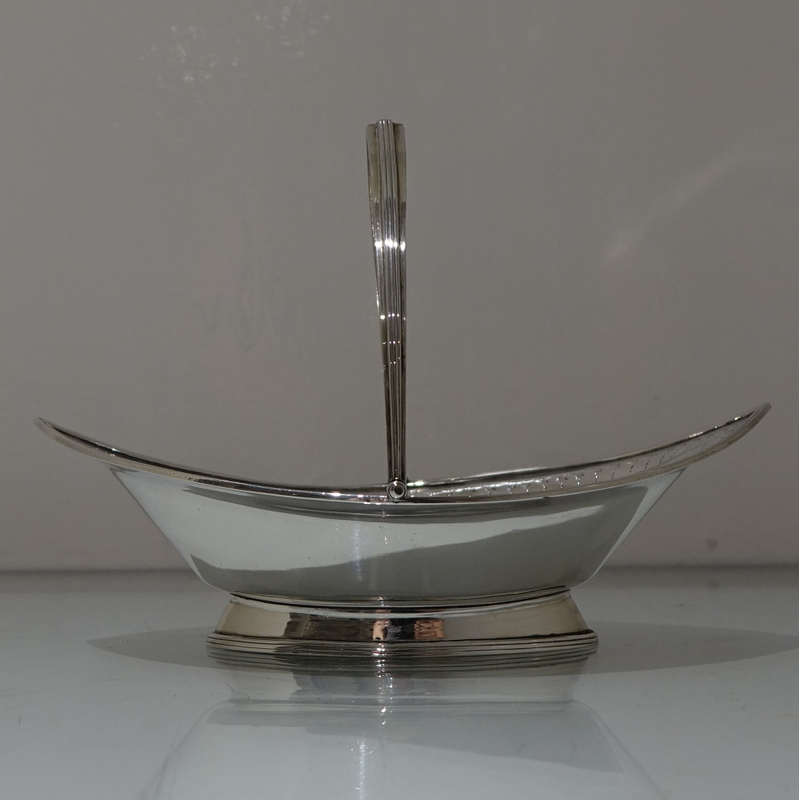 A splendid late 18th century oval bright cut engraved swing handled sweet meat basket. Â The outer edge of the bowl has intricate engraving for decoration and the centre front has a beautiful contemporary armorial for importance.