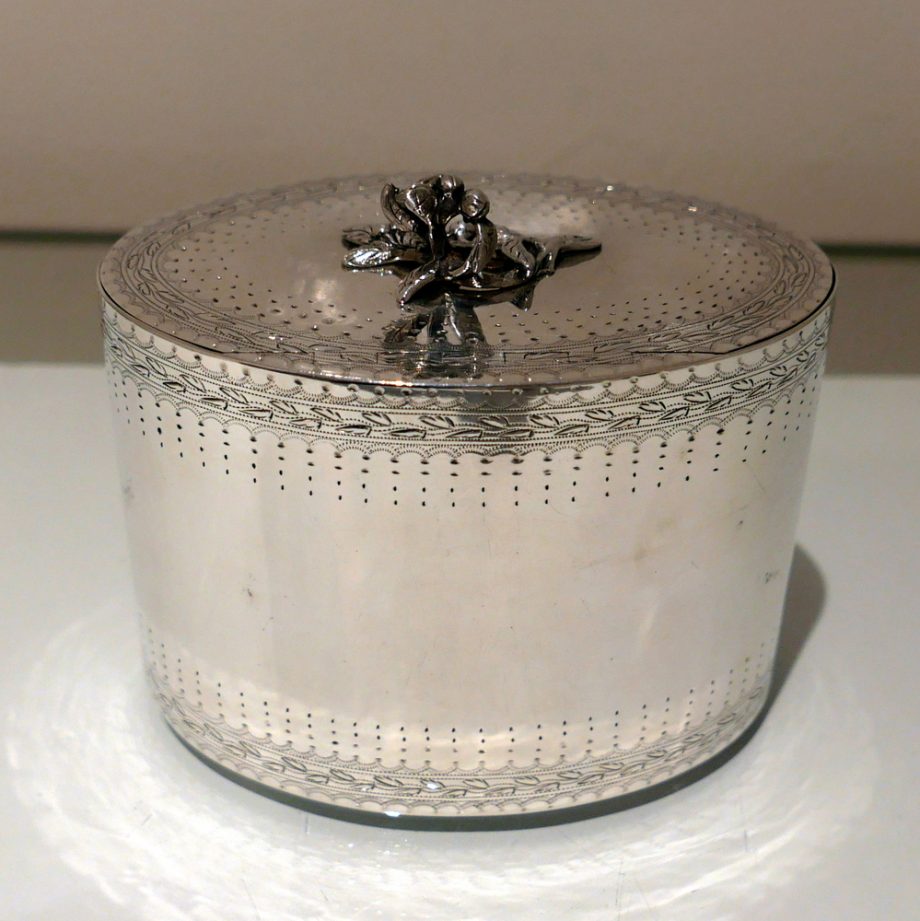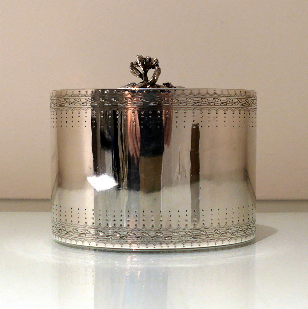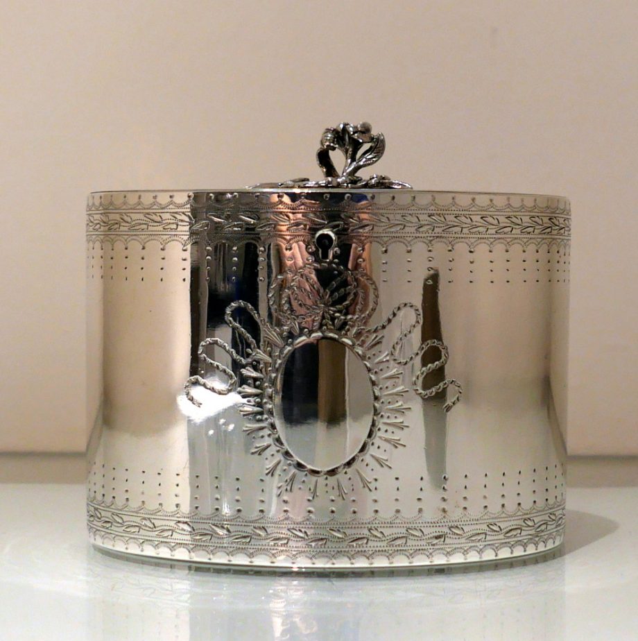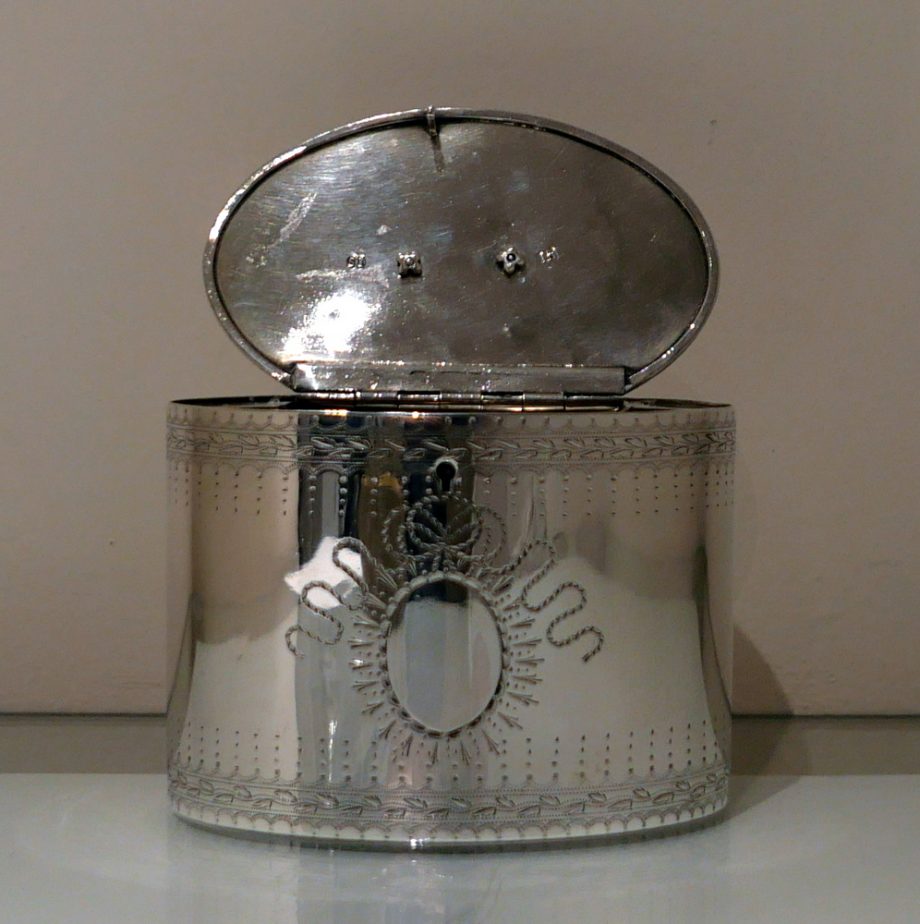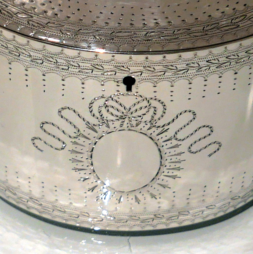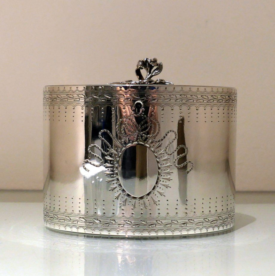 A splendid Georgian oval silver tea caddy decorated with intricate bands of bright cut engraving. Â The lid is hinged and has additional bright cut engraving for highlights and the contrasting plain formed central band has an elegant cartouche.