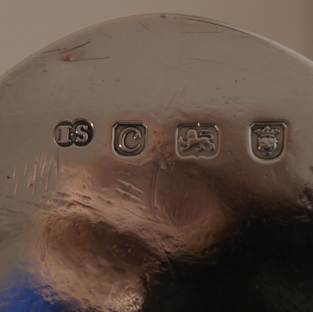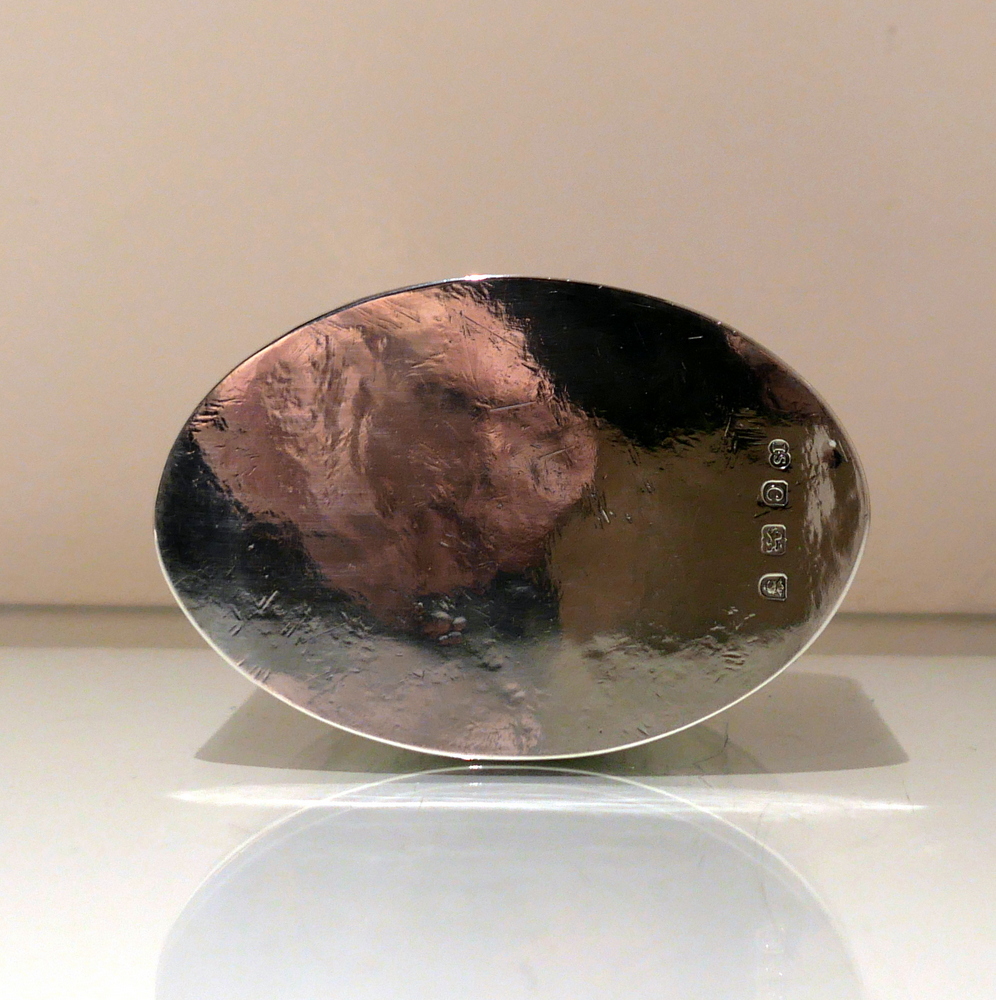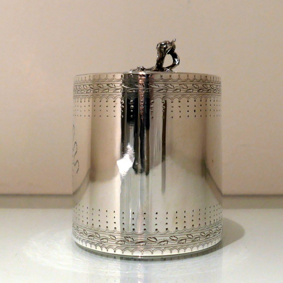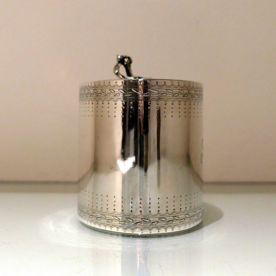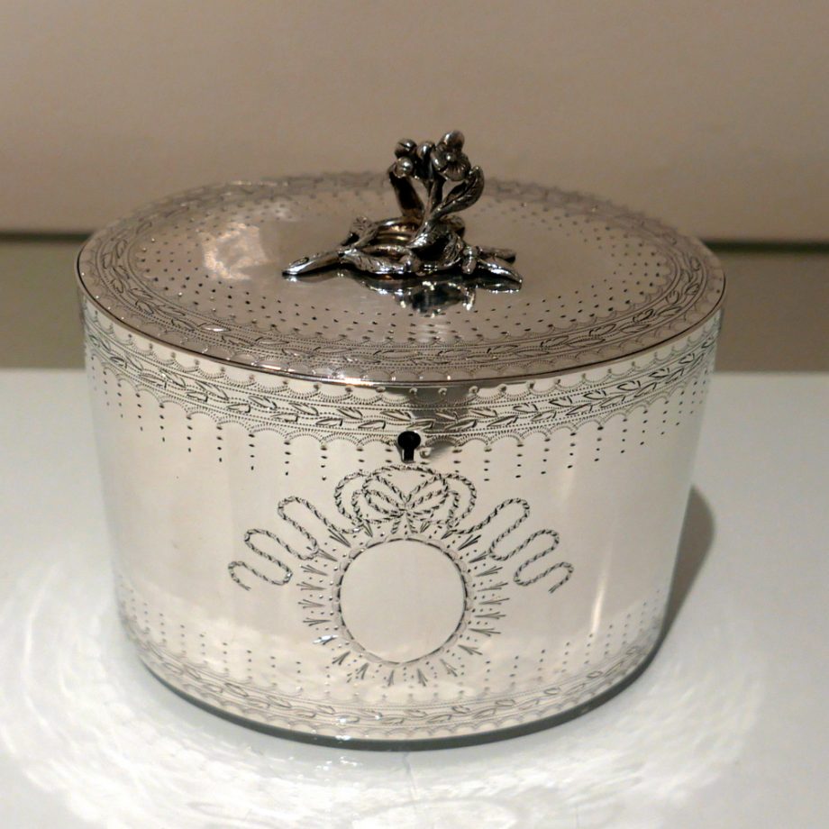 A splendid Georgian oval silver tea caddy decorated with intricate bands of bright cut engraving. Â The lid is hinged and has additional bright cut engraving for highlights and the contrasting plain formed central band has an elegant cartouche.