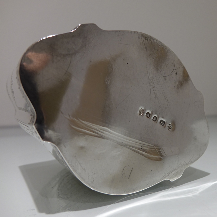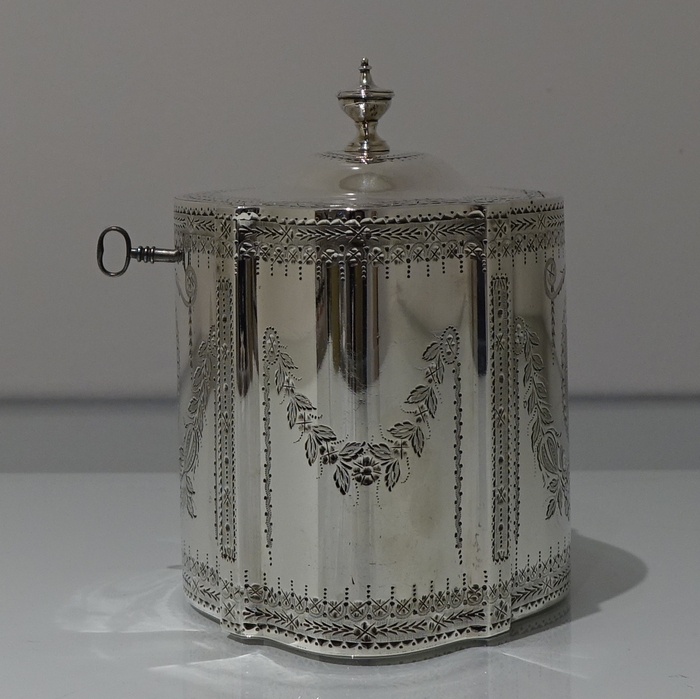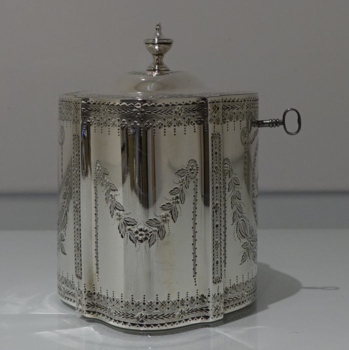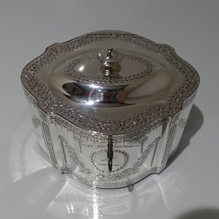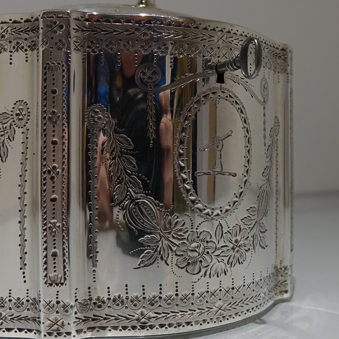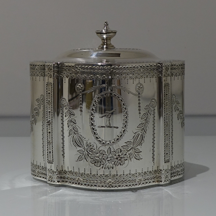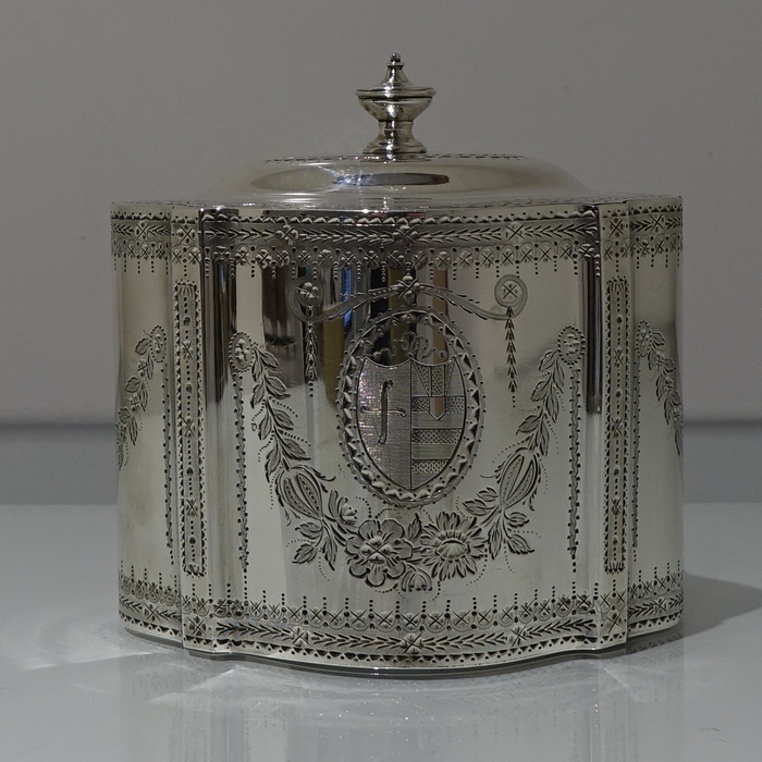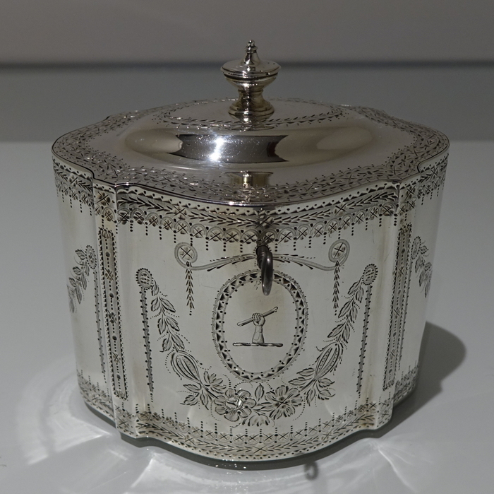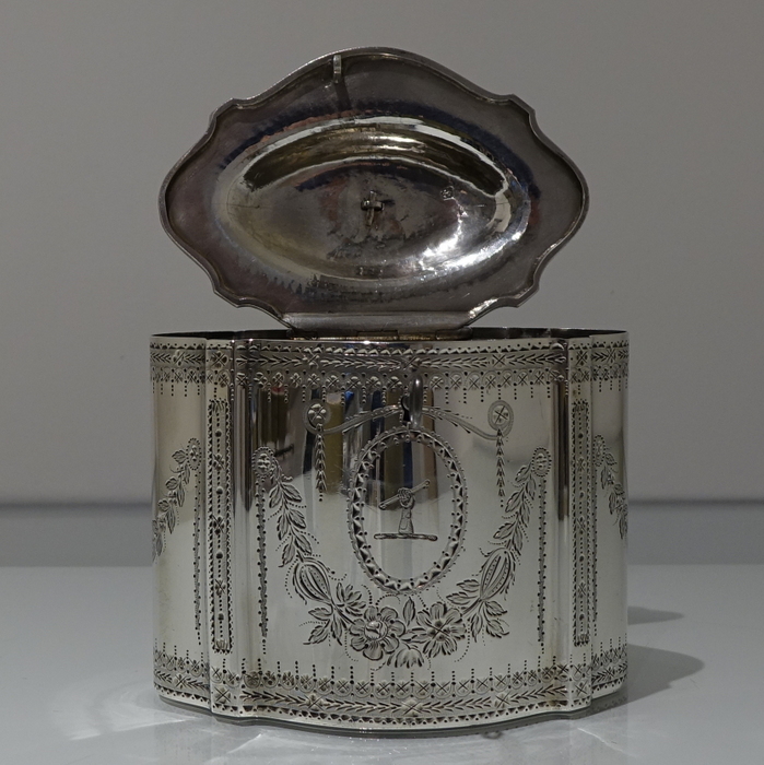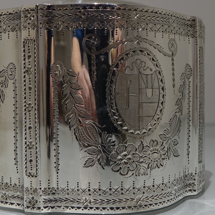 A stunning 18th century shaped oval bright cut engraved tea caddy. Â The lid is hinged and there is both a delightful contemporary armorial and crest for importance.