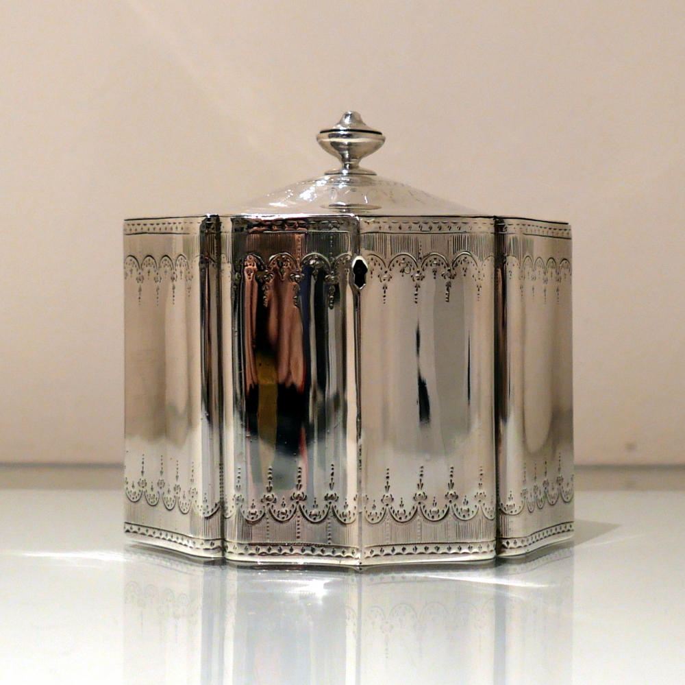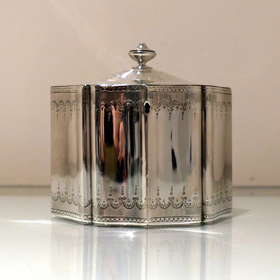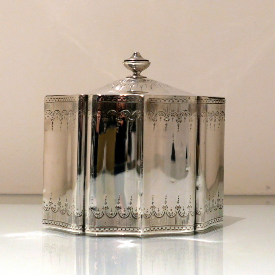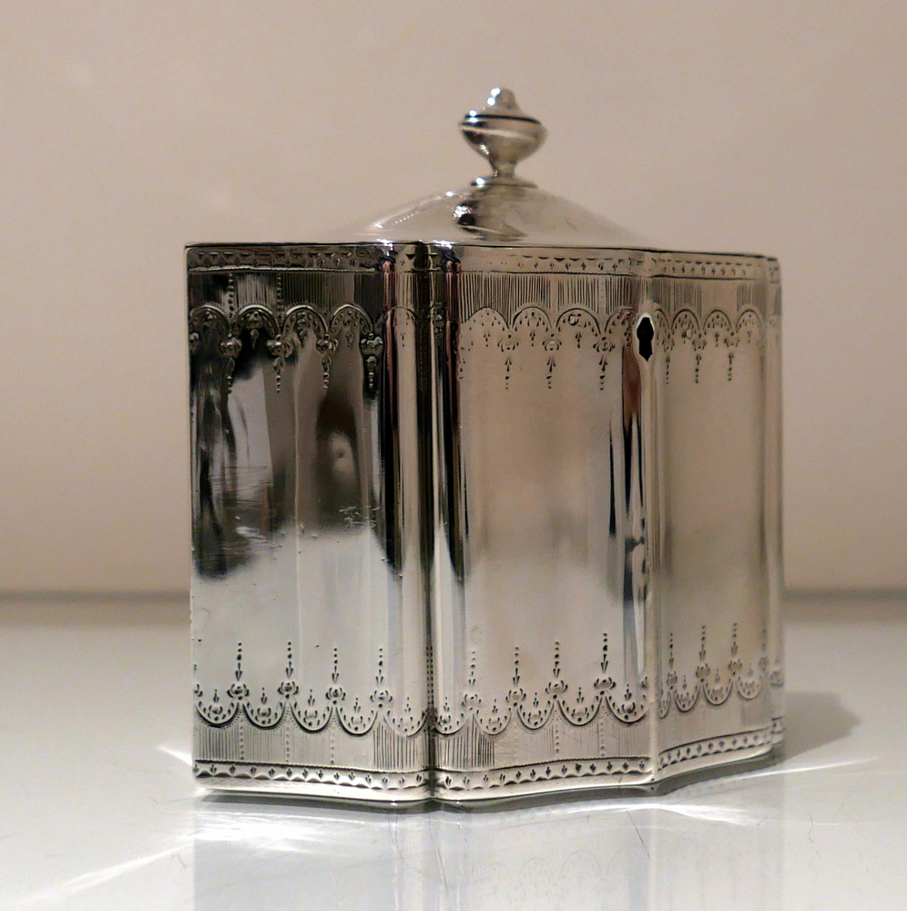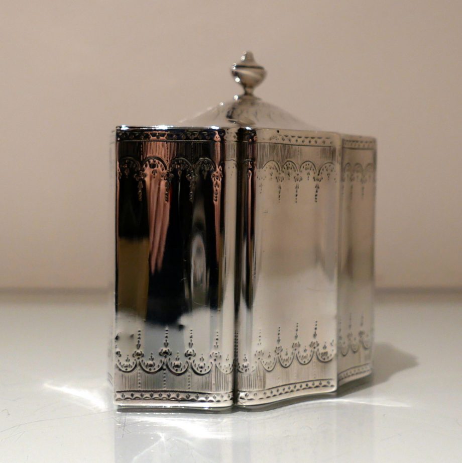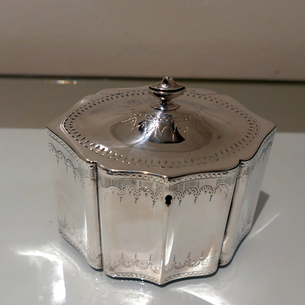 A very fine and incredibly rare shaped Georgian tea caddy designed with beautiful curvaceous panels and upper and lower elegant bright cut engraved borders. Â The domed lid is hinged and has additional bright cut engraving for highlights.