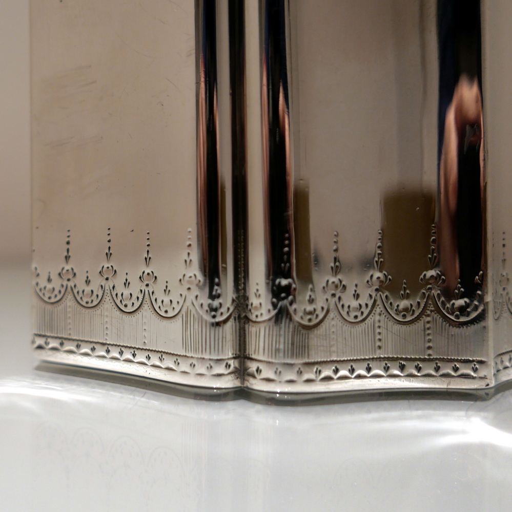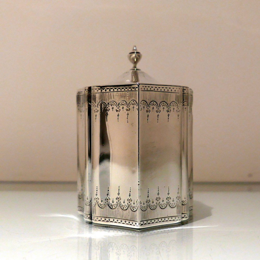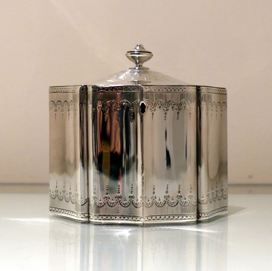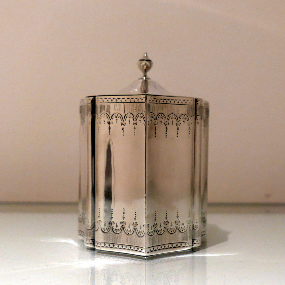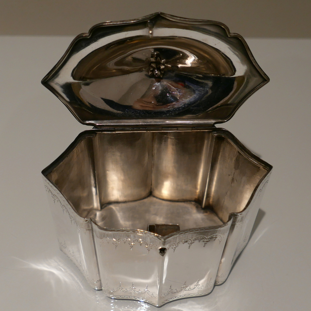 A very fine and incredibly rare shaped Georgian tea caddy designed with beautiful curvaceous panels and upper and lower elegant bright cut engraved borders. Â The domed lid is hinged and has additional bright cut engraving for highlights.