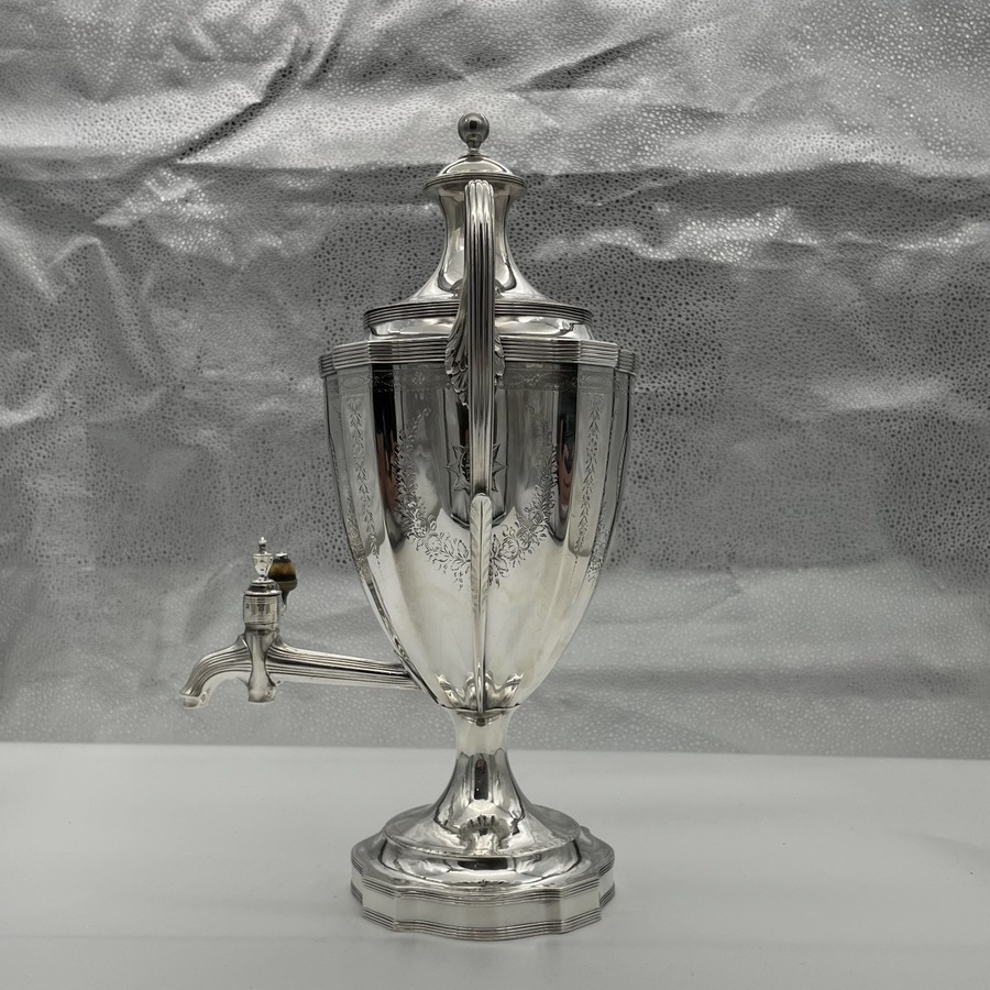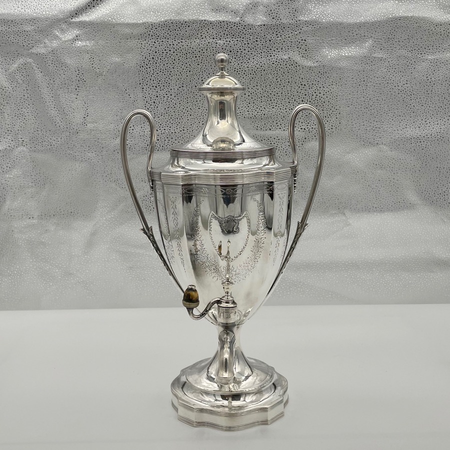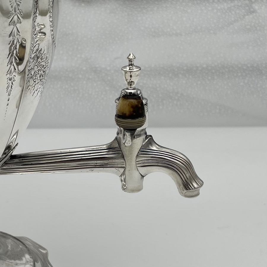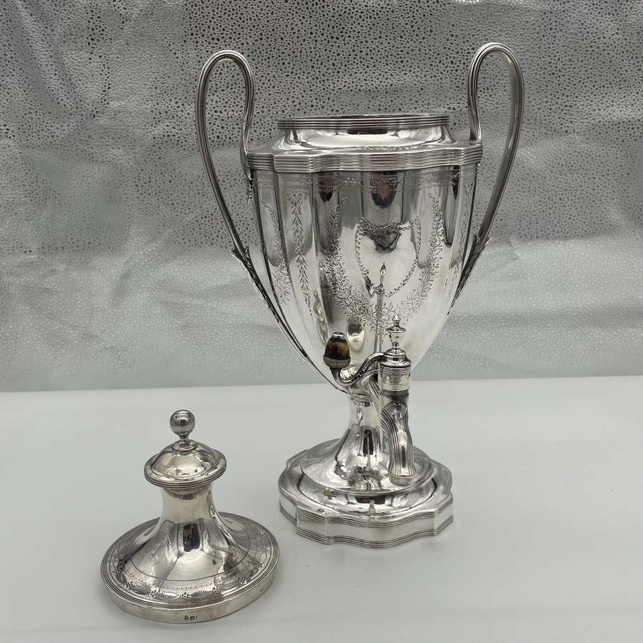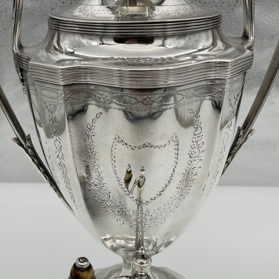 A rare Georgian silver tea urn designed with an elegantly shaped tapering body which has been elegant bright cut engraved for decorative visual highlights. Â There are two wonderful applied scroll hooped handles and a delightful elongated domed detachable lid.