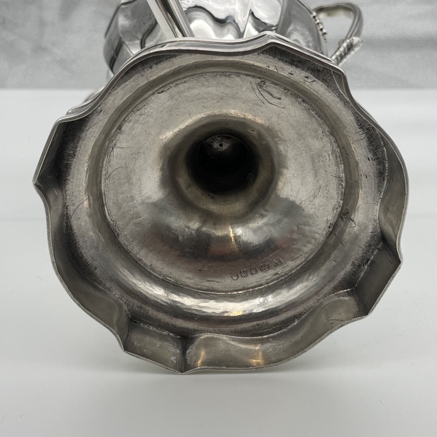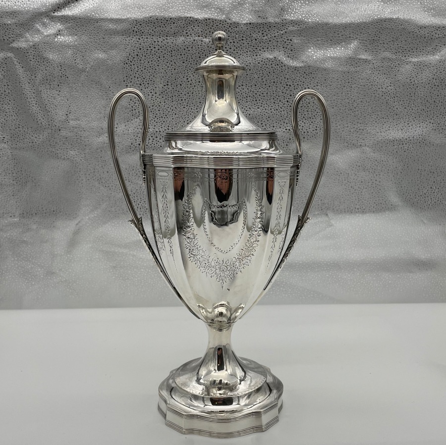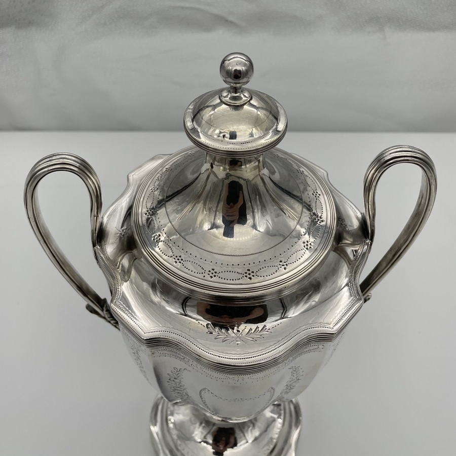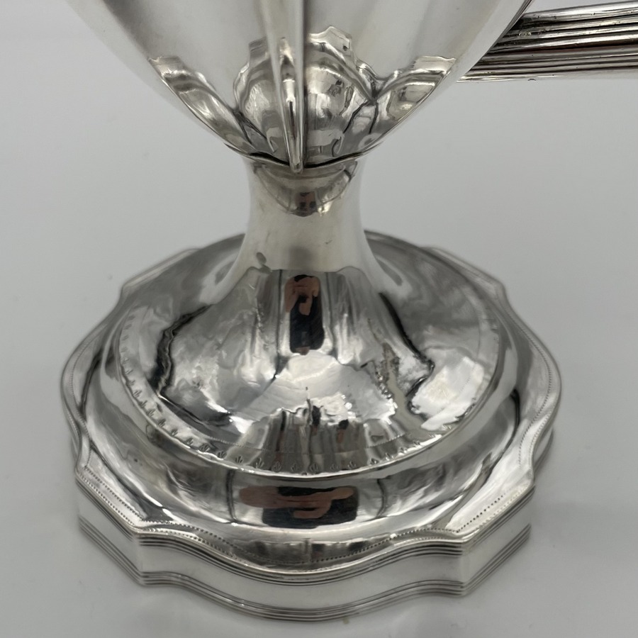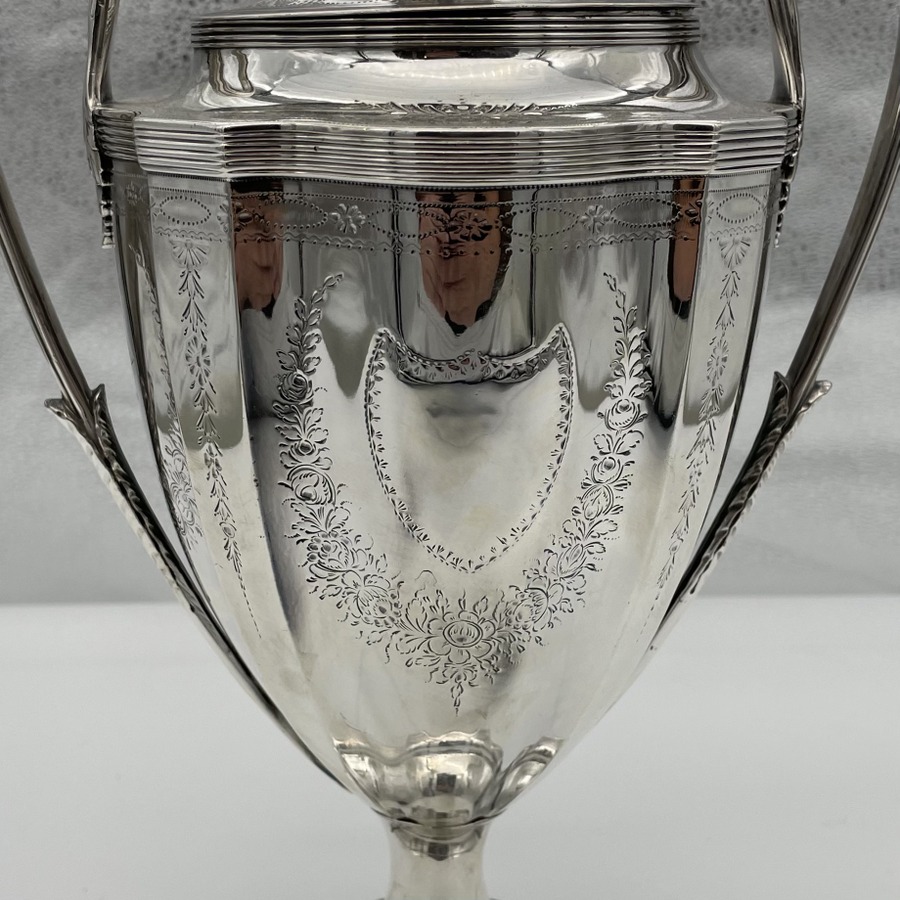 A rare Georgian silver tea urn designed with an elegantly shaped tapering body which has been elegant bright cut engraved for decorative visual highlights. Â There are two wonderful applied scroll hooped handles and a delightful elongated domed detachable lid.