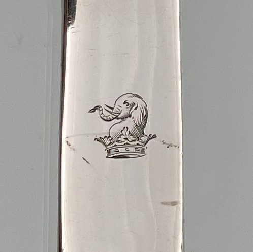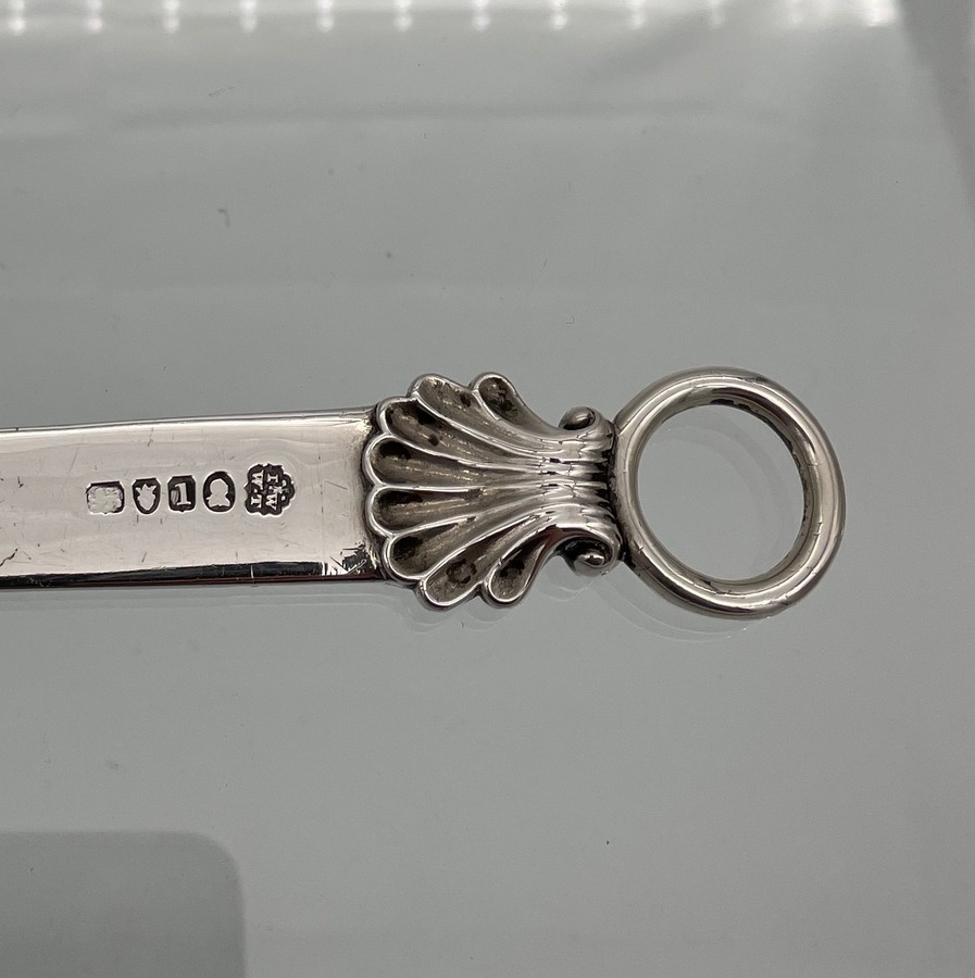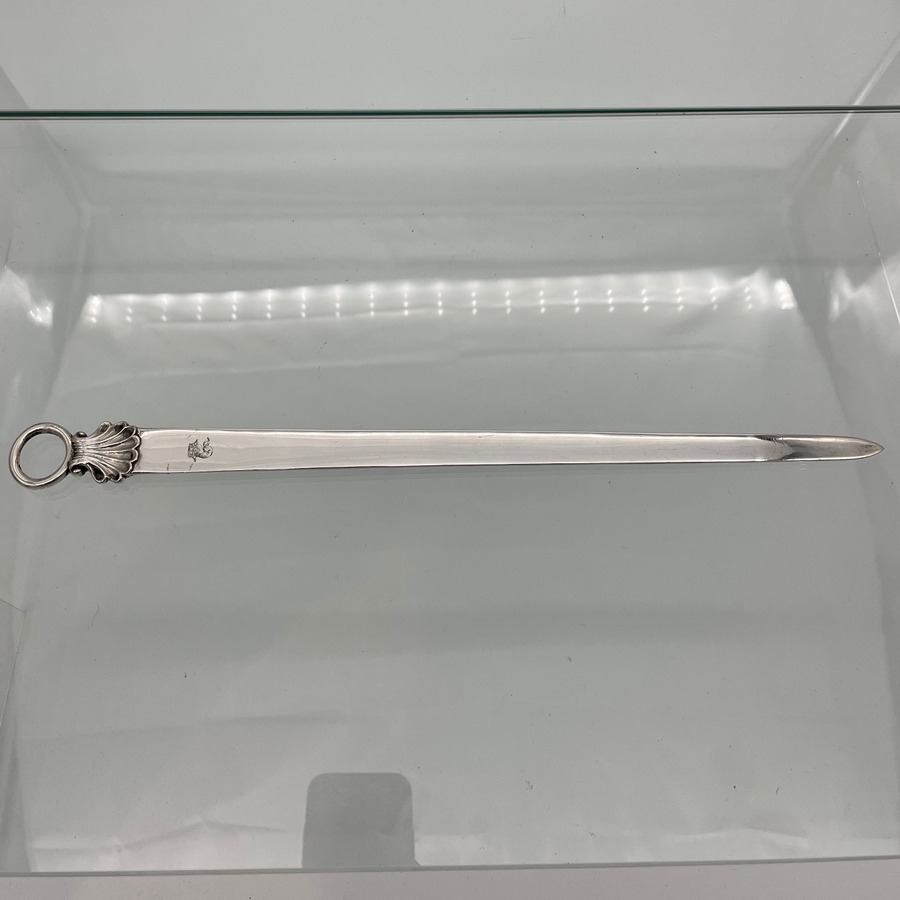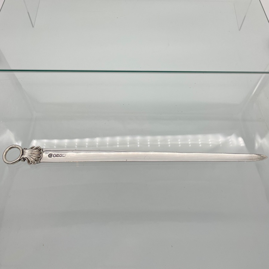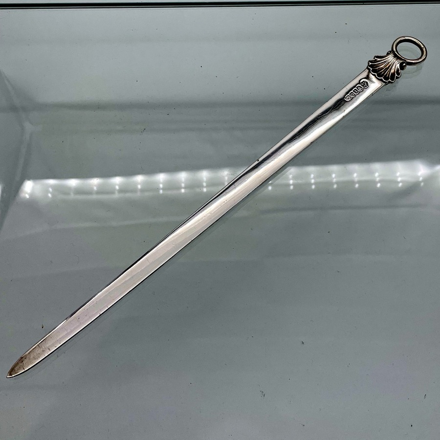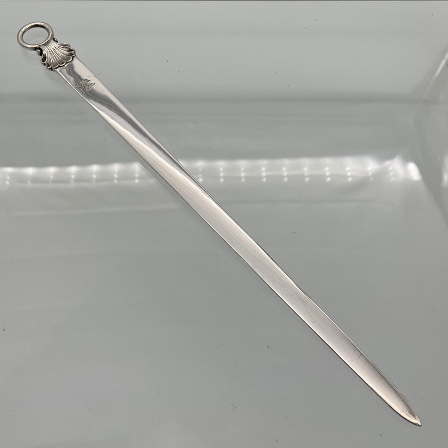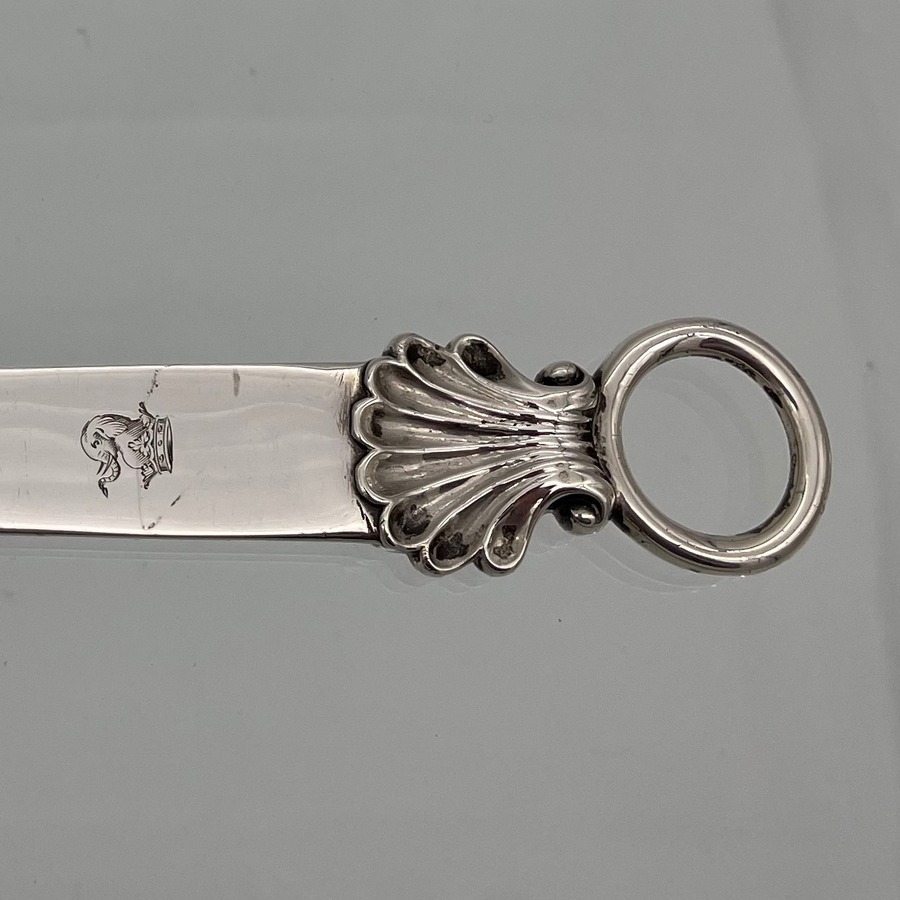 A large and truly impressive Georgian silver meat skewer decorated with a beautiful cast shell ring handle and sumptuous plain formed blade. Â There is a delightful contemporary crest for importance.